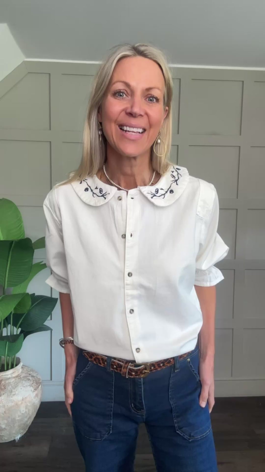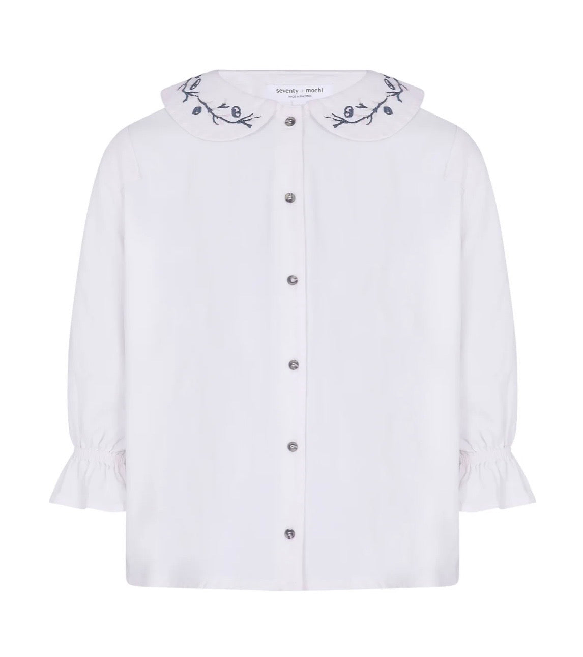 This is a beautiful blouse in a mid weight, soft, organic cotton fabric has a Peter Pan collar with pretty navy and pink embroidery detail. It has button fastenings with cropped sleeves and elasticated cuffs.