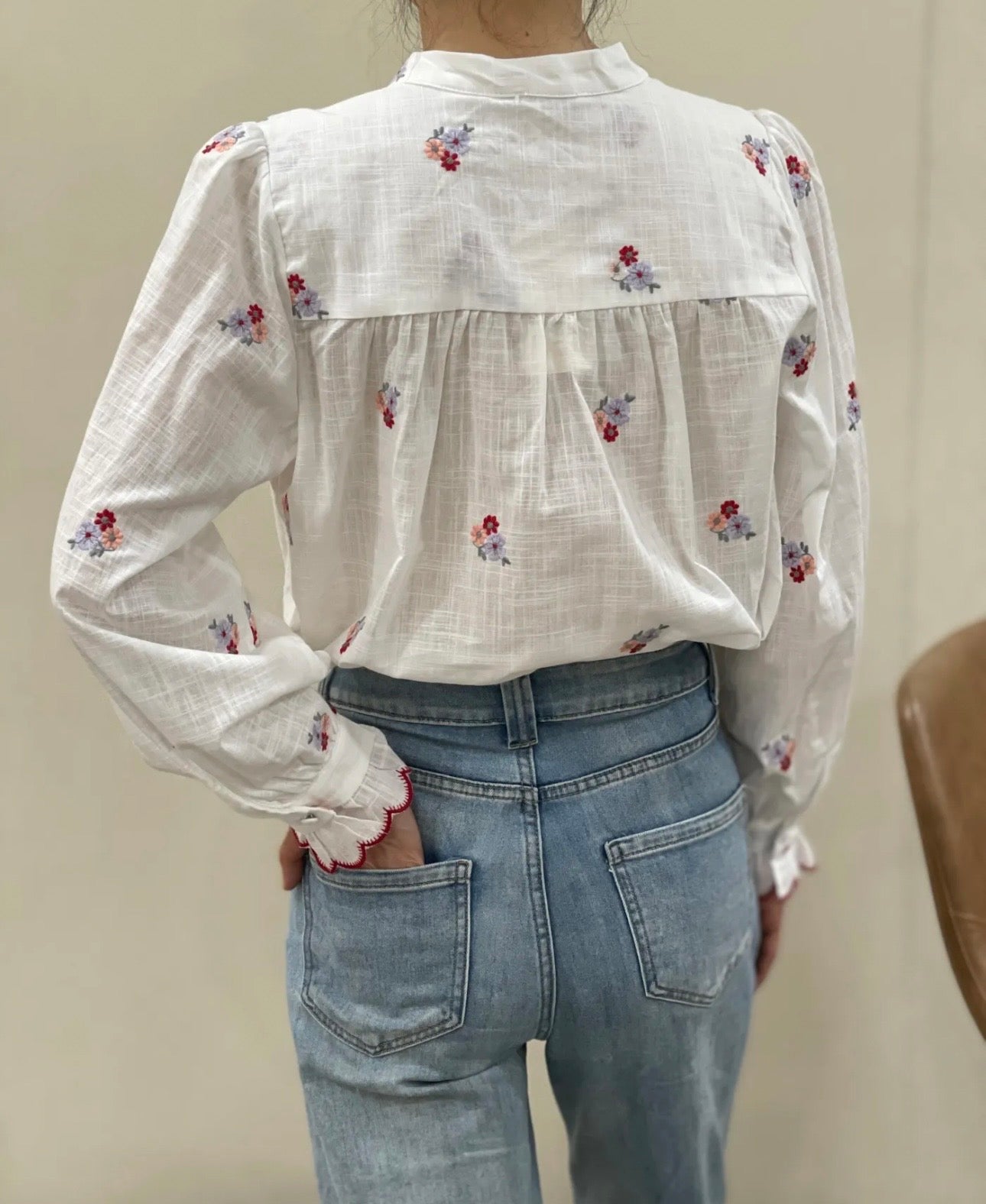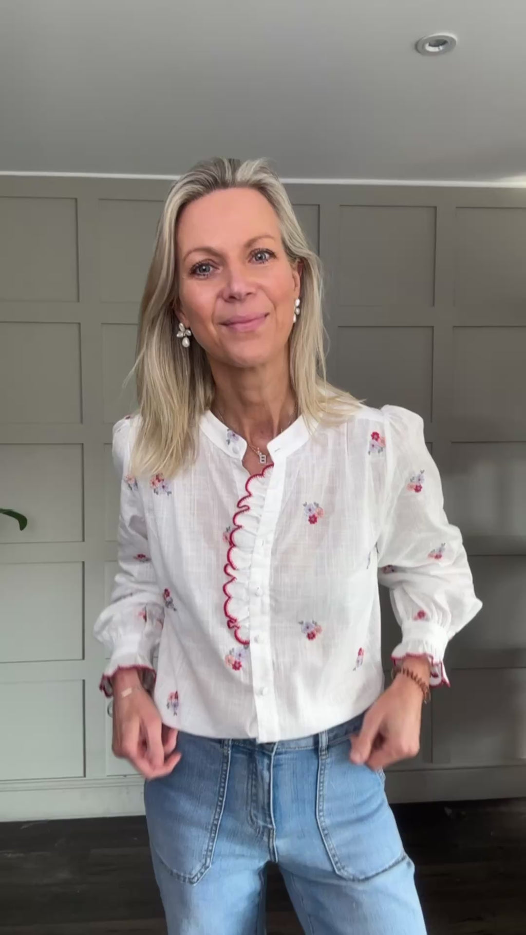 Feminine cotton blouse featuring floral embroidery detail and scalloped ruffle along side the buttons. Button-front closure, full-length sleeves with button cuffs and scalloped edging, and a curved hem. Versatile enough for casual wear with denim or smart styling with tailored pieces.