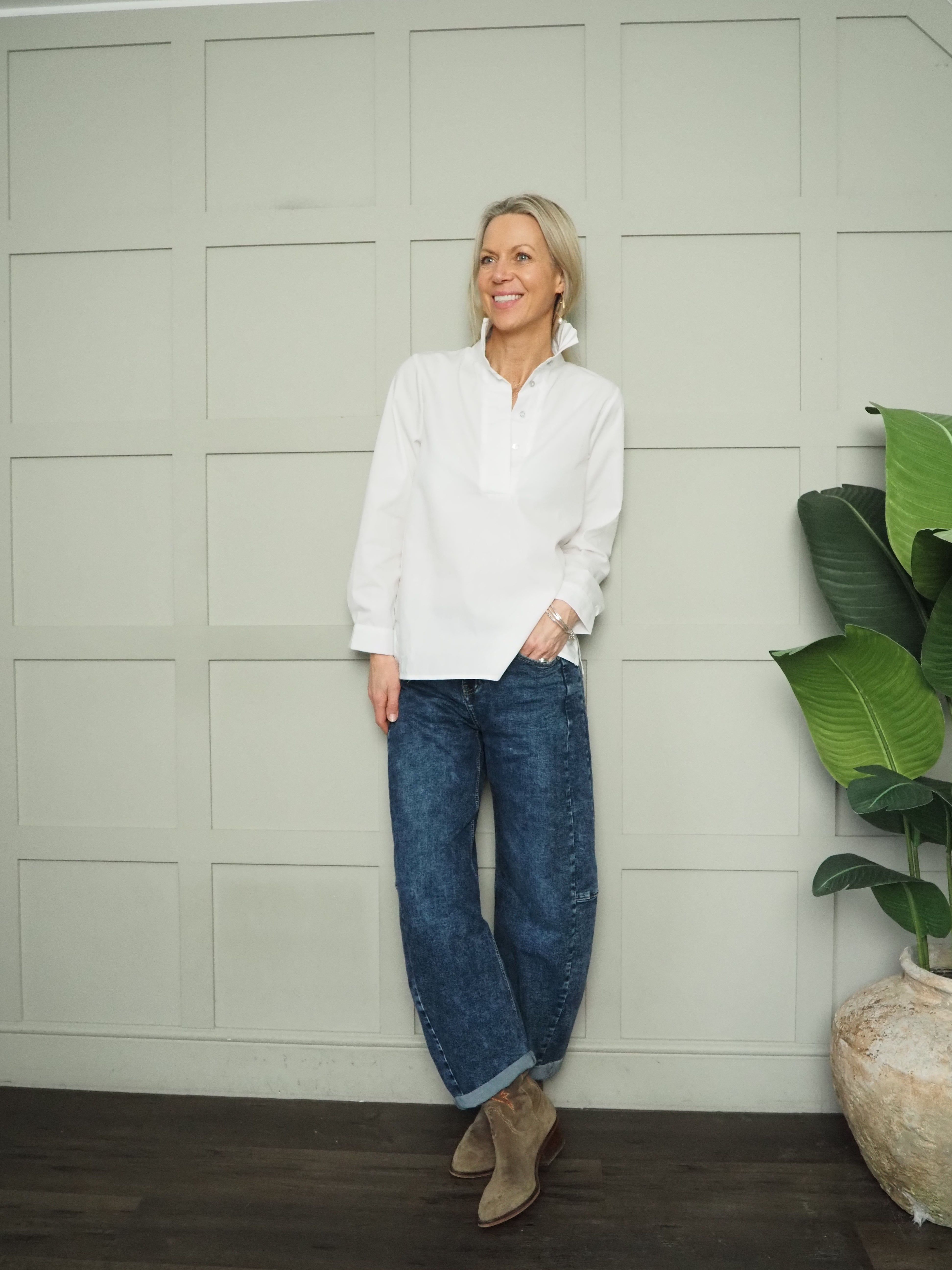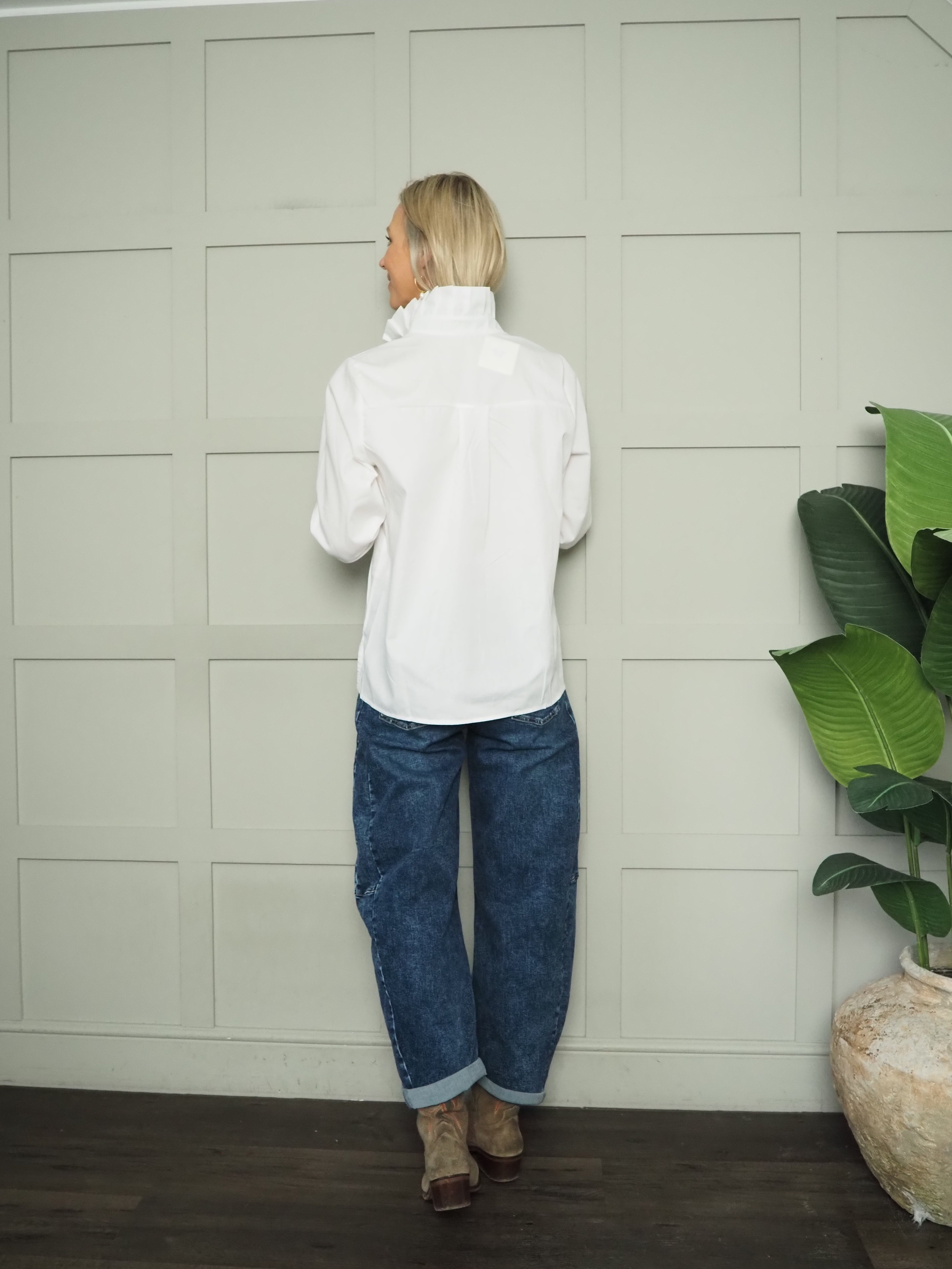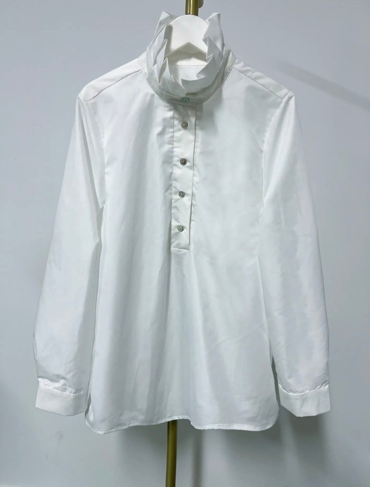 This blouse is a season-less piece which looks great worn casually with jeans or styled with tailored trousers for a smarter look. It has an elegant high pleated collar which looks great worn alone but is fabulous layered under a jumper or jacket with the collar exposed. It has buttons to below the bust, a box pleat at the back, full length sleeves with button cuffs and a straight hem with side splits.