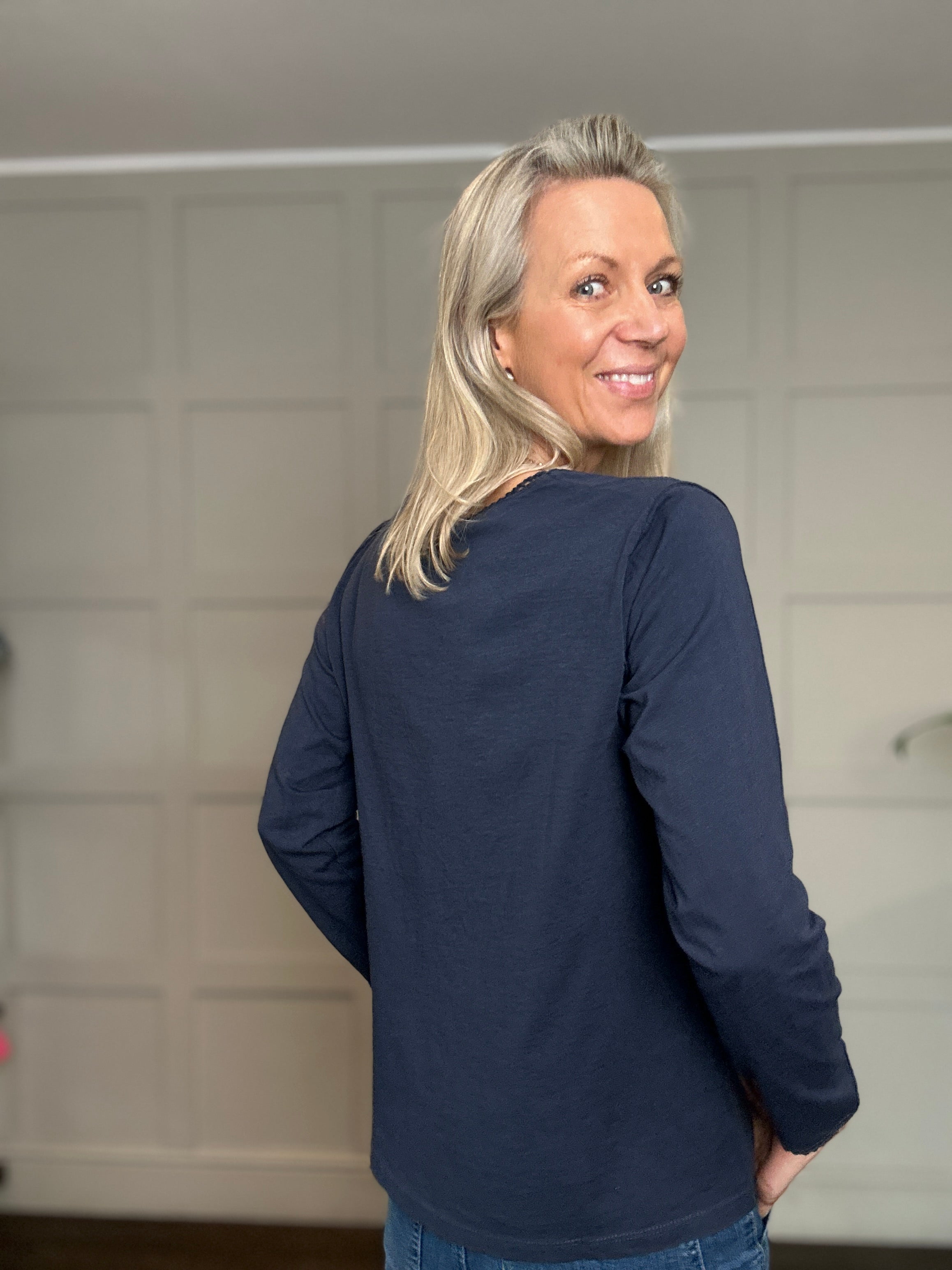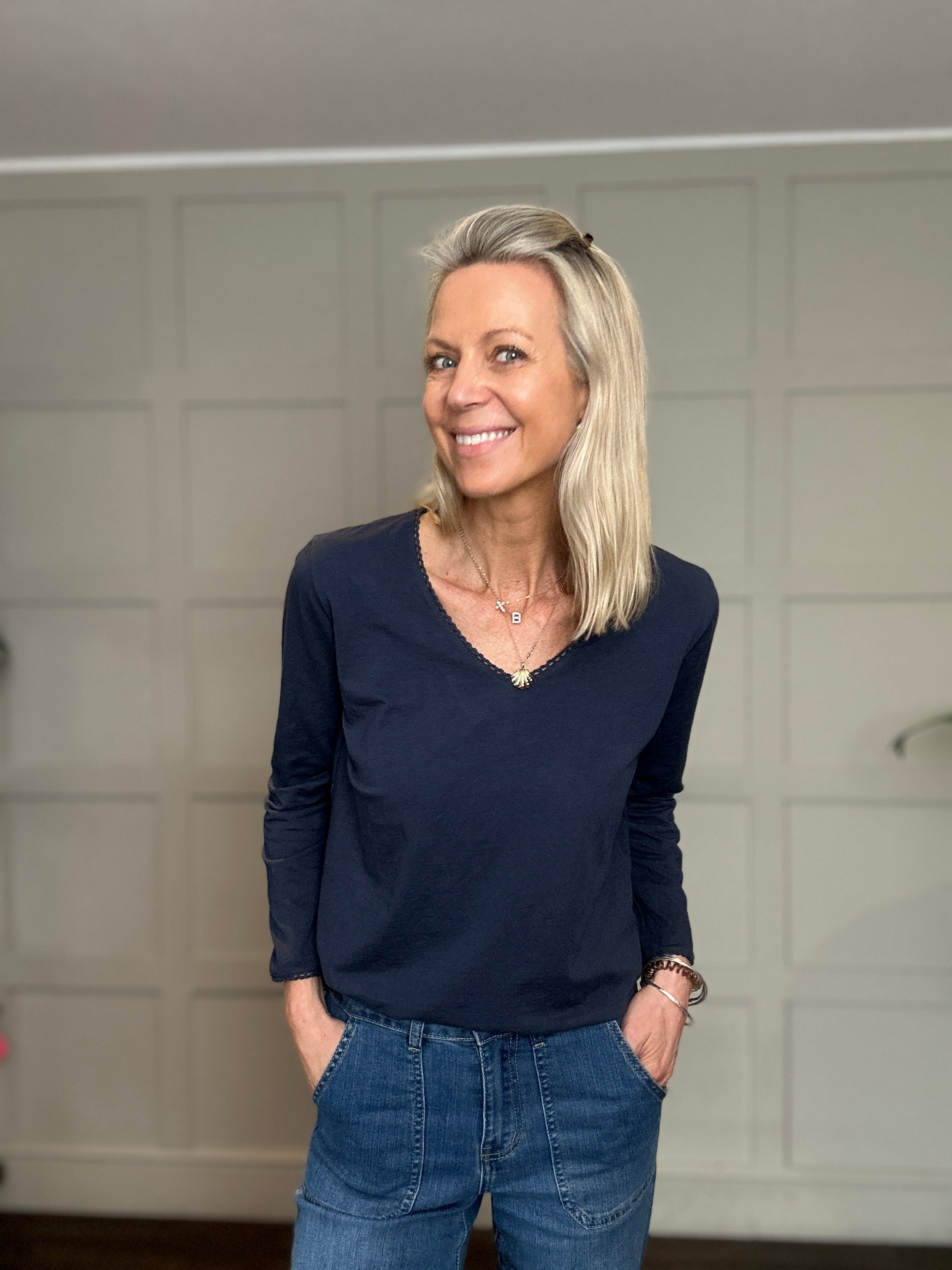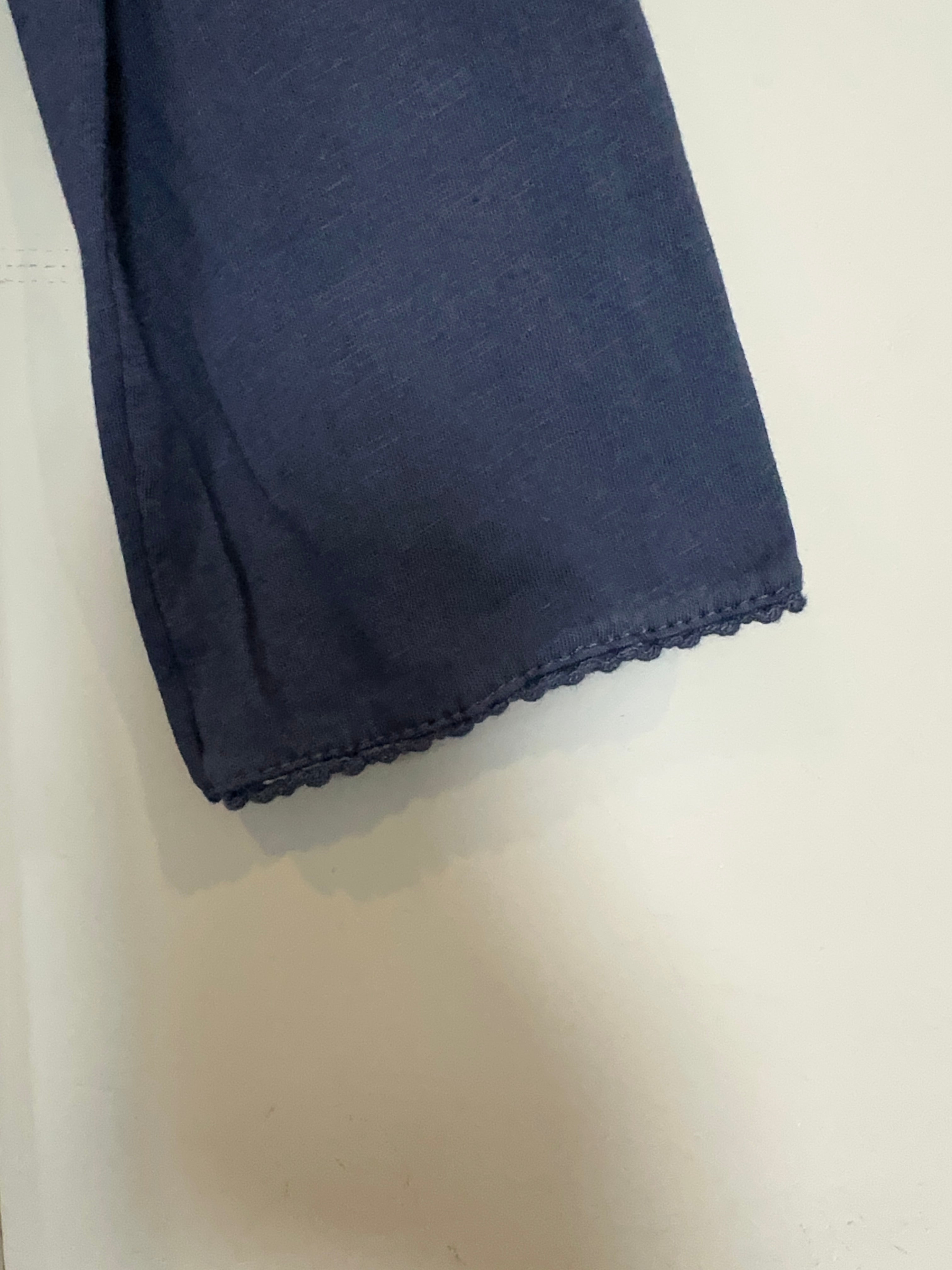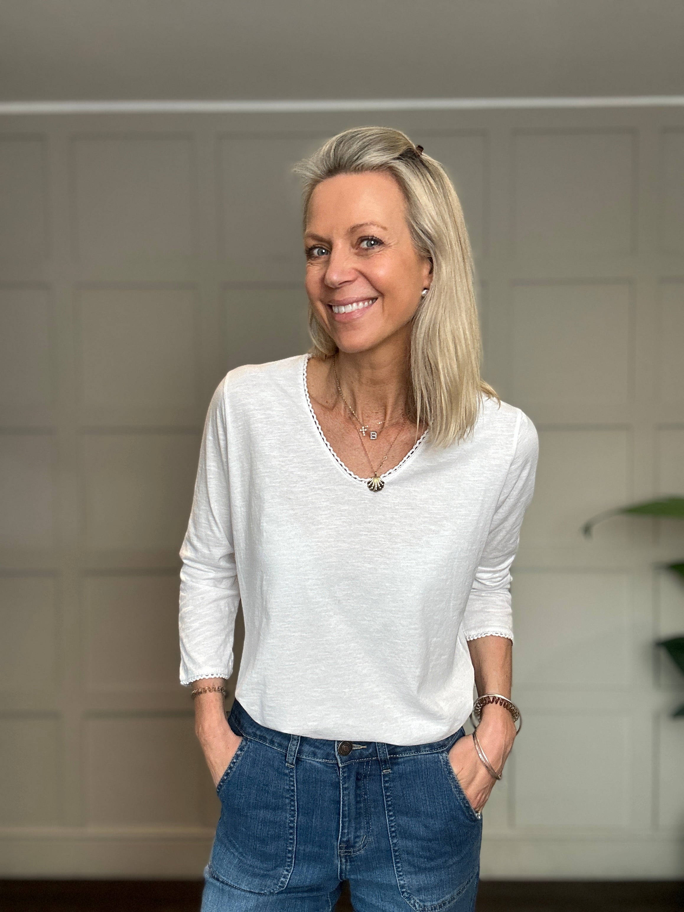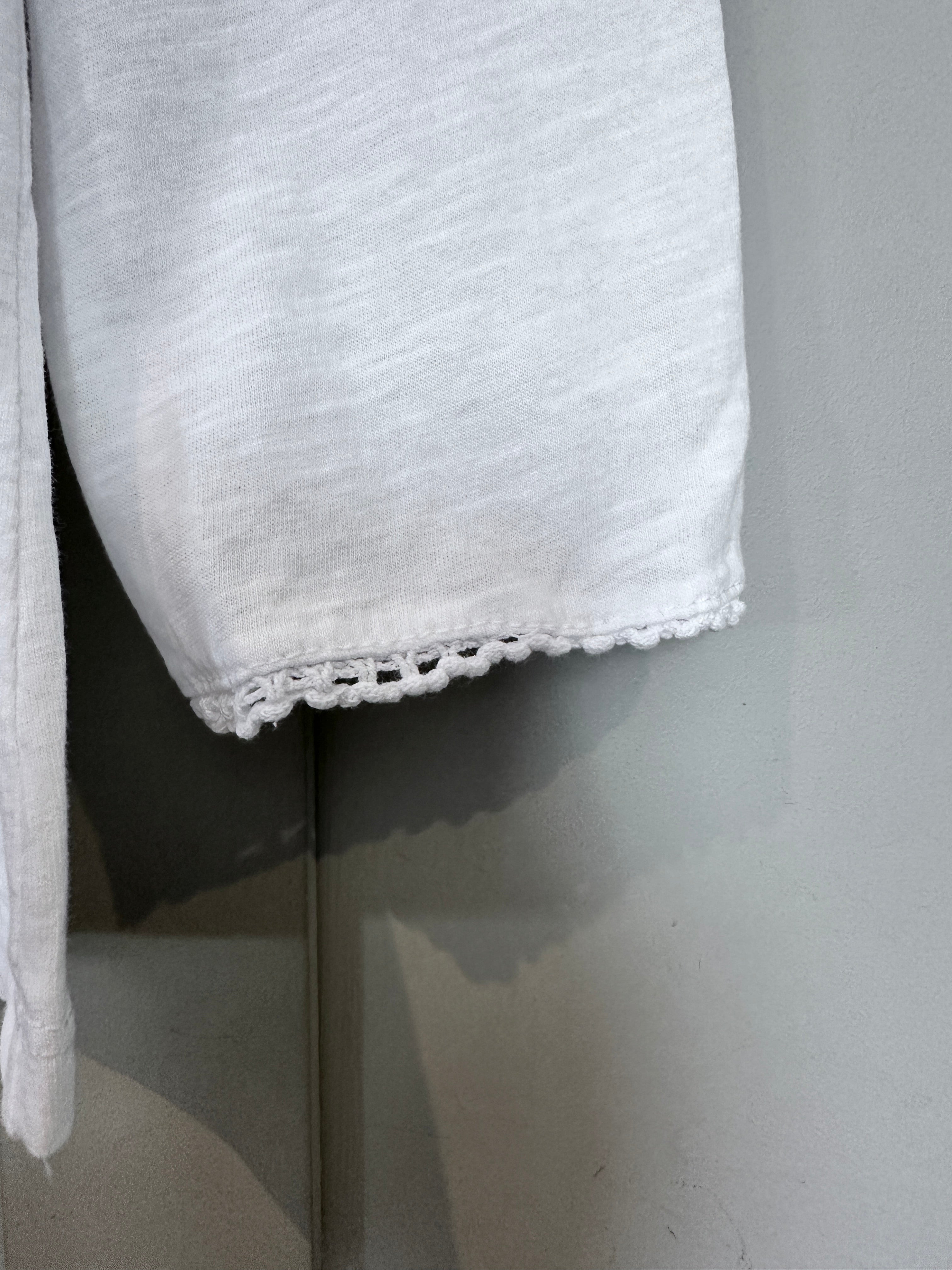 These V neck T Shirts are wardrobe staples. Perfect for wearing alone or layering under knitwear, jackets or blazers. They have pretty crochet detailing on the edge of the cuffs and neckline.