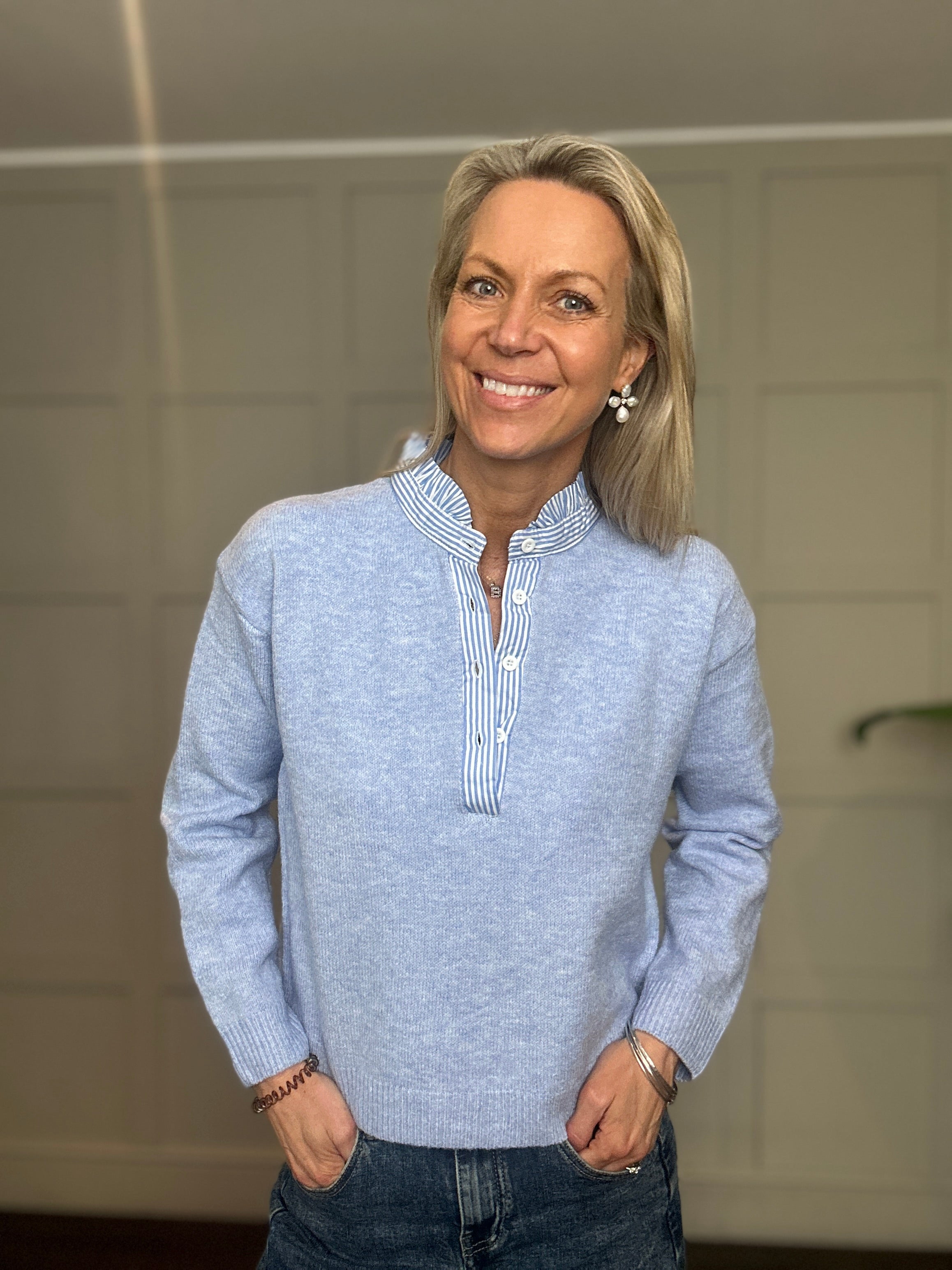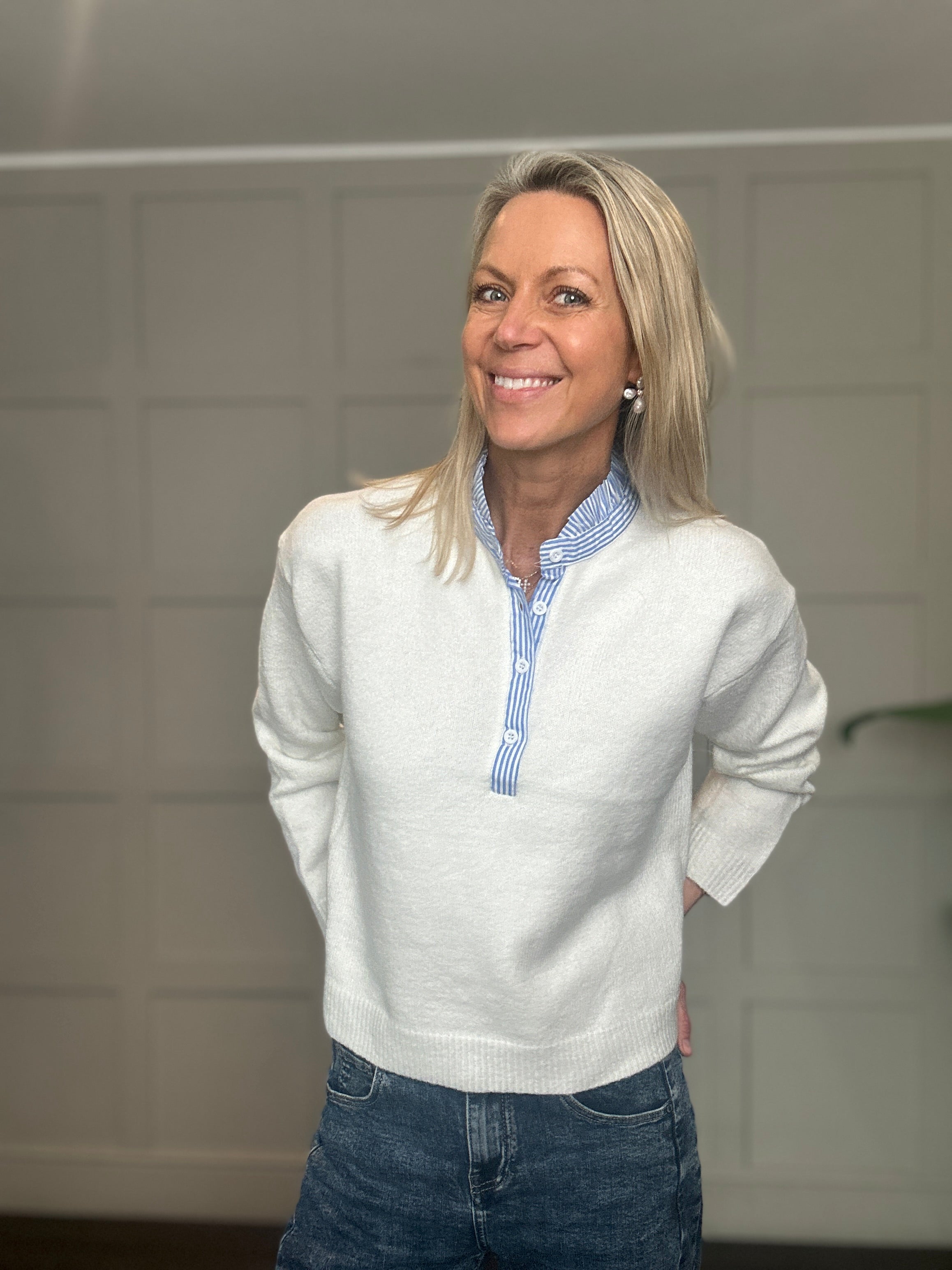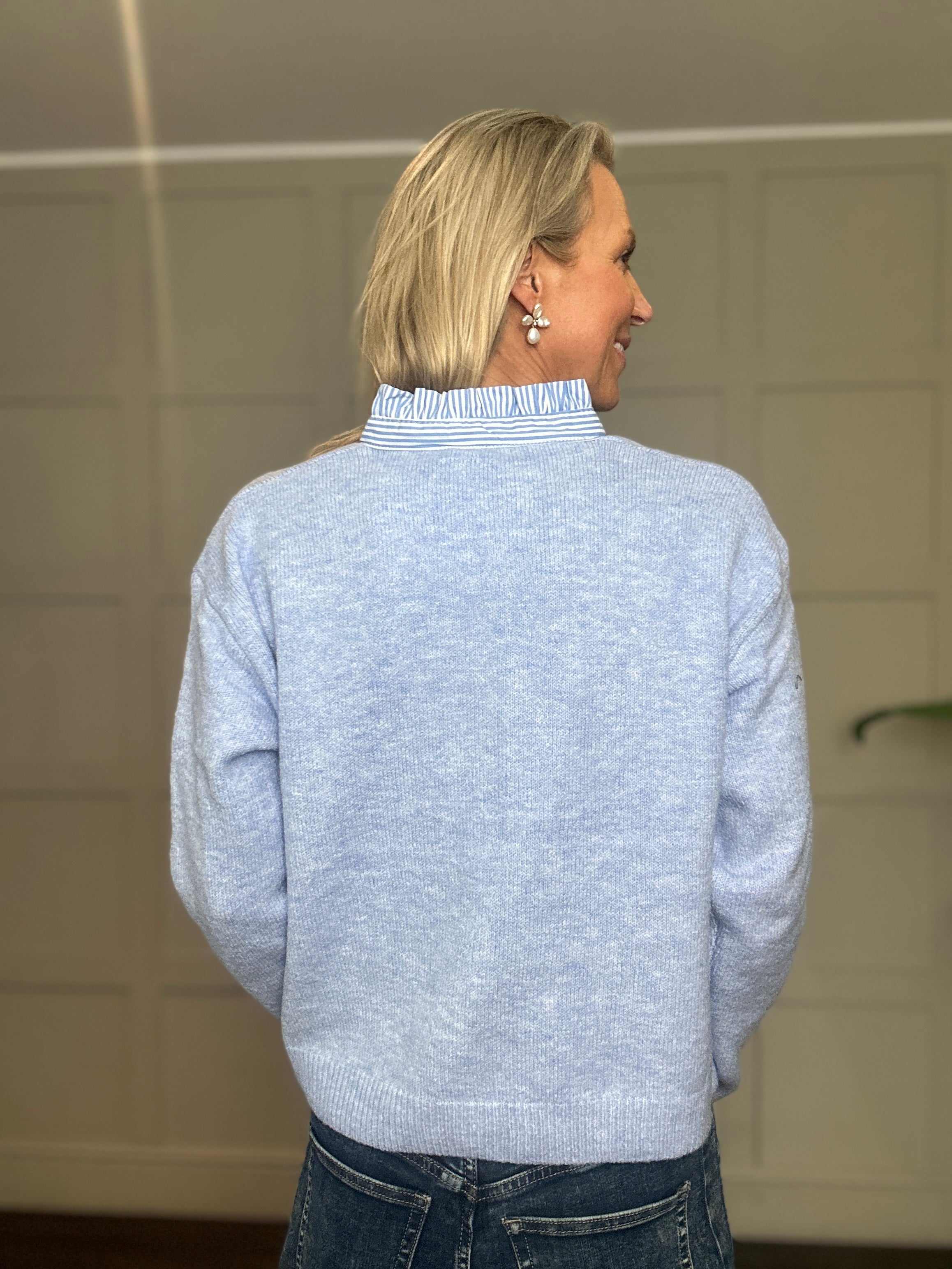 This jumper is such a fabulous seasonless style. It looks great worn with jeans, trousers or a skirt. It is soft and comfortable to wear and has blue stripe detailing on the collar and along side the buttons.