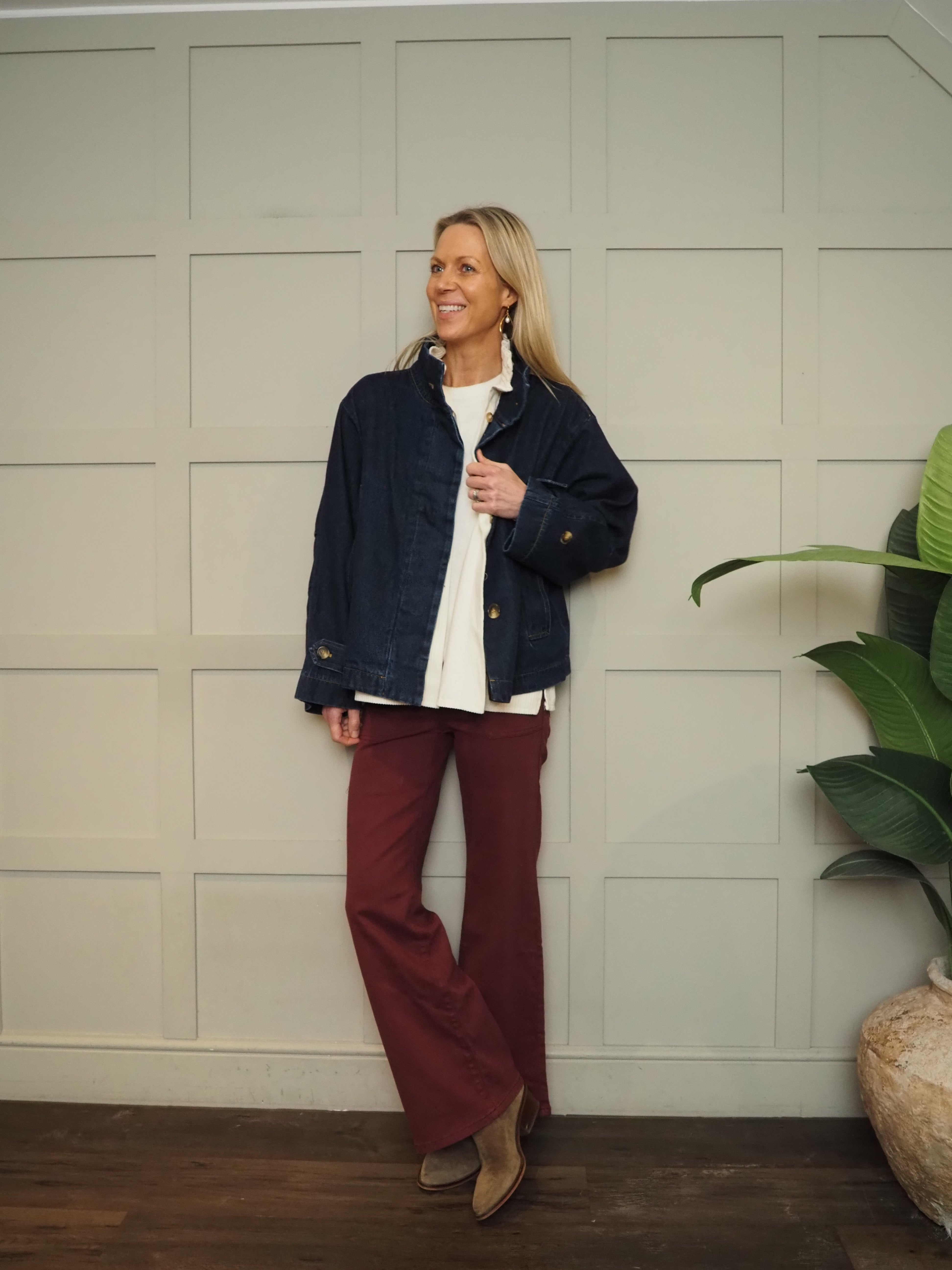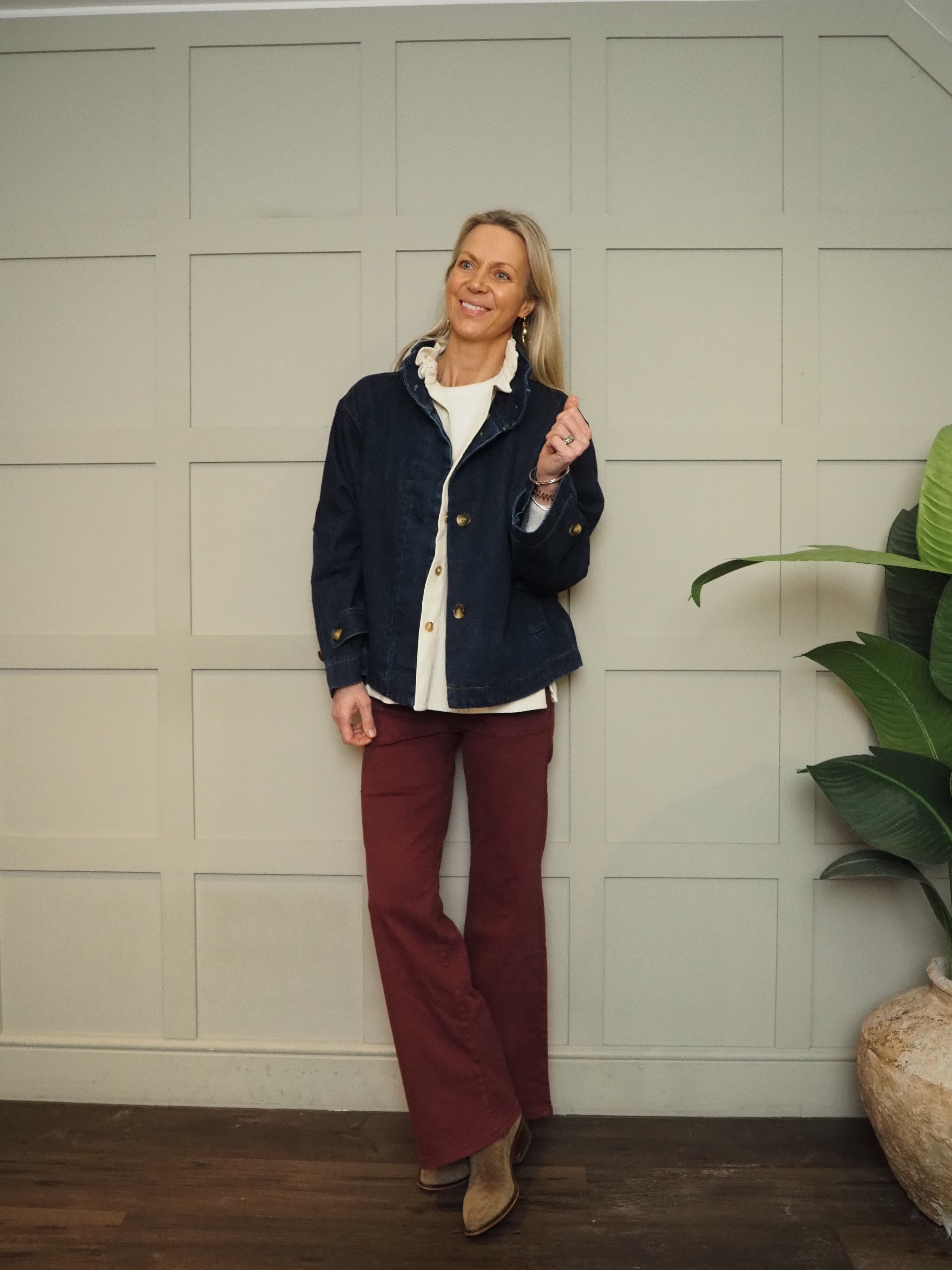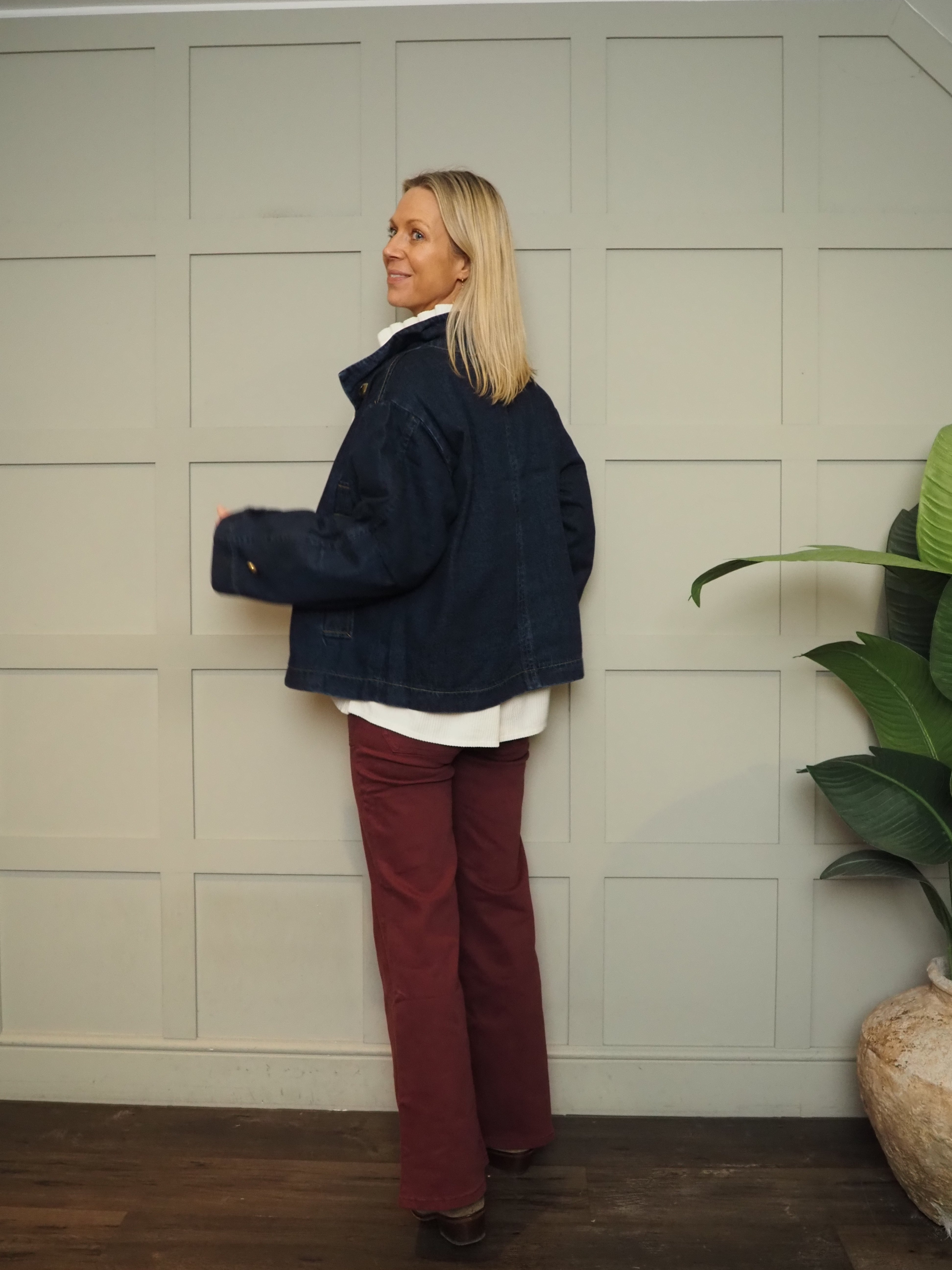 A versatile dark denim jacket with a distinctive funnel neck and swing silhouette. Features full-length sleeves that can be turned up, button fastenings, generous side pockets, and pleated sleeve detailing. Layer it over knitwear for winter or pair with a tee for summer—an adaptable piece for any season.