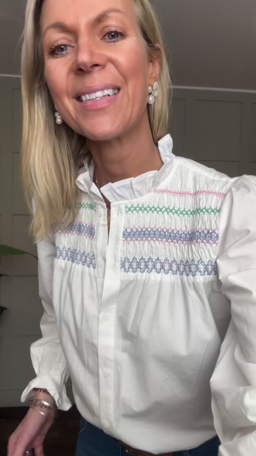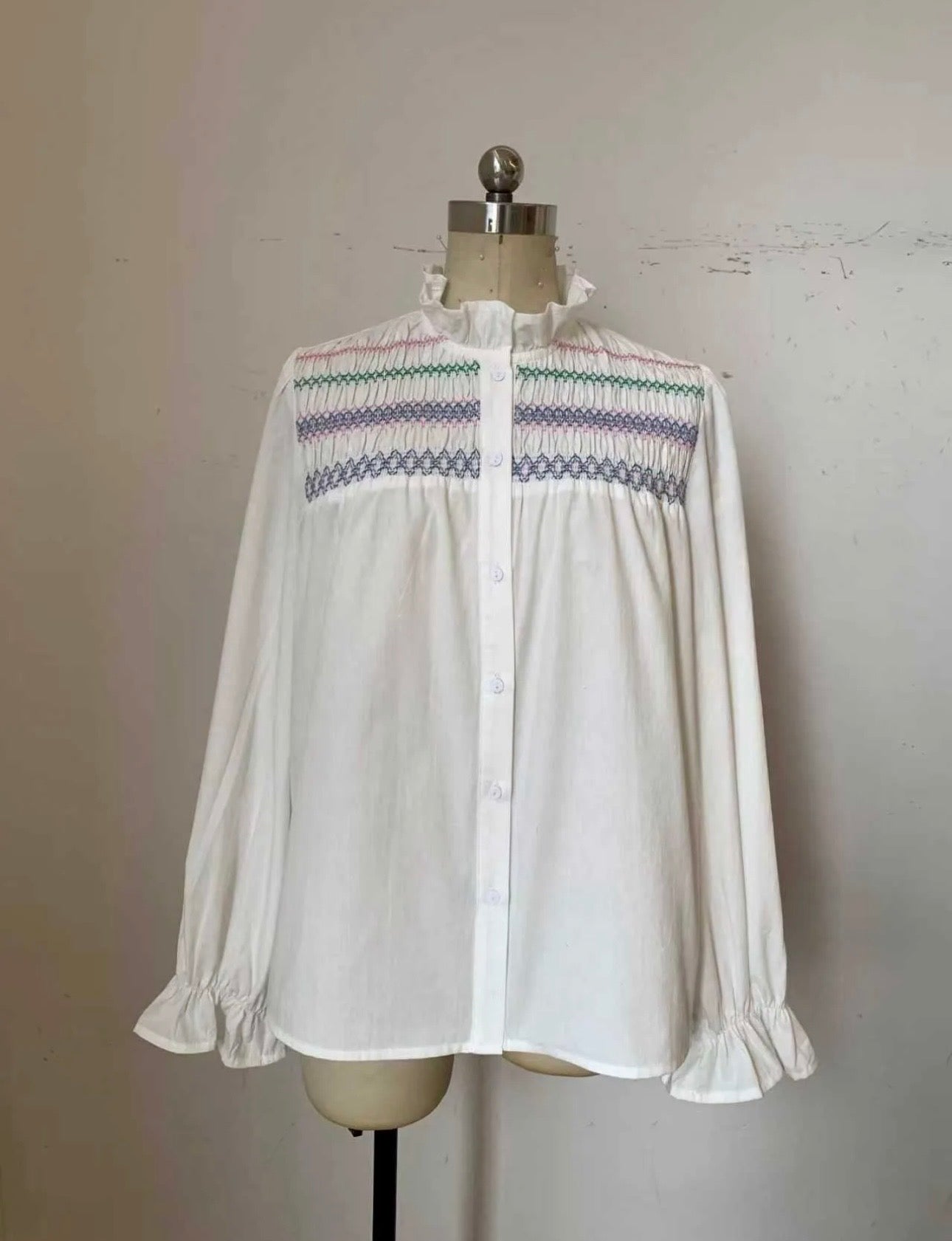 Elegant white blouse featuring delicate smocking across the chest and a charming ruffle collar. Button front with elasticated cuffs for comfortable wear. Versatile enough for casual styling with jeans or dressing up with tailored pieces.