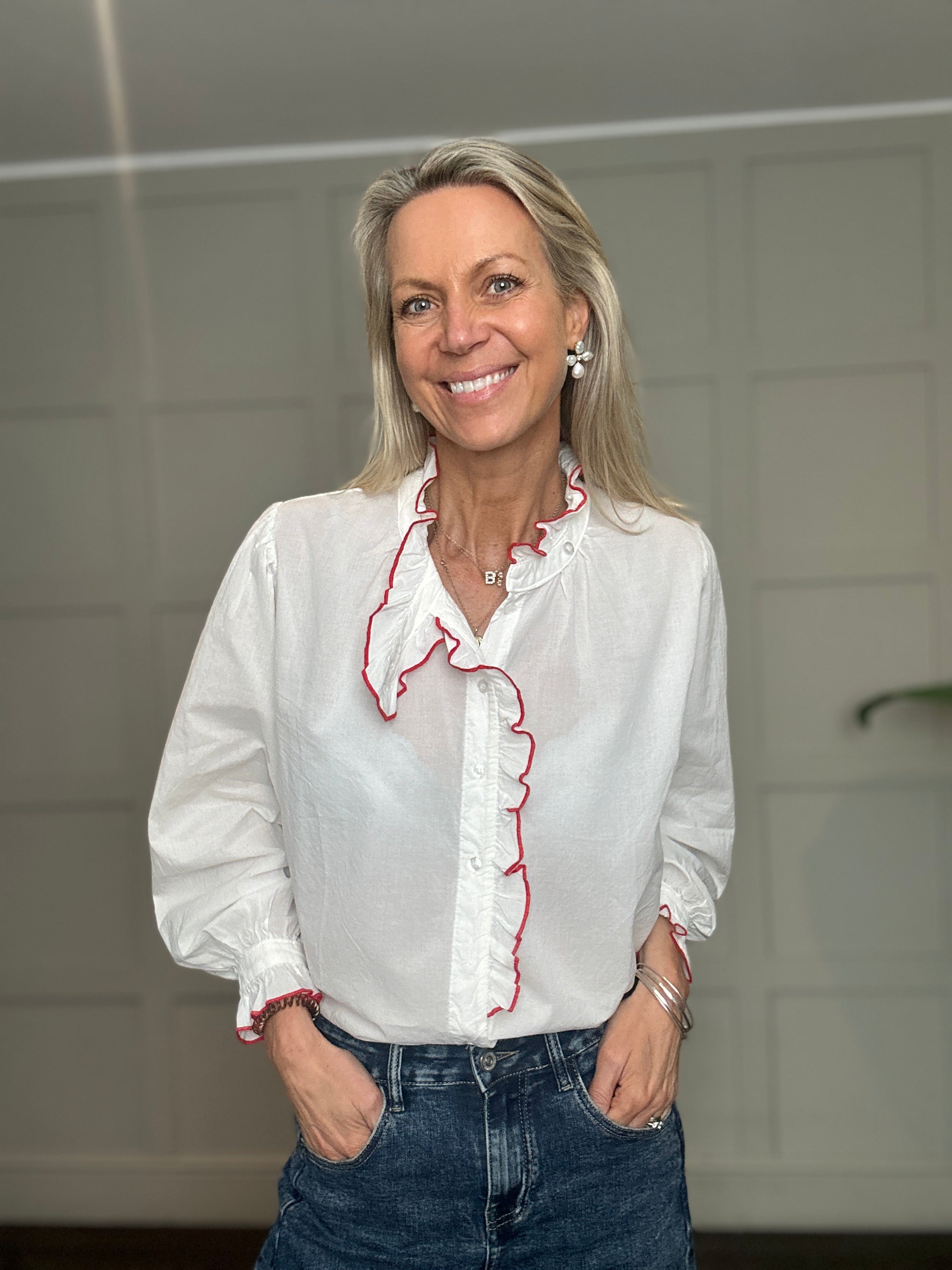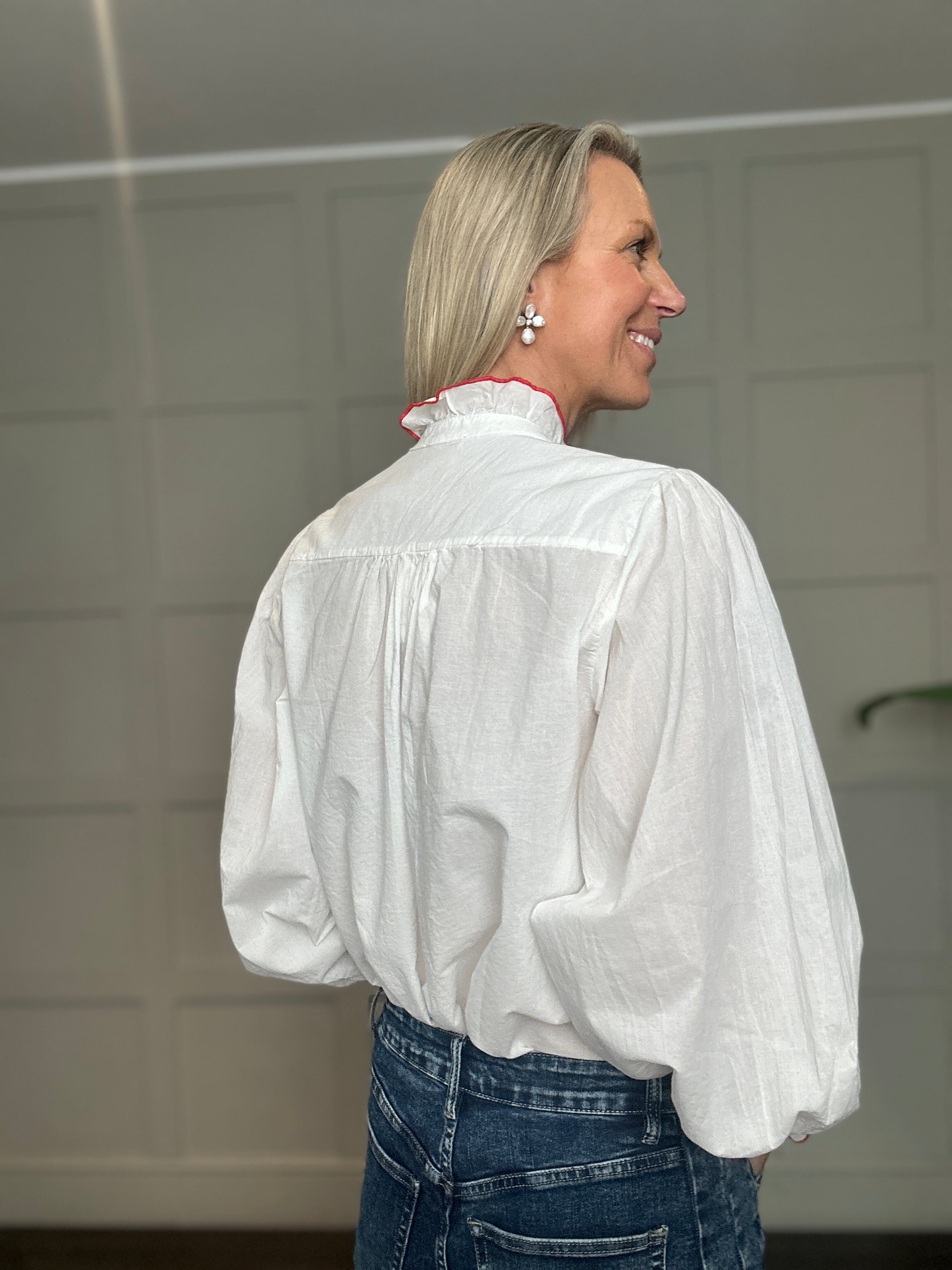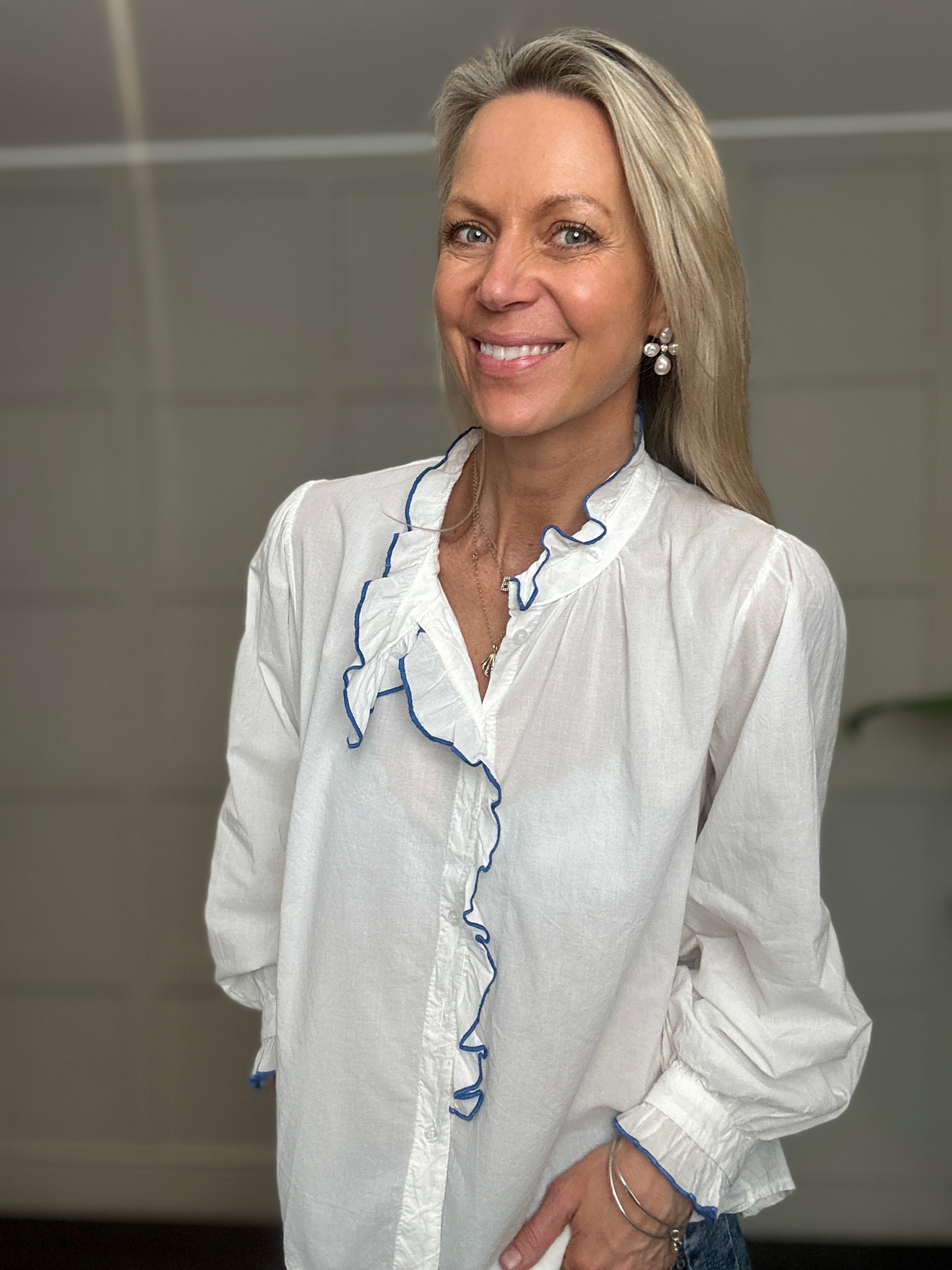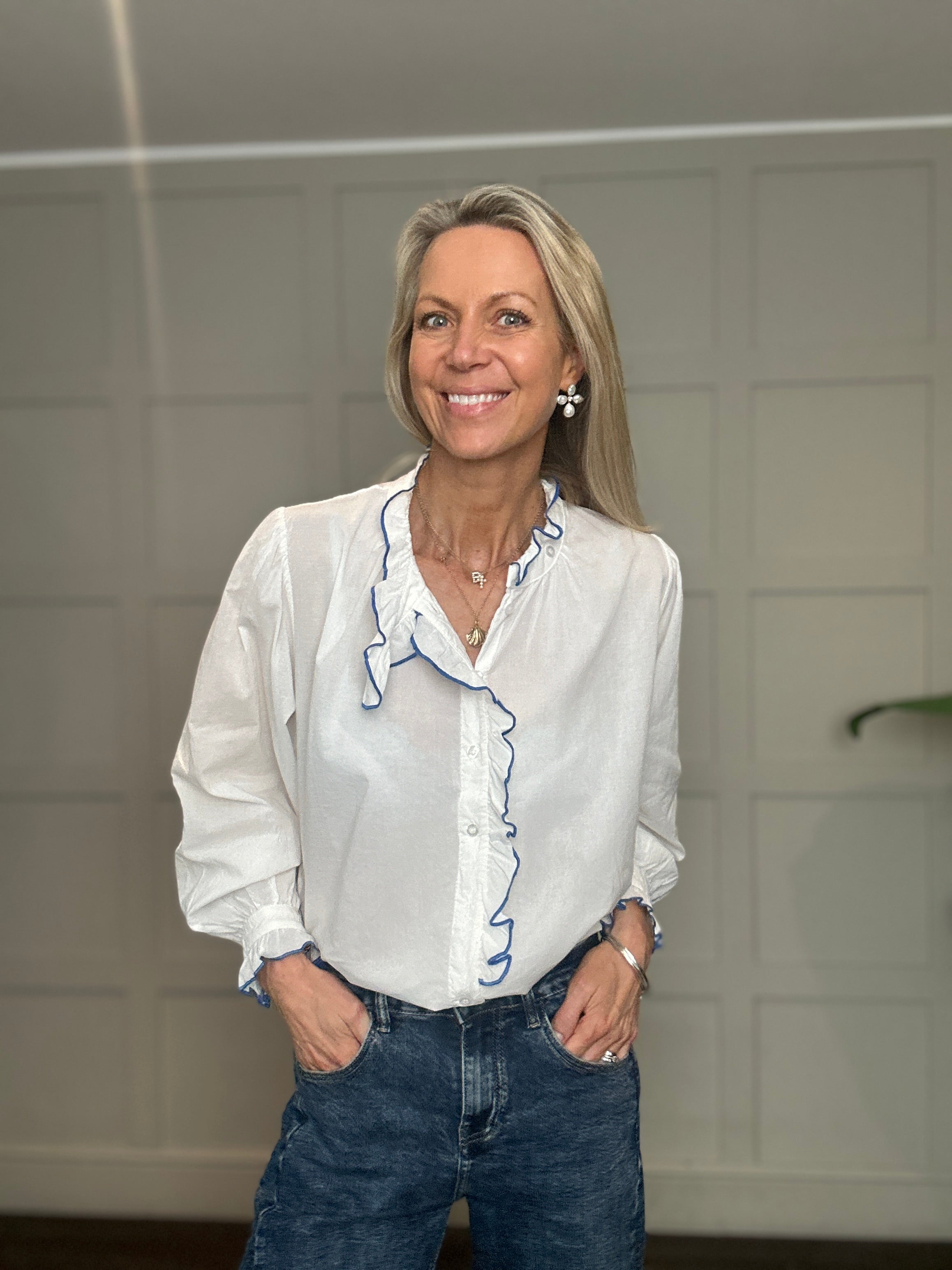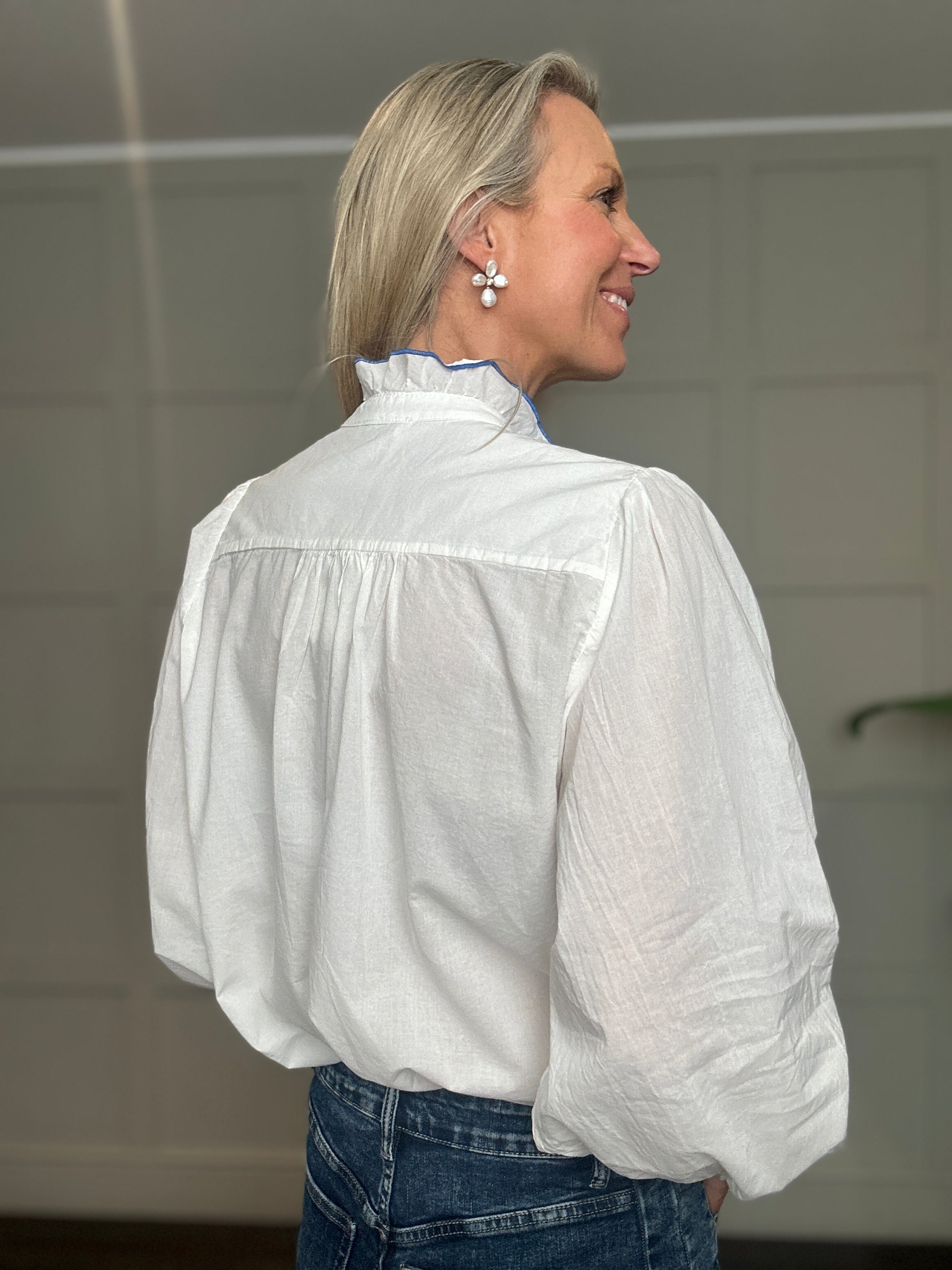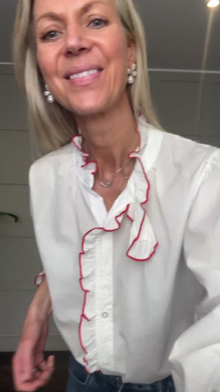 This relaxed fit cotton blouse is a wardrobe must have for the spring and summer. Featuring ruffle collar with embroidered edging, collar tab which can be buttoned up or left open, full length sleeves with button cuff and embroidered edging and ruffle detail along side the front buttons. This blouse works beautifully with jeans, shorts or smarter trousers.