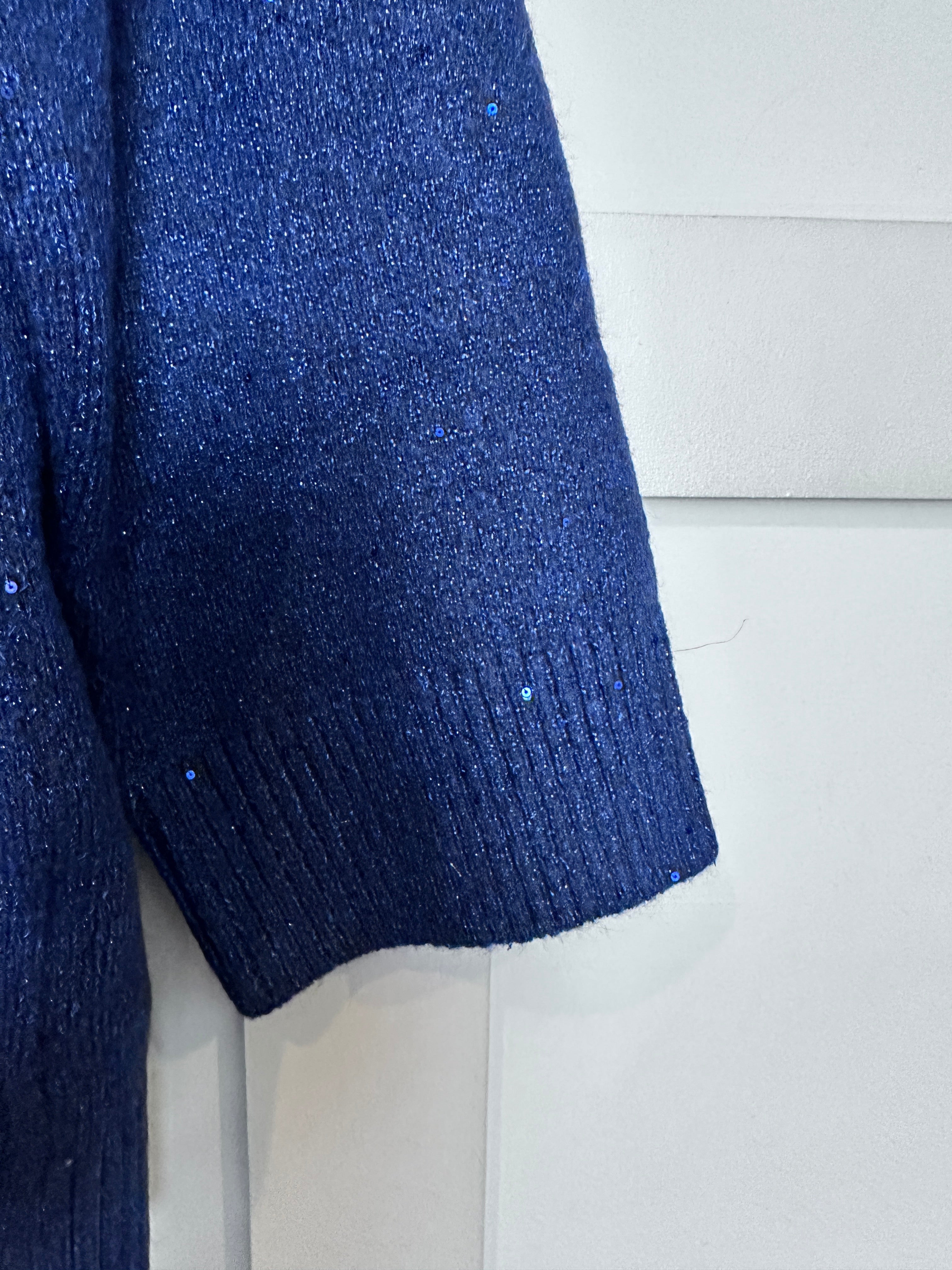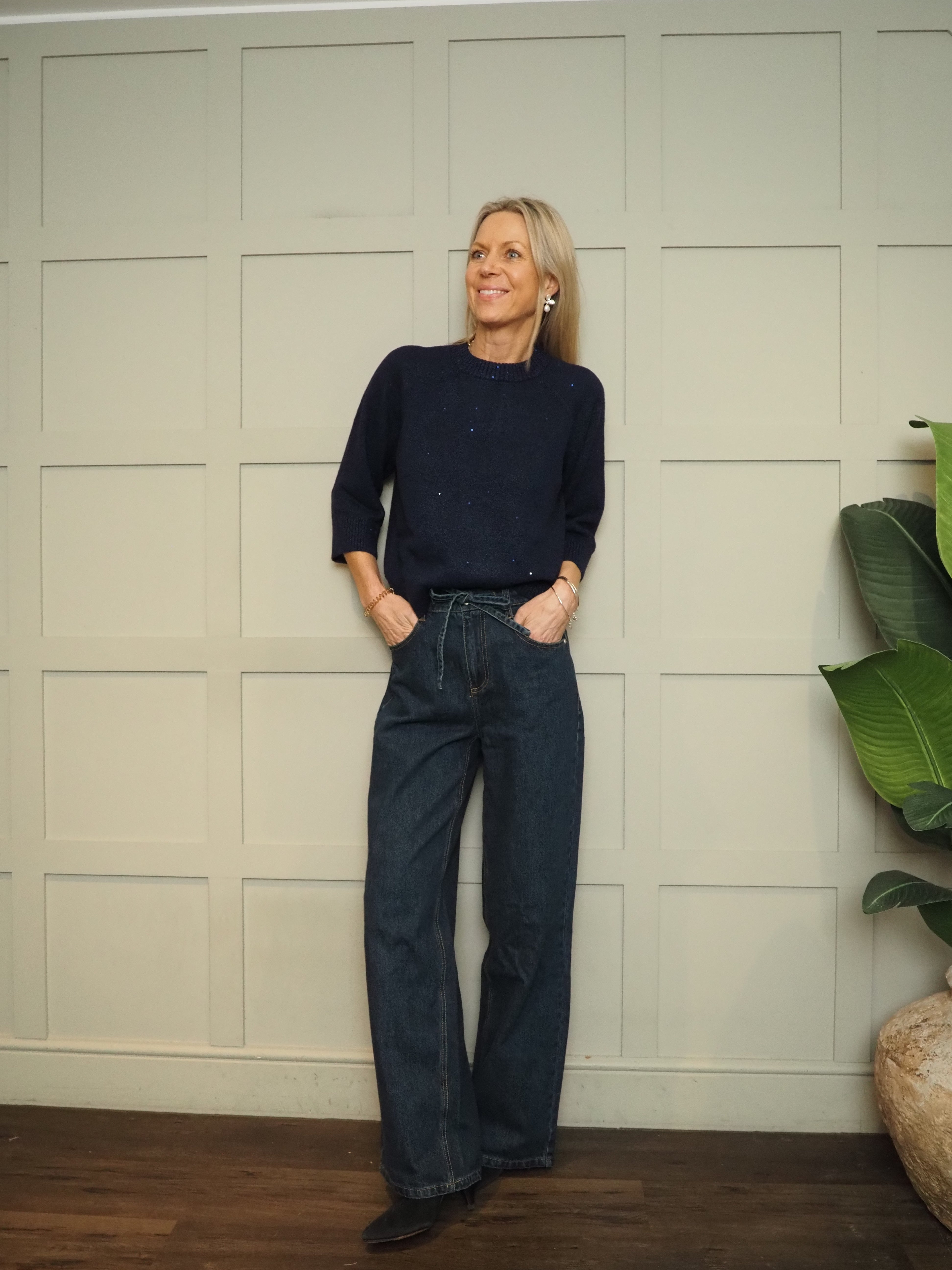 This beautiful jumper has very subtle, tiny sequins scattered over it so is a perfect piece for the festive period and beyond. It can be worn in the evening with a satin skirt or velvet trousers but works beautifully paired back with jeans for a more relaxed look. It is a relaxed fit with a crew neckline and has cropped sleeves. It can be worn untucked or tucked in.