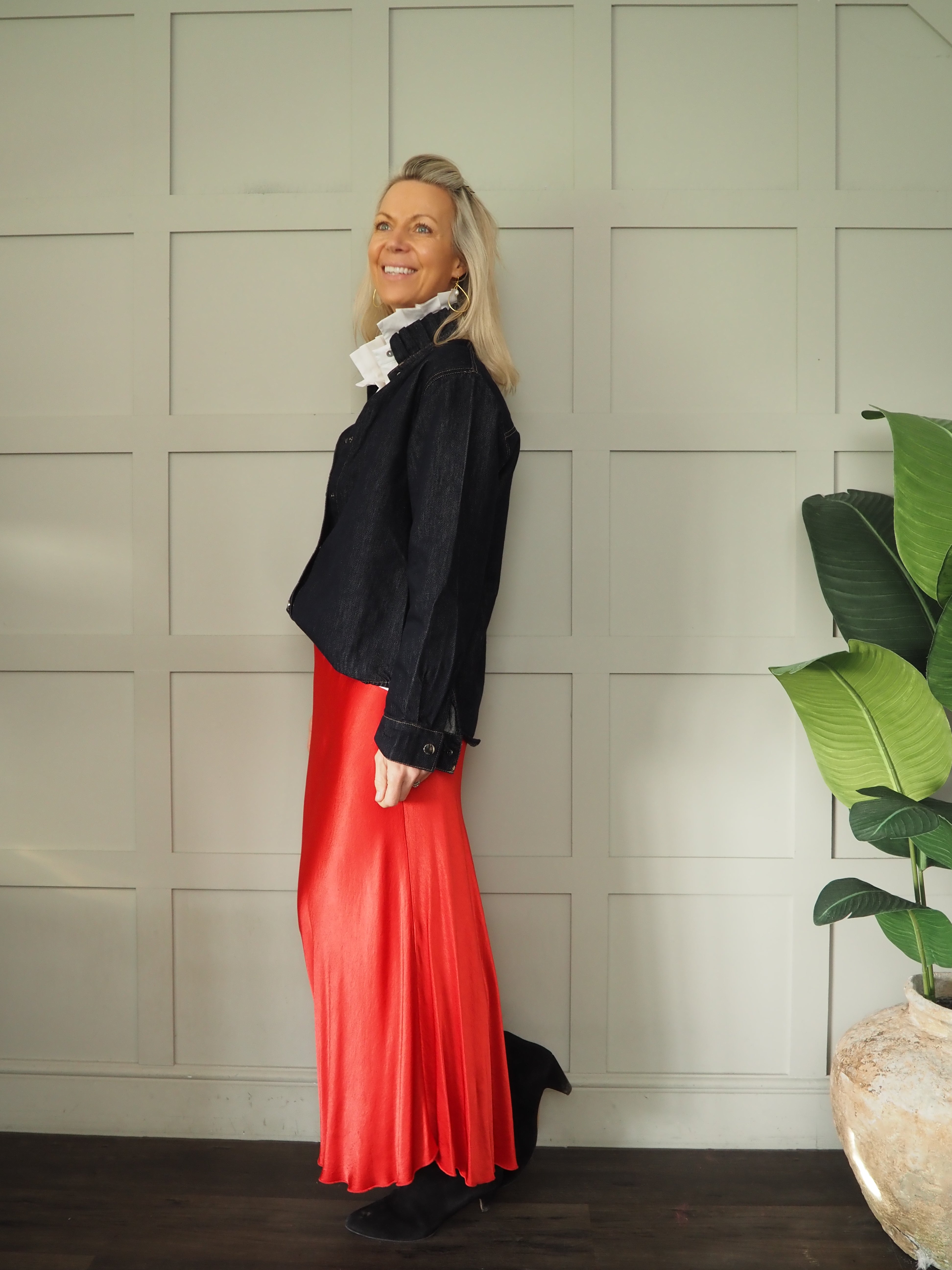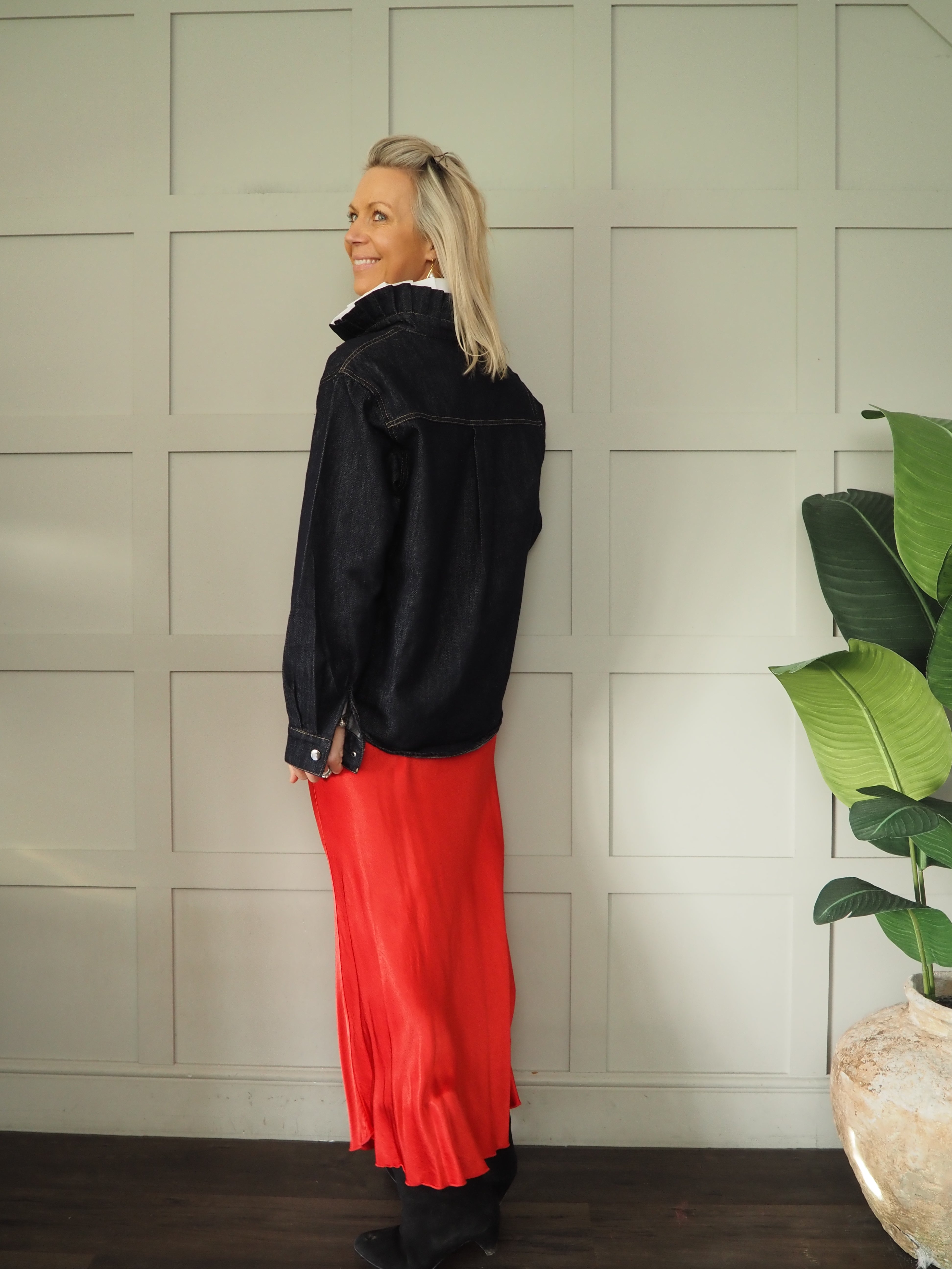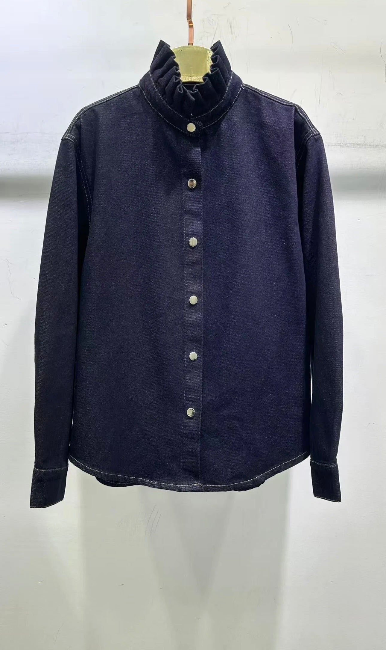 This denim shirt is a season-less piece which looks great worn as a shirt or a shacket layered over a blouse, T-shirt or knit. It has an elegant high pleated collar which adds femininity to this piece. It has popper fastenings, a box pleat across the back, full length sleeves with popper fastenings on the cuffs and a curved hem.