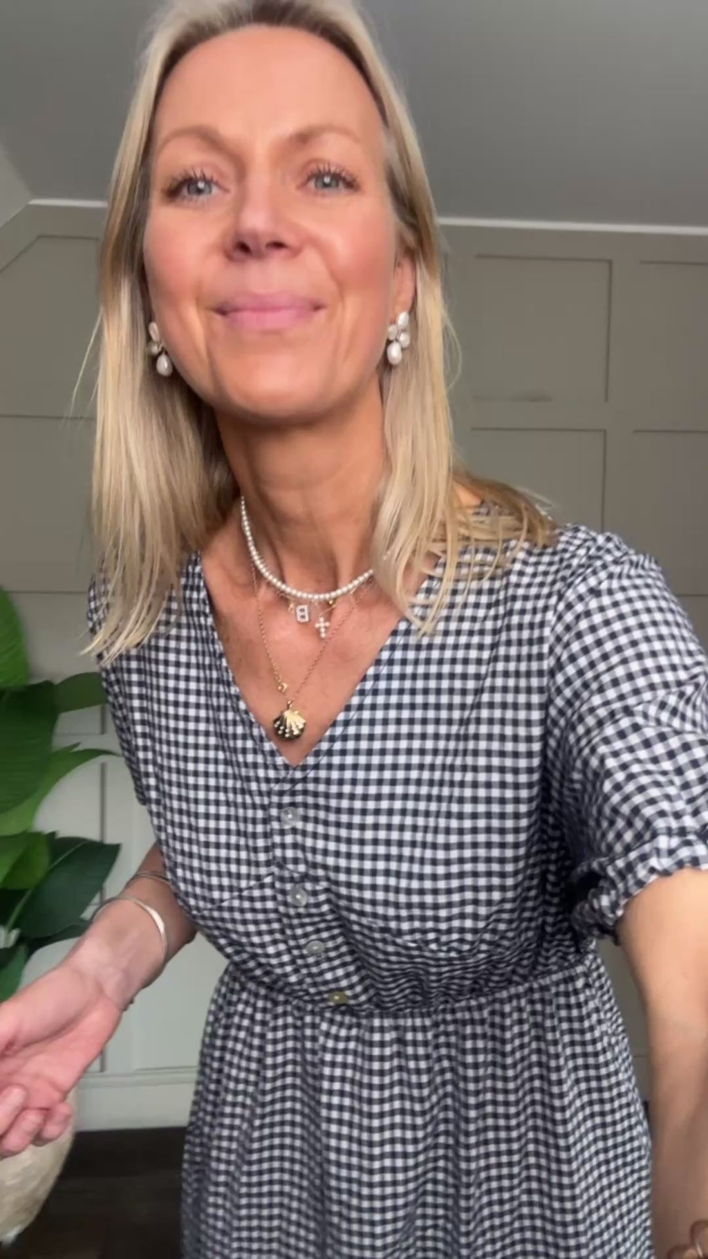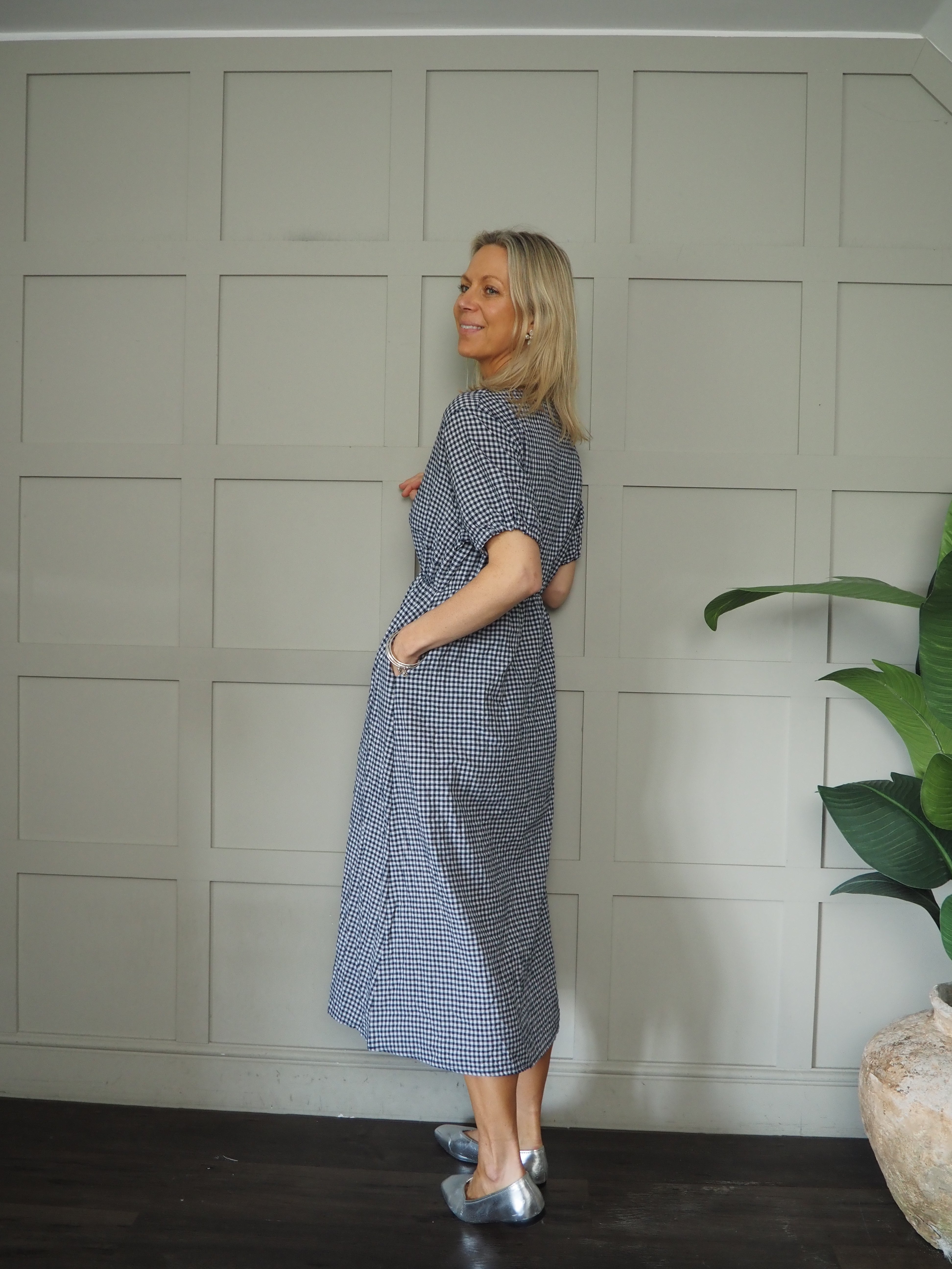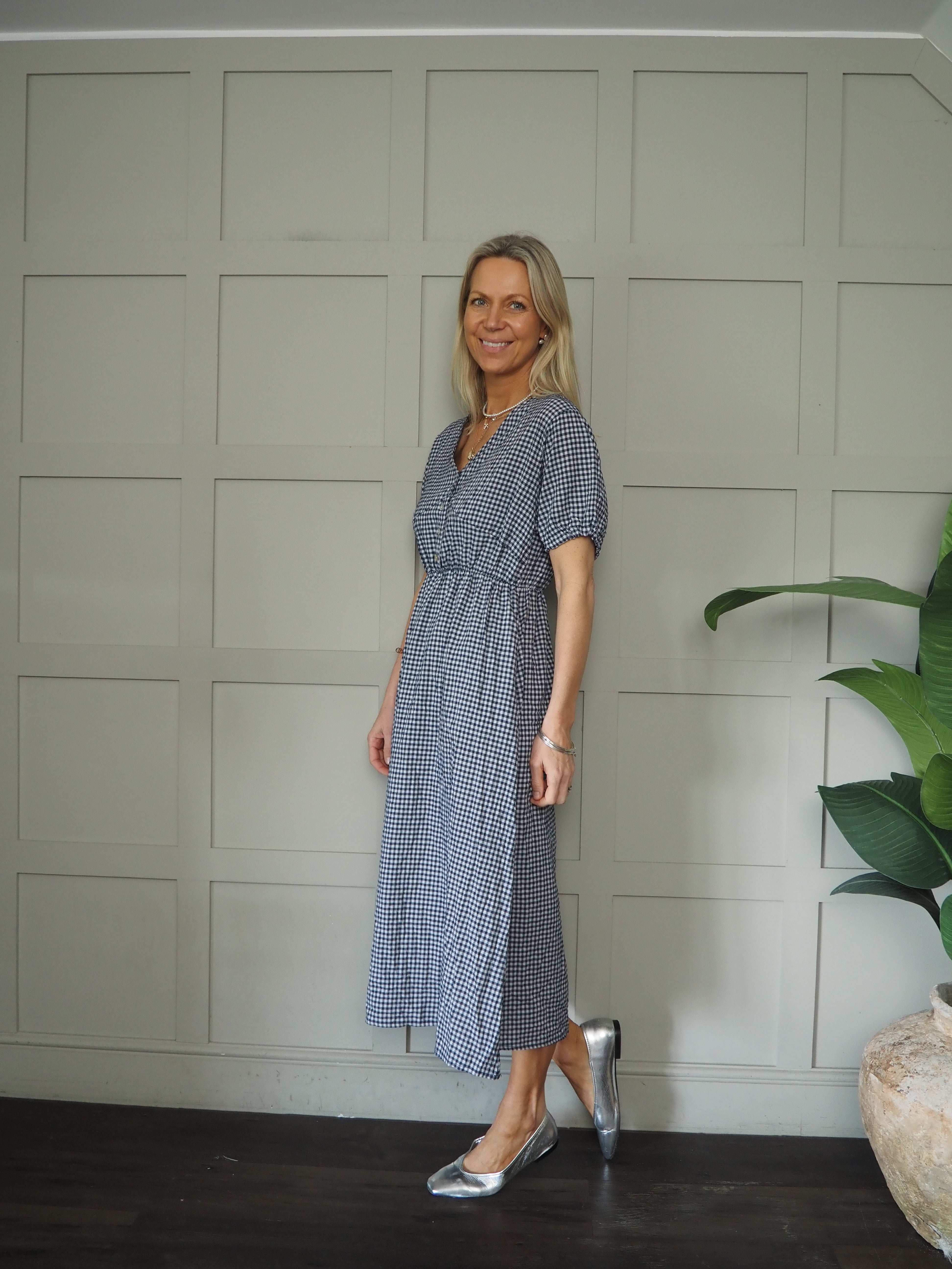 This incredibly comfortable gingham dress is a perfect piece for the spring and summer and is ideal for day to day wear. It can be styled with different footwear to give different looks. It has a V neckline, buttons to the waist, short sleeves with elasticated cuffs and an elasticated waistline. Can be worn as a midi or maxi so will work on a range of heights.