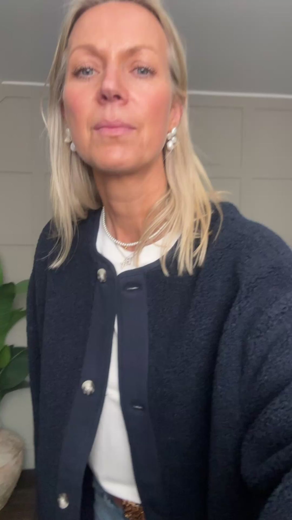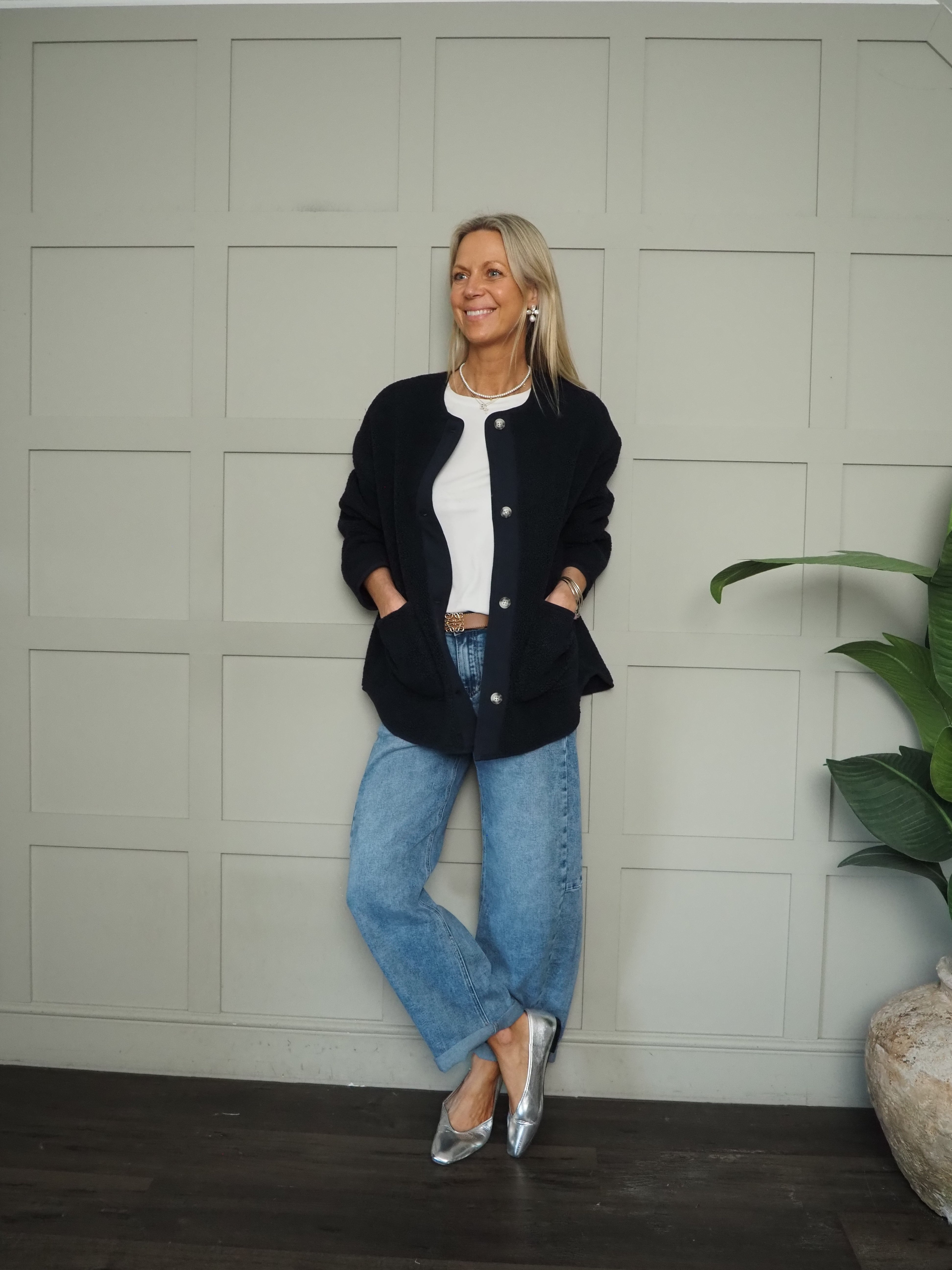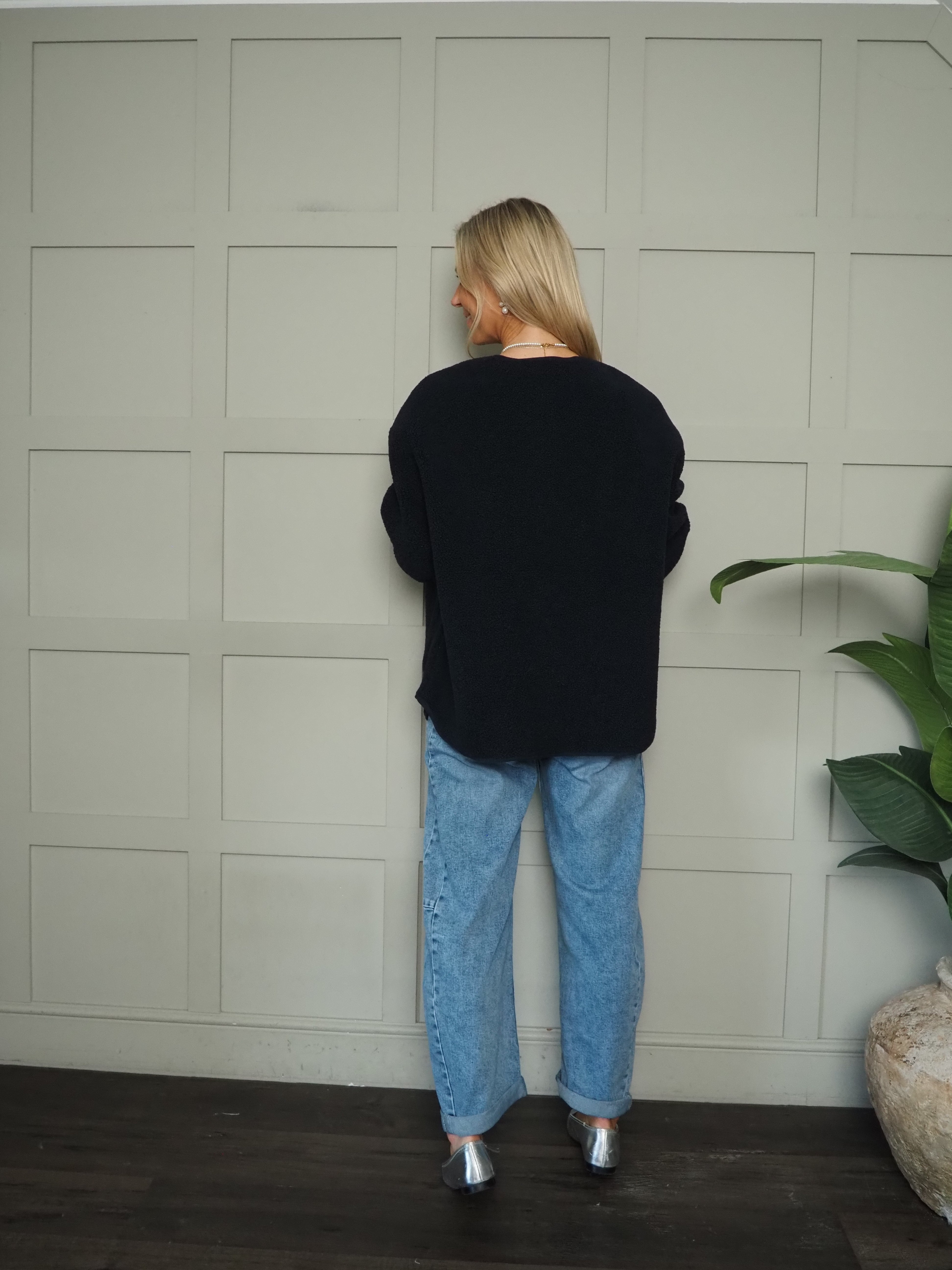 A versatile, comfortable and easy to throw on boucle jacket which works all year round. A collarless, relaxed fit style. This jacket features full-length sleeves button fastenings and generous square front pockets. Layer it over knitwear for winter or pair with a tee for summer—an adaptable piece for any season.