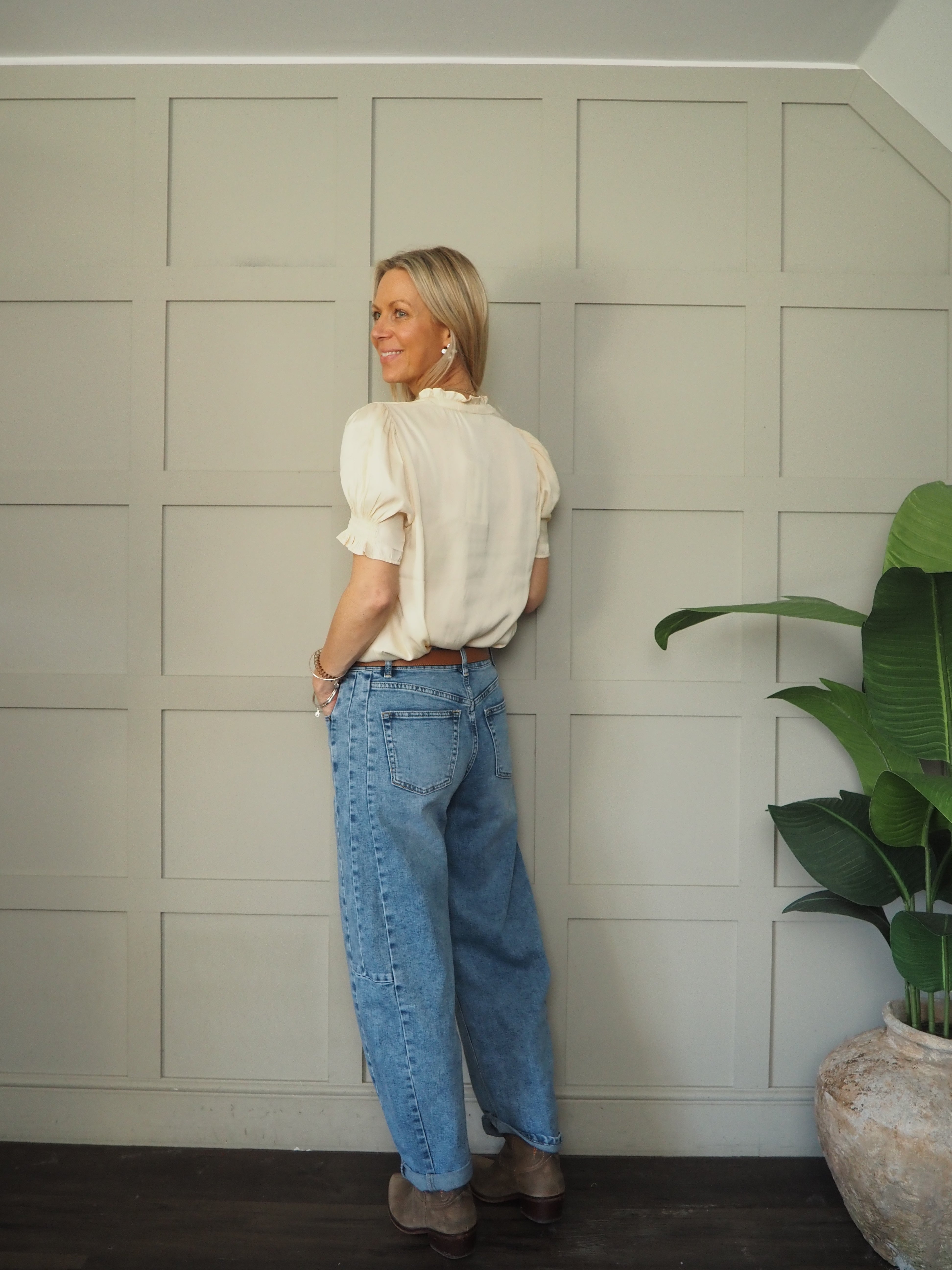 The Veeni satin blouse is an elegant piece which can be worn dressed up or down. It has a ruffle collar, buttons to the bust and short sleeves with elasticated panel and ruffle cuffs.