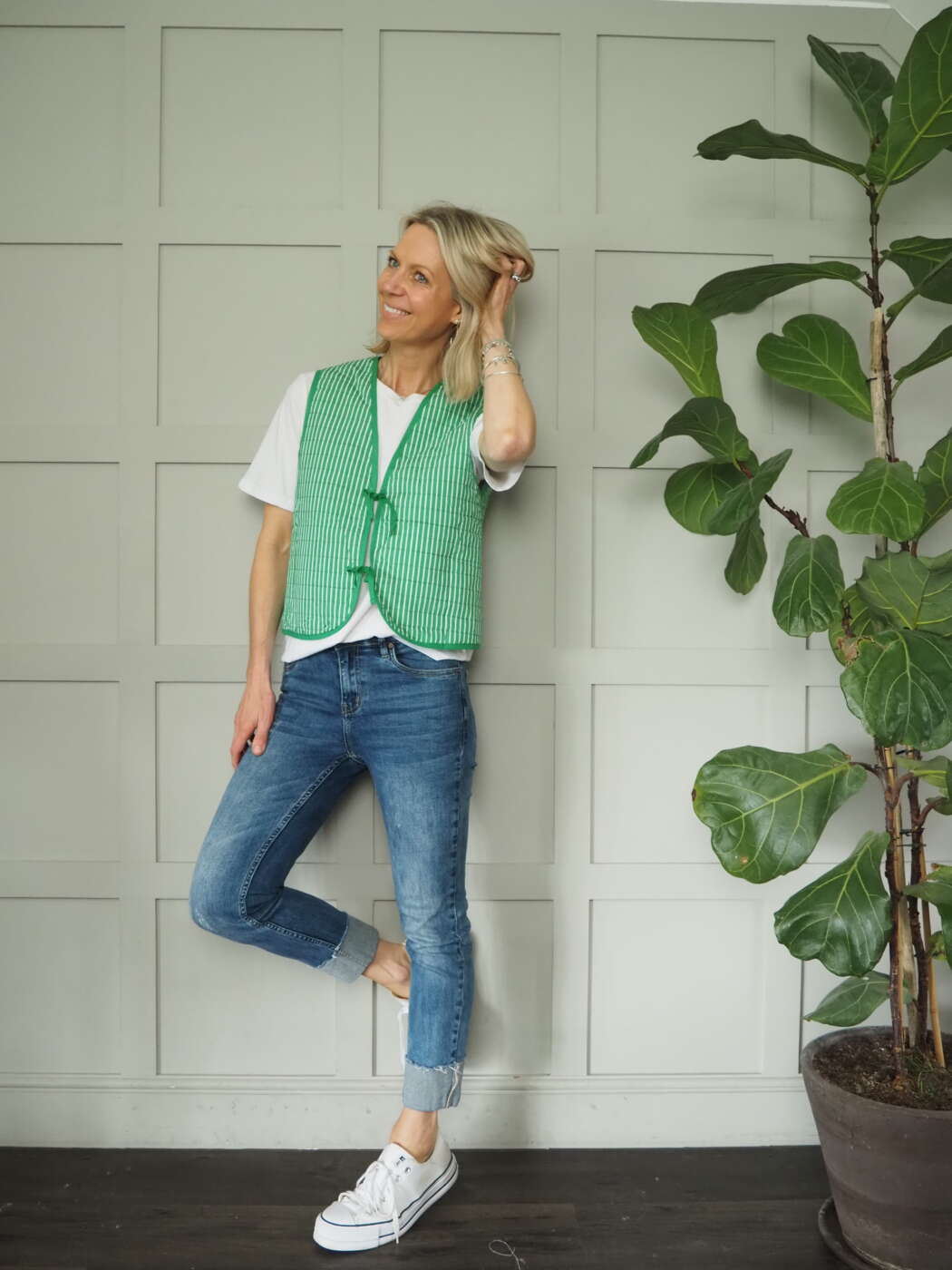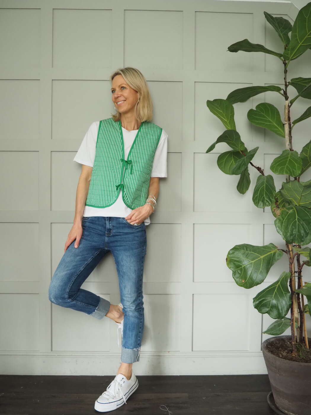 Reversible gilet, this comes in green, pink and white stripes with green piping. Pockets to the front.