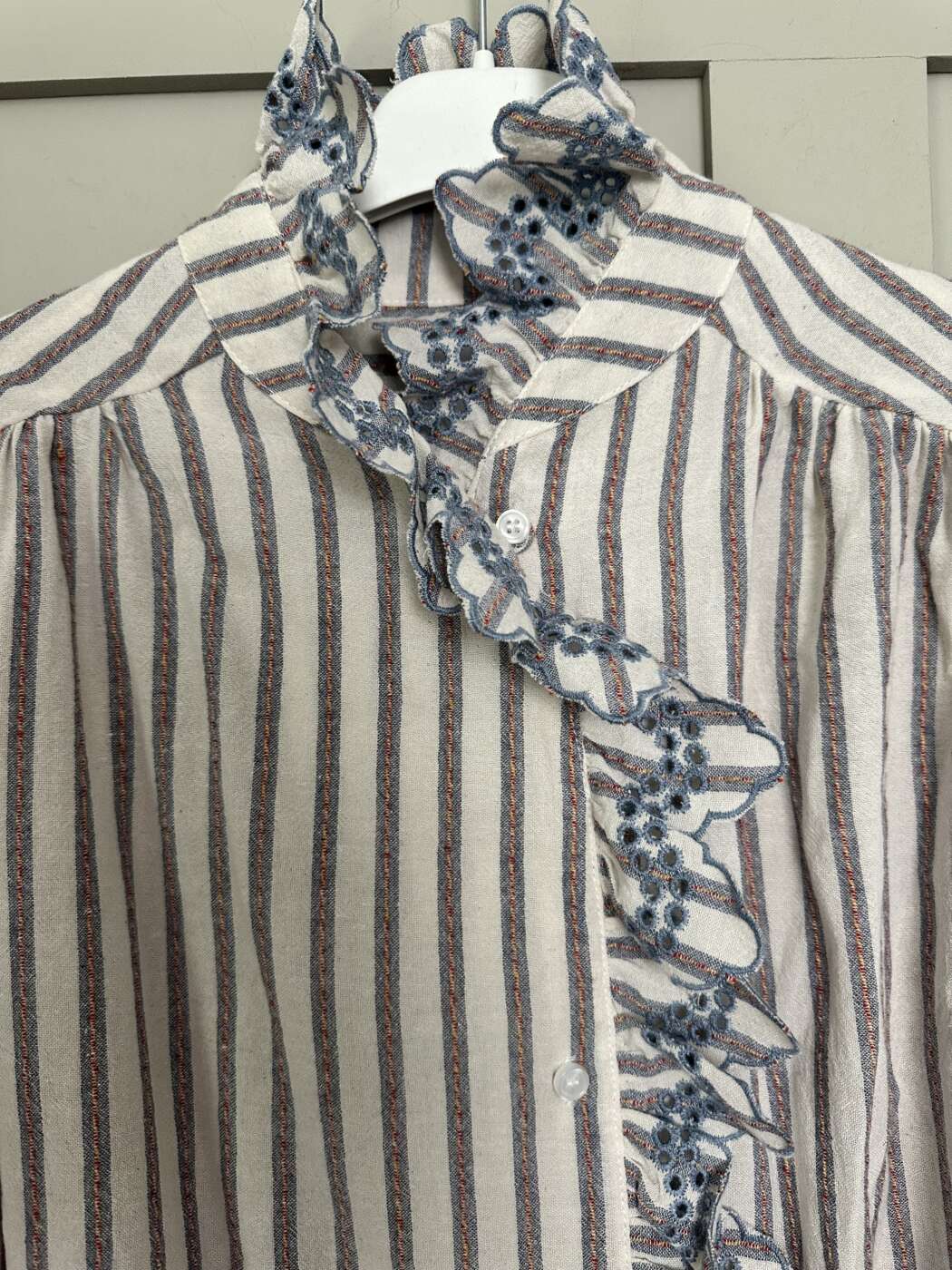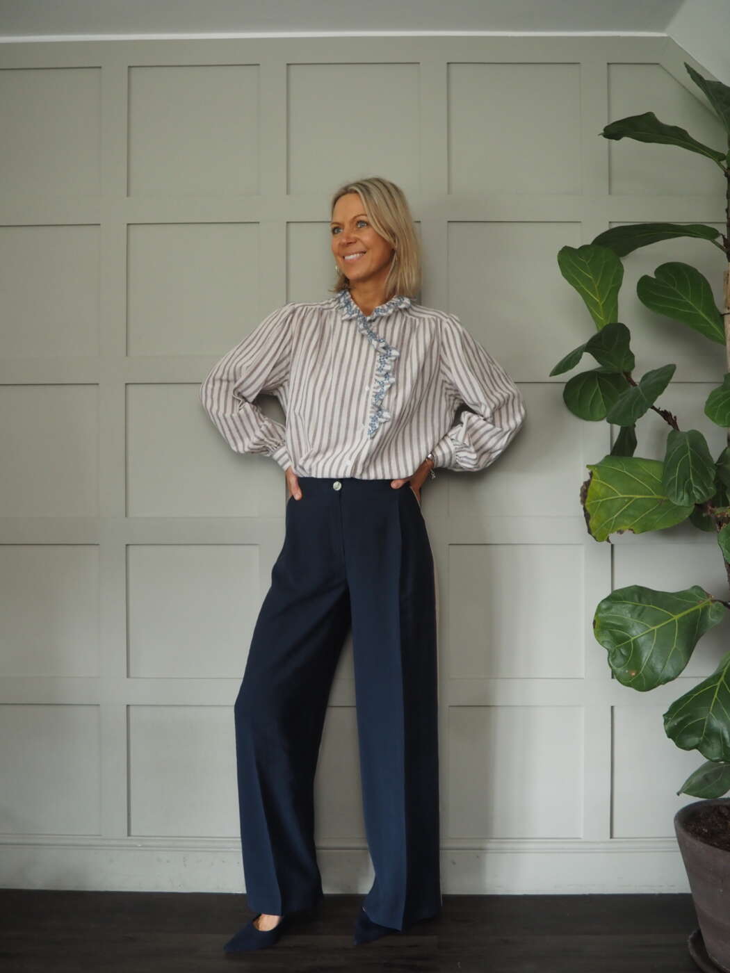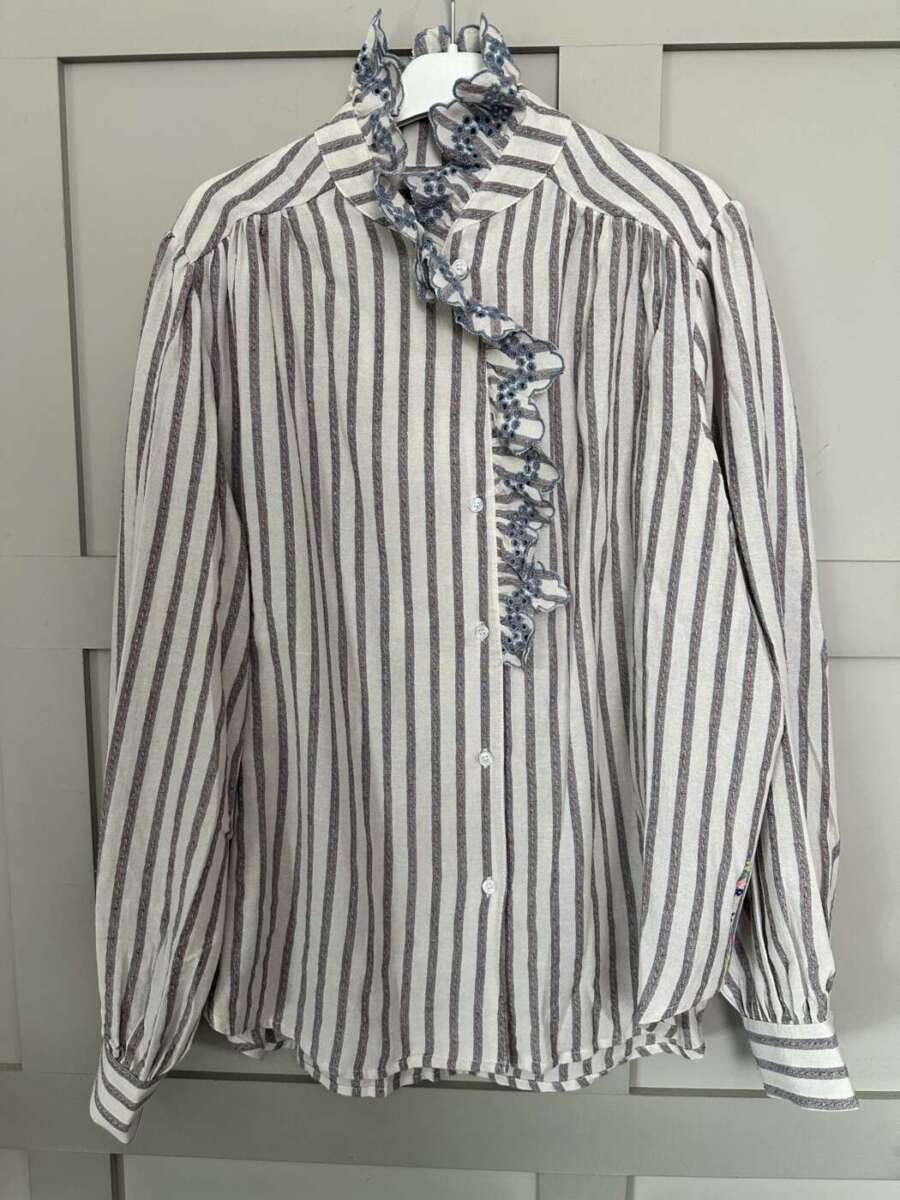 This Alya blouse is so pretty! It has vertical stripes in denim blue with a little coloured stripe and a lovely frilly detail on the high neck and down the front to the left hand side. Button fastening to the front, single button on each cuff.