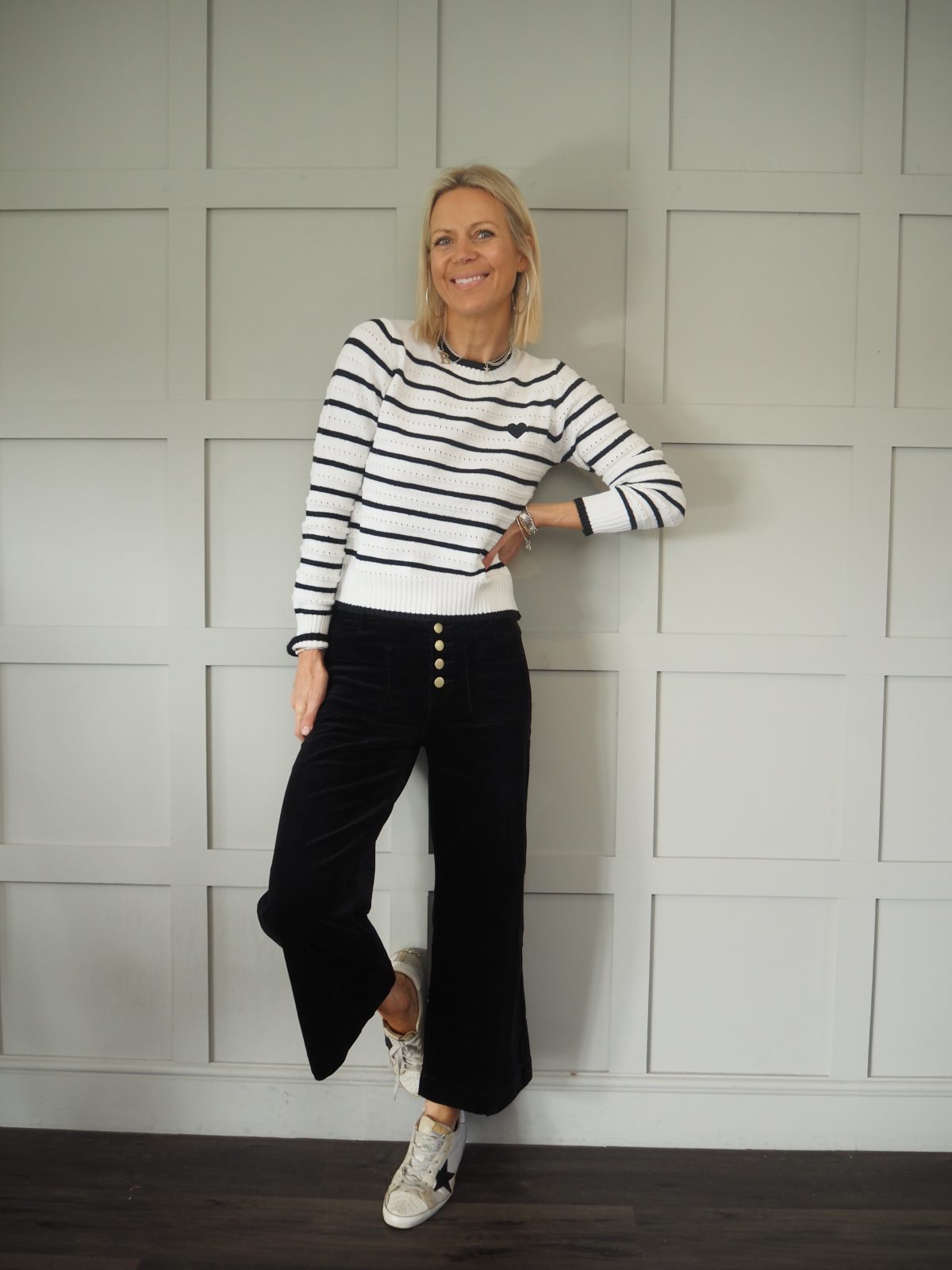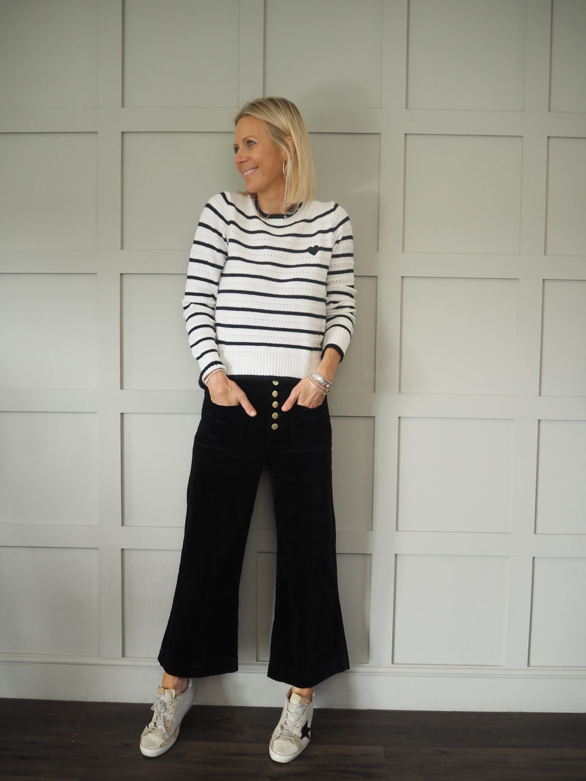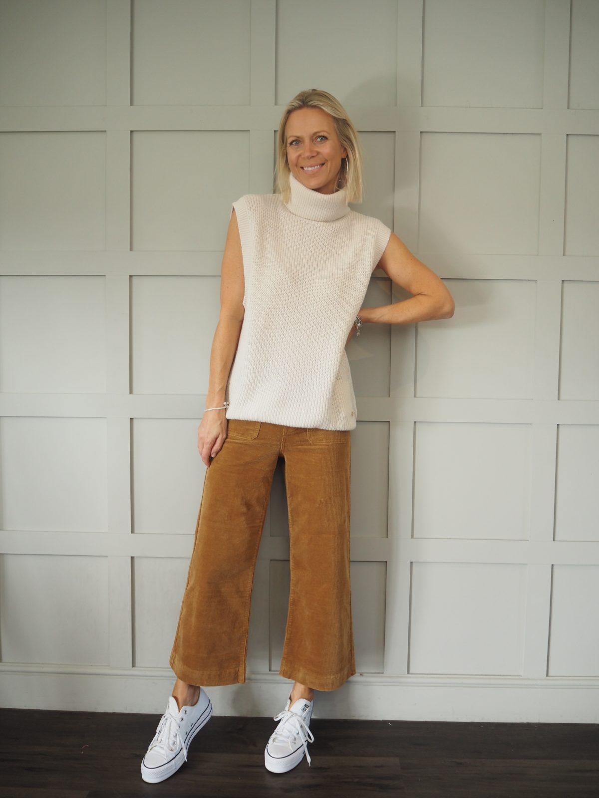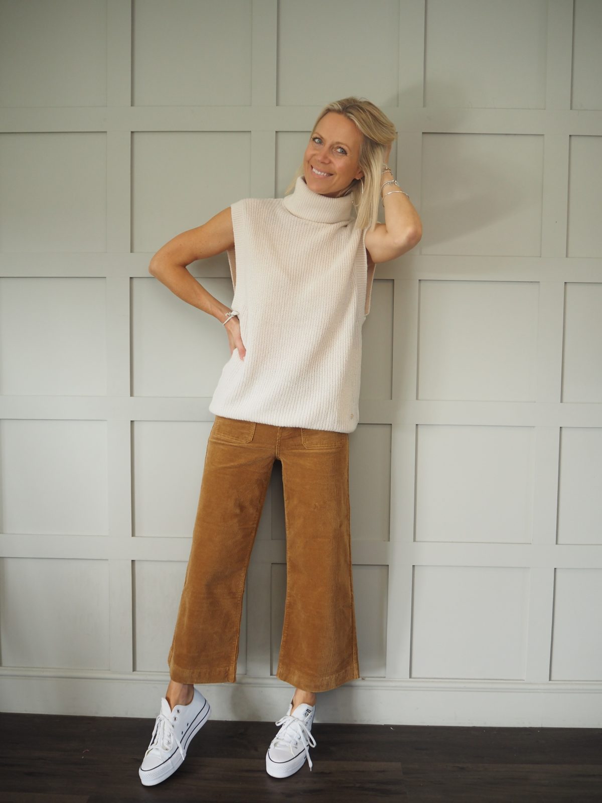 Fabulous wide leg cropped cords with square front and rear pockets. Mid rise. Button fly. The trousers work perfectly with trainers, heels or boots.