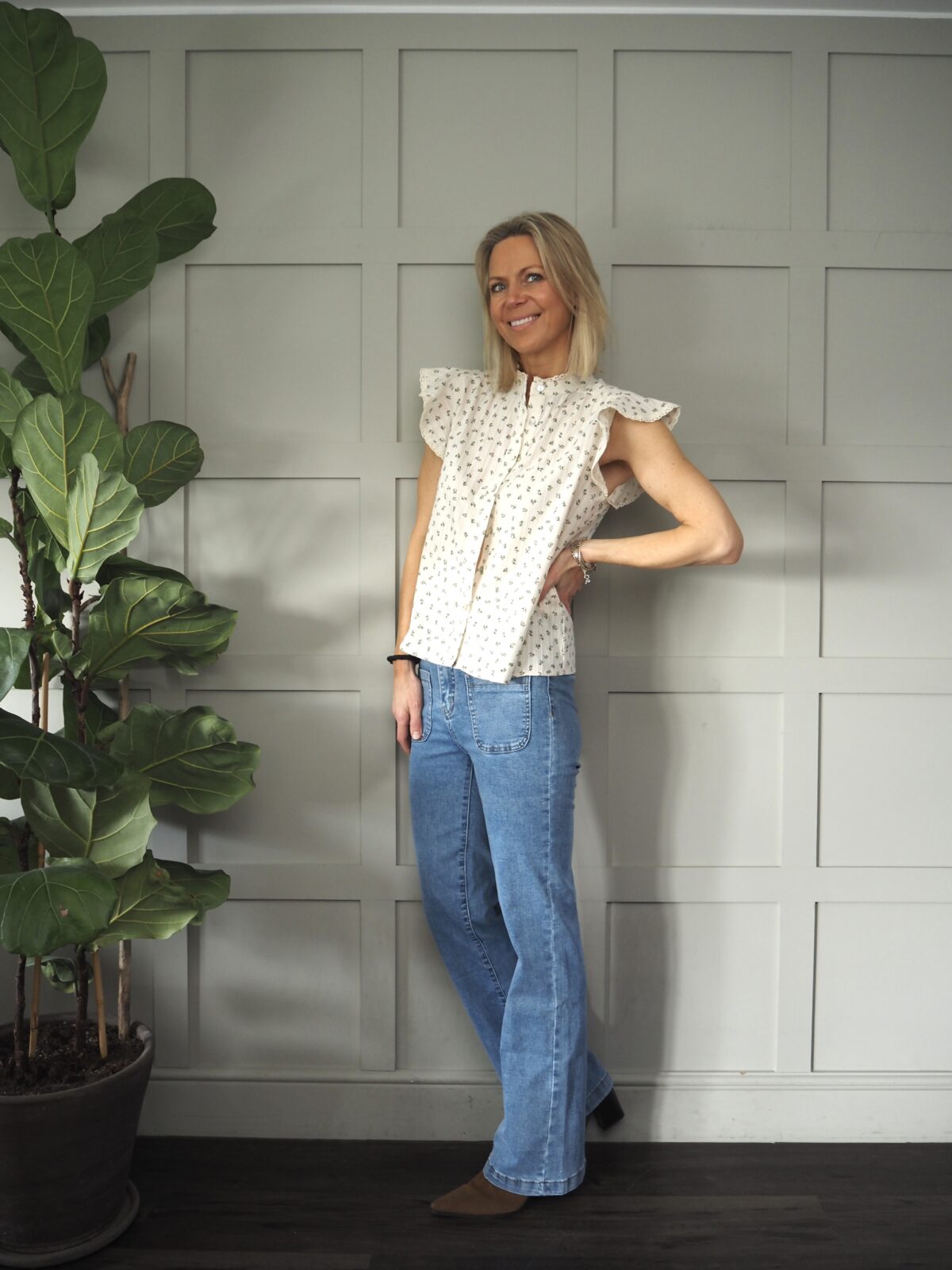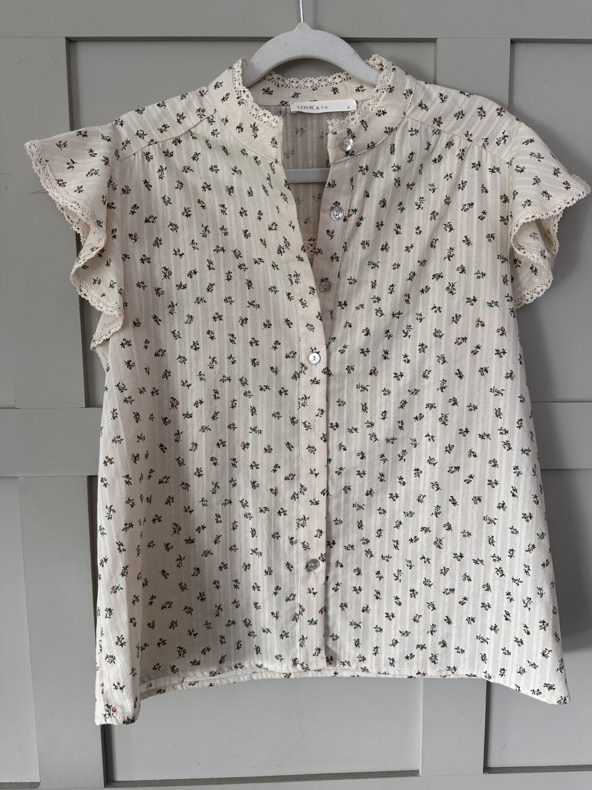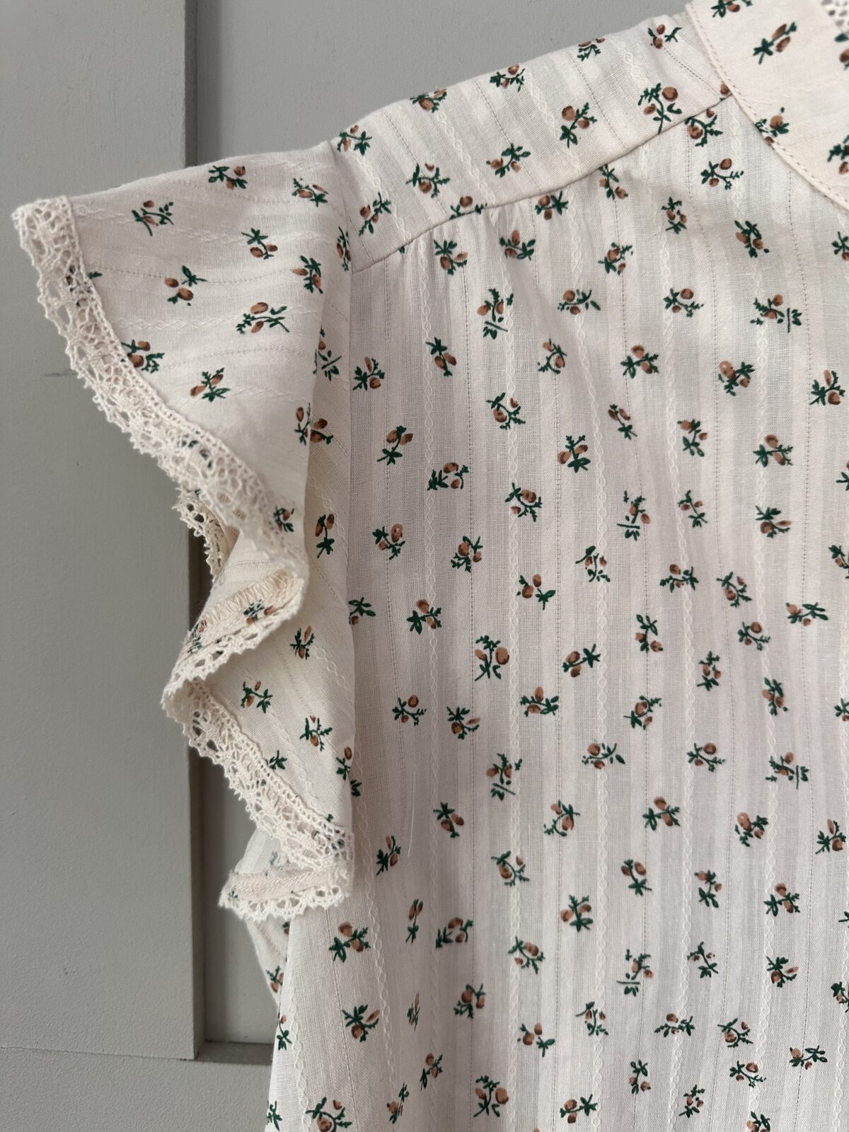 A beautiful short sleeved blouse, the Axelle blouse has pretty frilly cap sleeves and high, round neck and button fastening to the front.