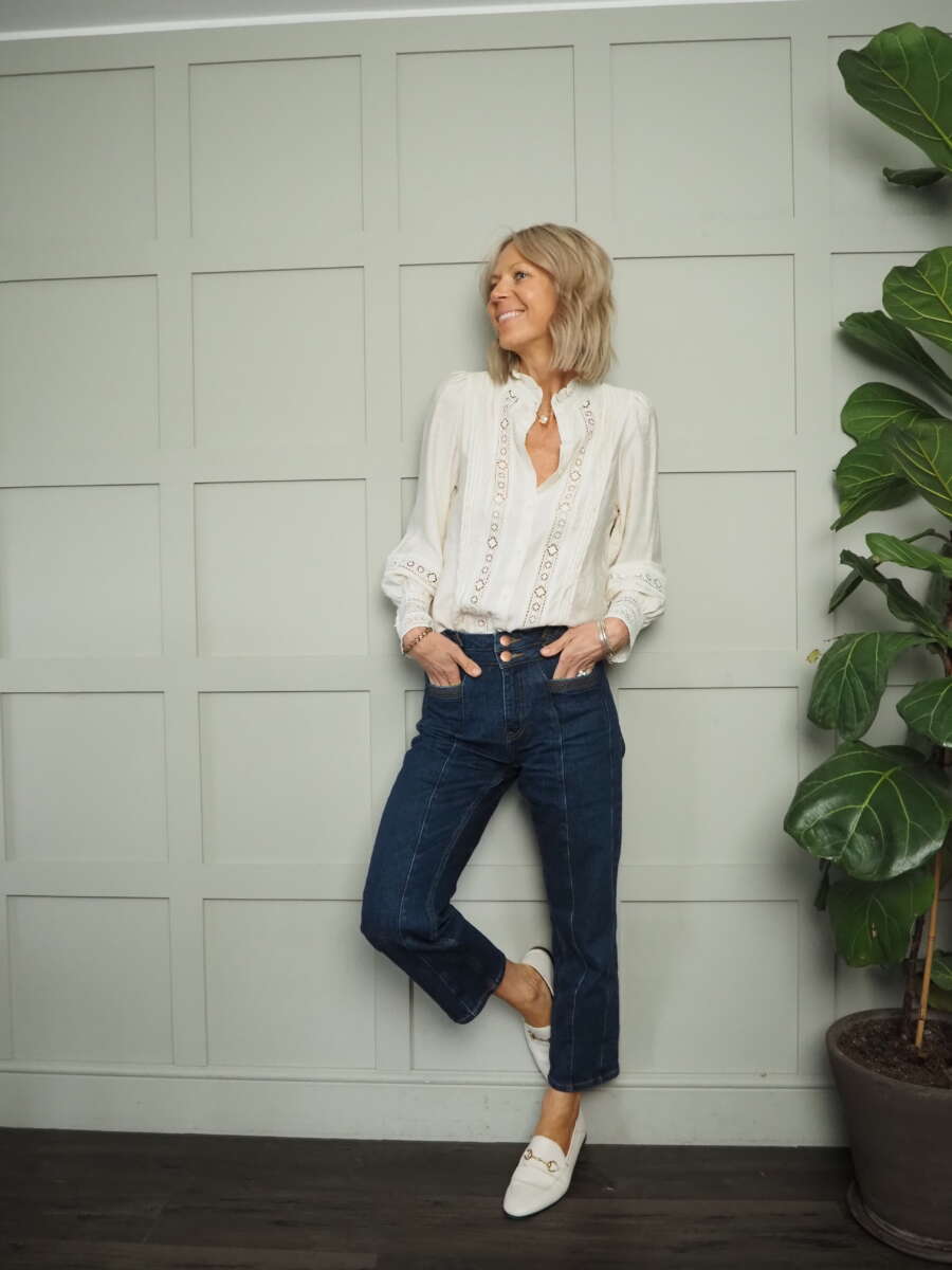 Off White worn with the SOHO Jeans – Denim Blue (22-P-0822-1) and Gold Acid Cow Hide Leather Belt