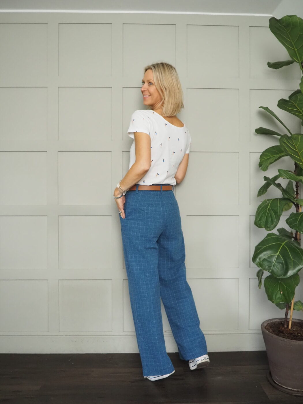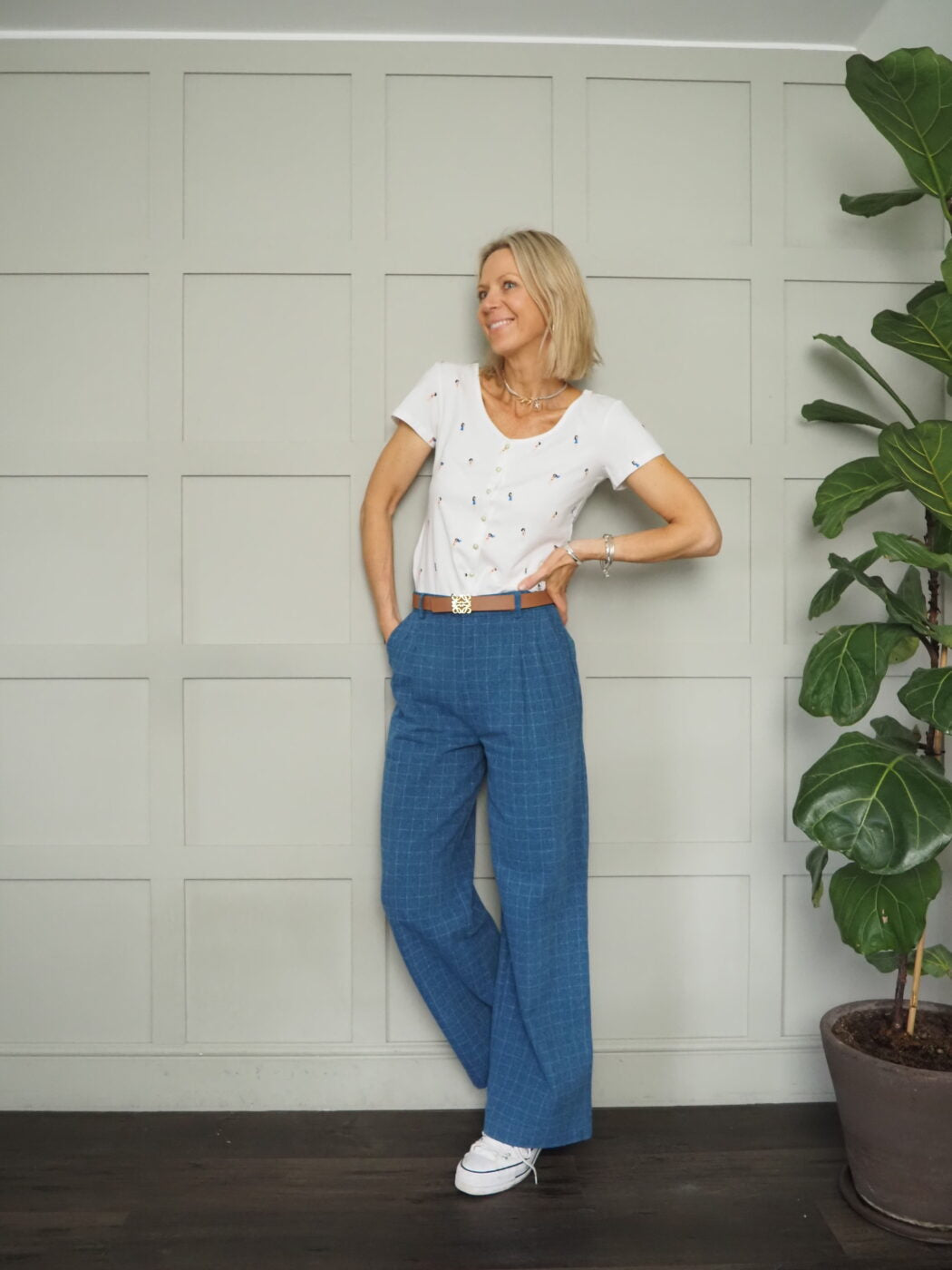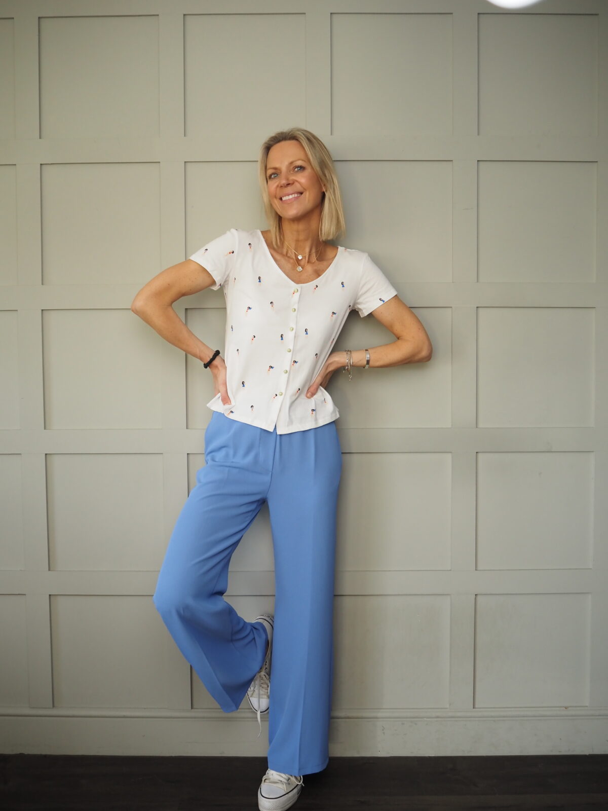 Worn with the Cornflower Blue Arna trousers. Also worn with the Leigh Wide Leg Trousers – Denim Blue Checked