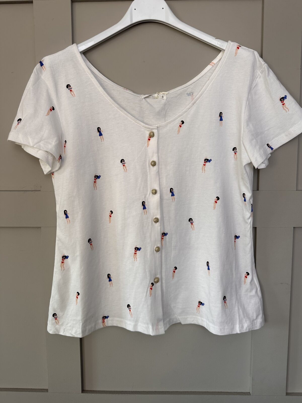 A cute T shirt, this is short sleeved with a gorgeous gold embroidered button fastening to the front. Scoop necked and simply fab! Perfect for spring through to summer and can be layered with a cardigan.