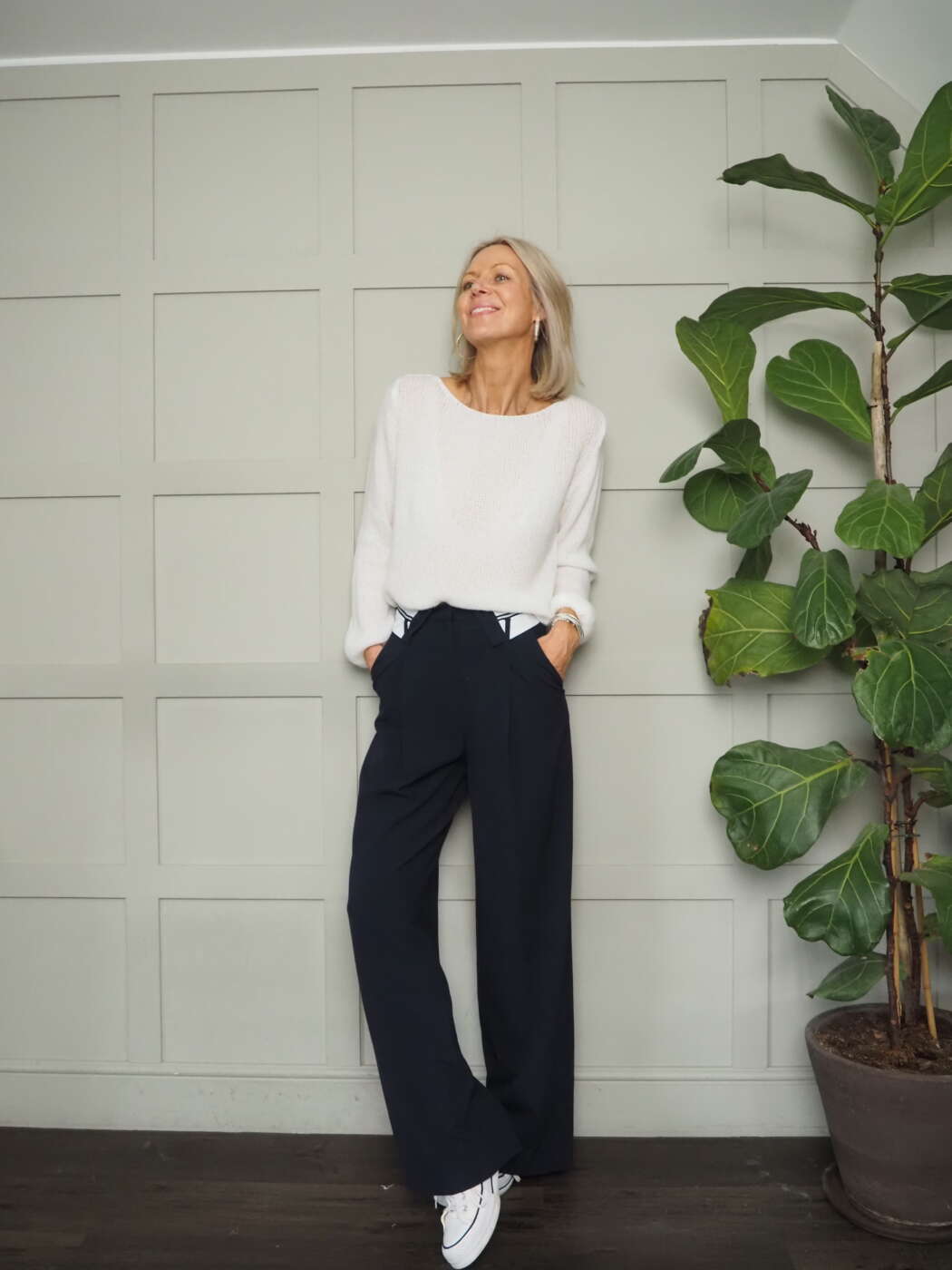 These wide leg trousers are beautifully tailored. They feature white detail with a stripe on either side and belt loops. Hook and zip fastening. There is a pleating detail at the front and pockets to the side. The trousers can be dressed down in the day with a t-shirt and trainers or dressed up with a silky top and heels – totally versatile!