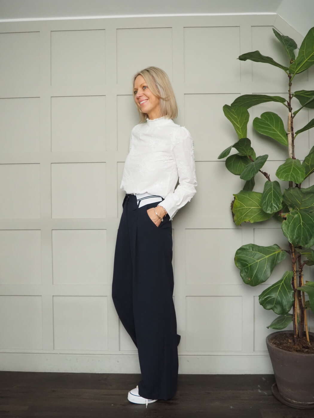 These wide leg trousers are beautifully tailored. They feature white detail with a stripe on either side and belt loops. Hook and zip fastening. There is a pleating detail at the front and pockets to the side. The trousers can be dressed down in the day with a t-shirt and trainers or dressed up with a silky top and heels – totally versatile!