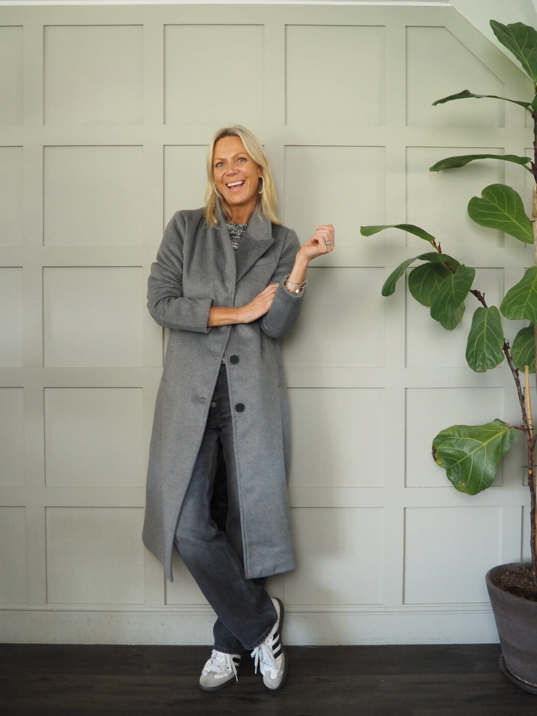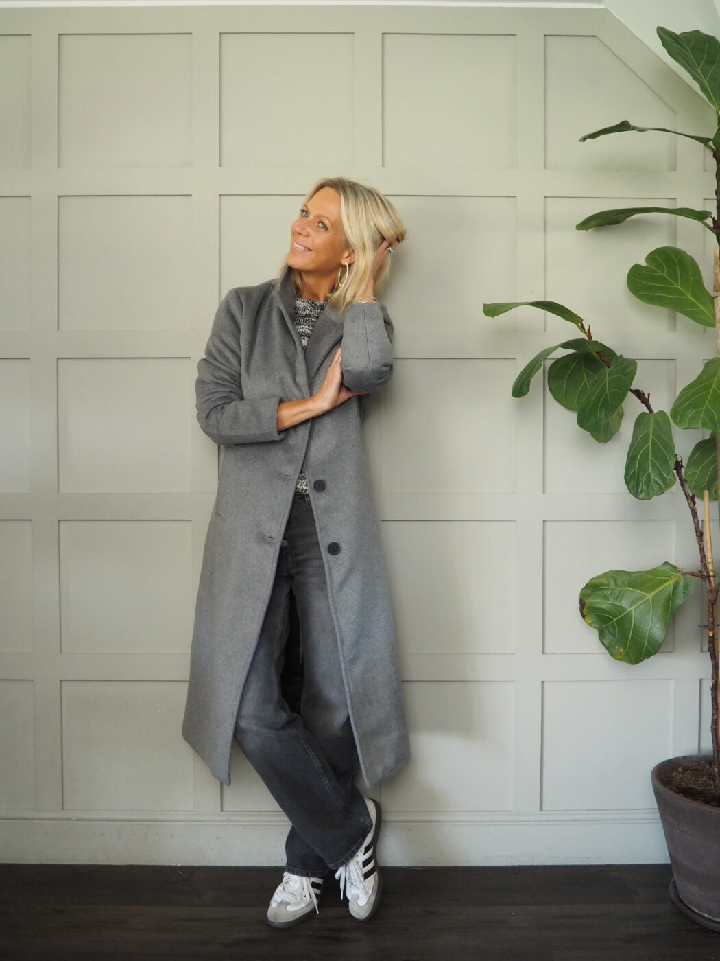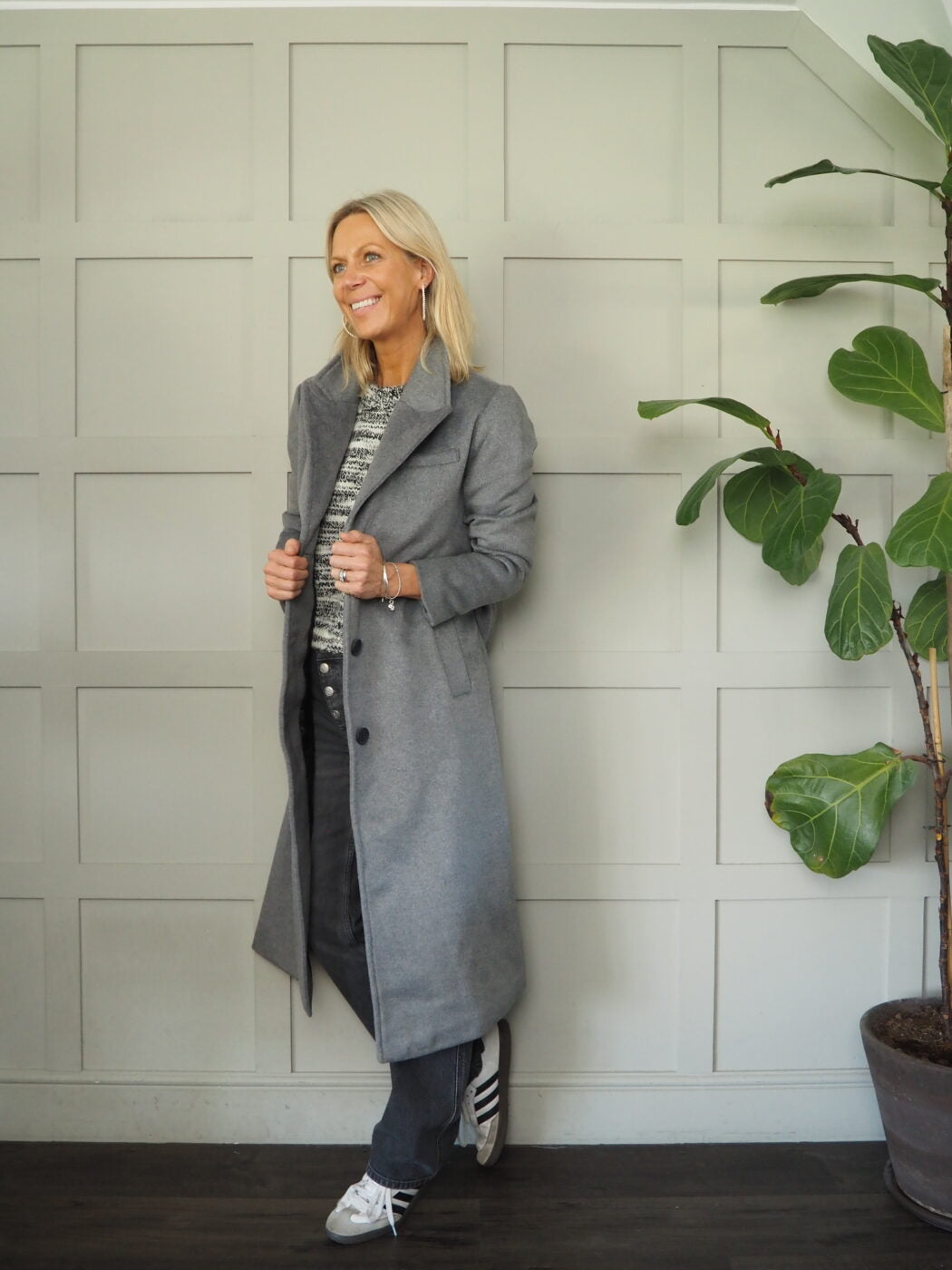 Worn here with the Ada Denim Straight Leg Jeans by Moss Copenhagen – Mid Blue and Grey and the Mulina Cropped 100% Wool Jumper By Moss Copenhagen – Black and White Flecked Pattern