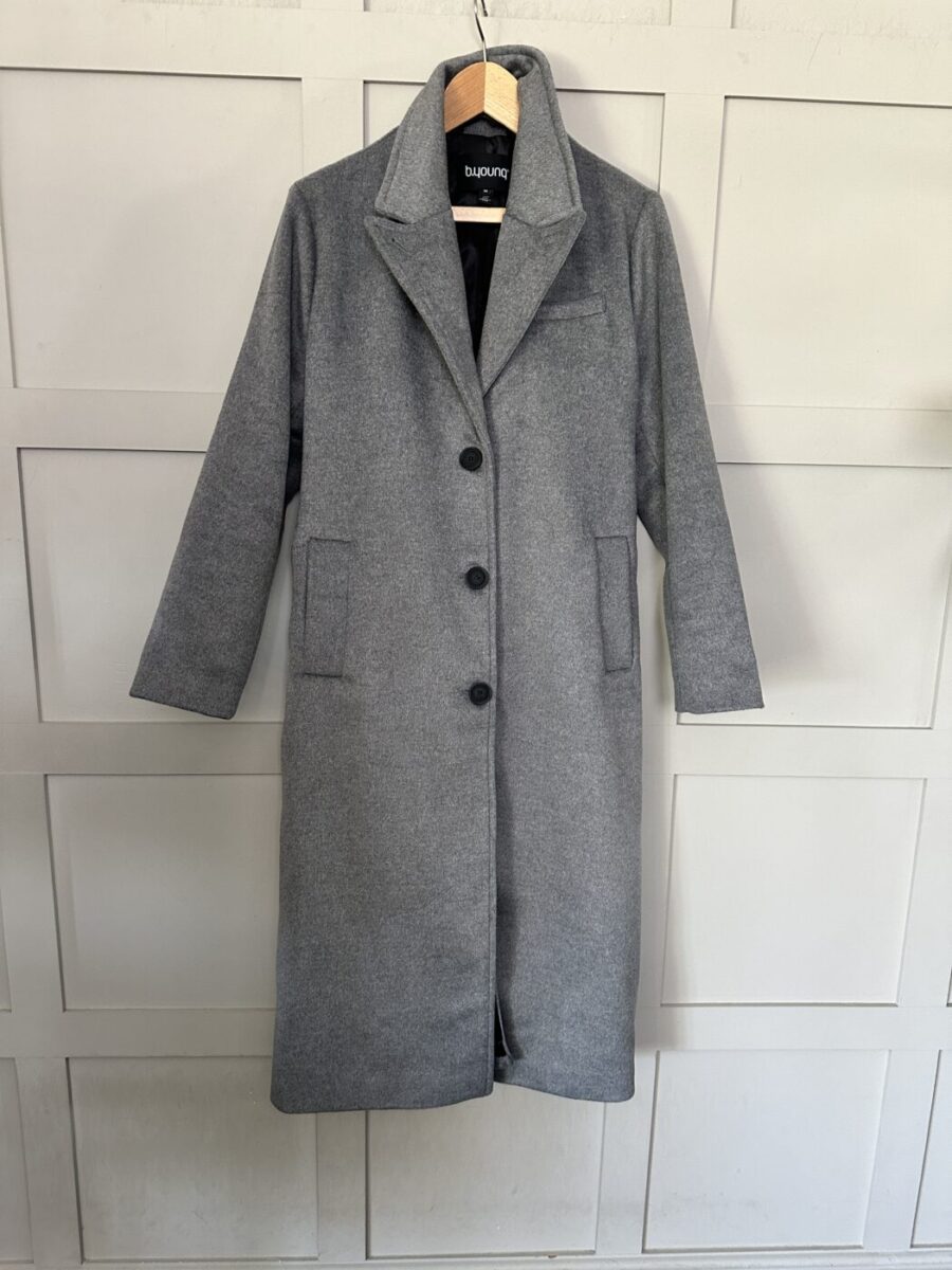 A very classic, mid grey, lined, wool mix coat. Single breasted with a detachable belt, it has a pocket over the left chest area, side pockets and a flattering slit at the back.