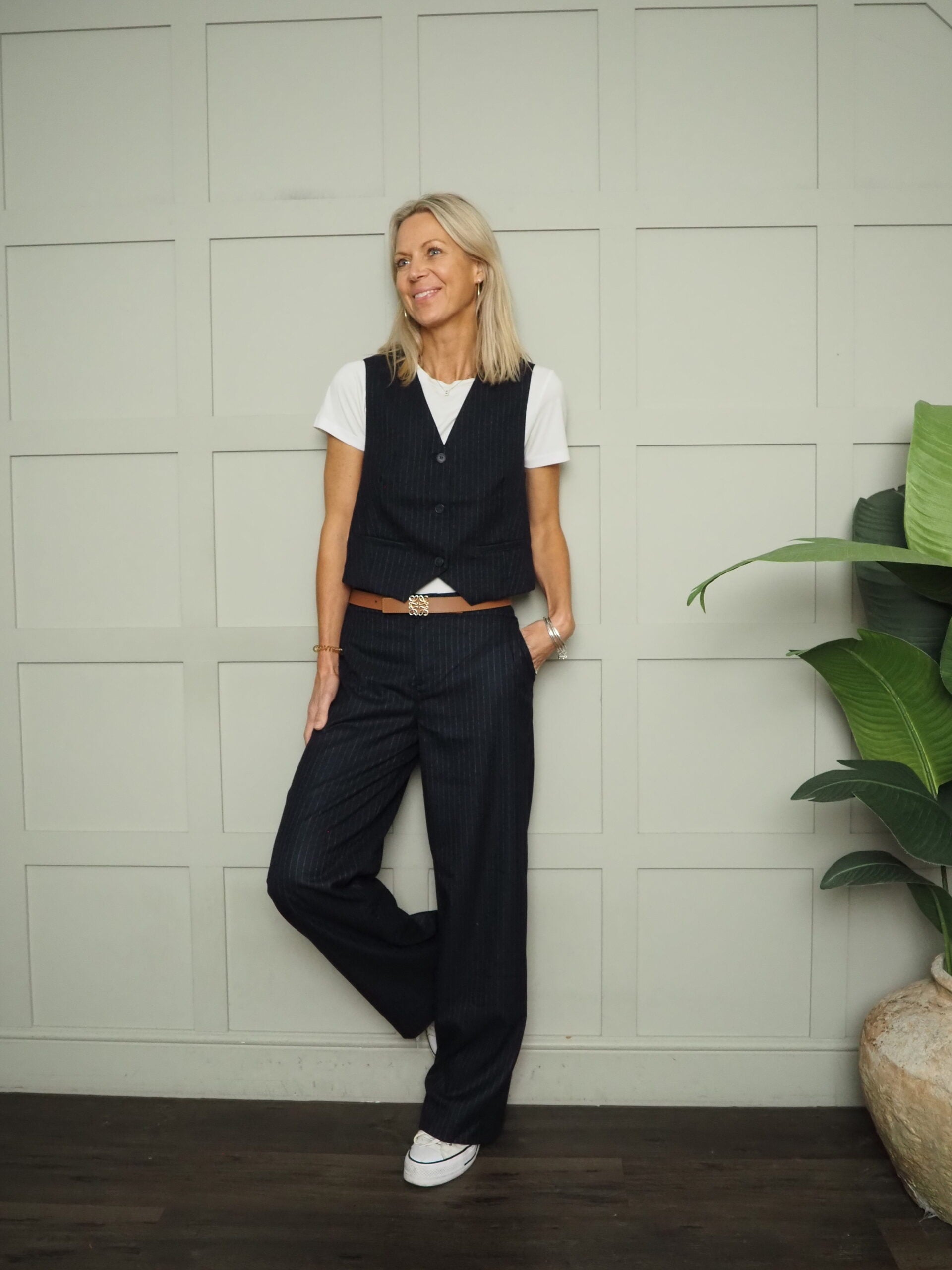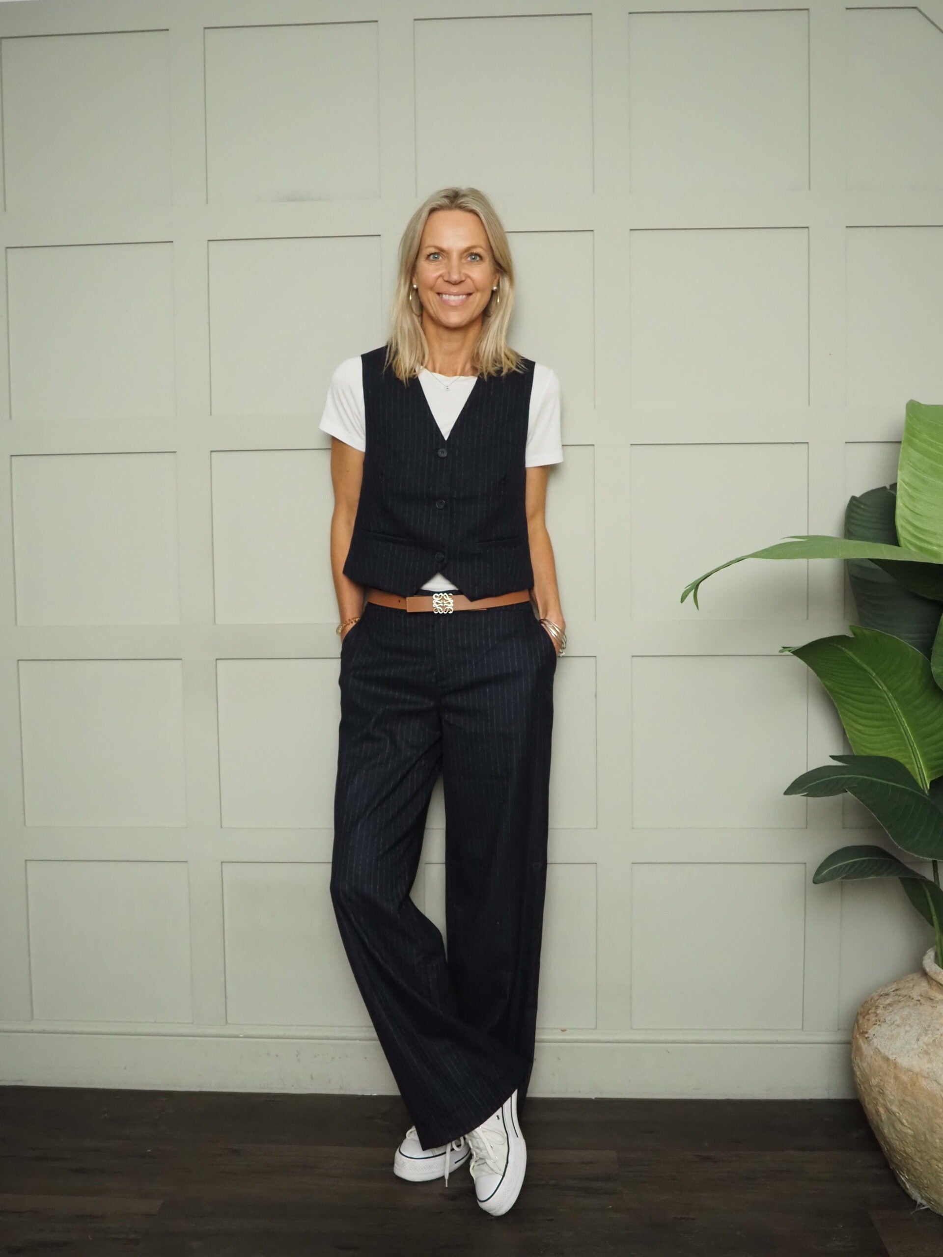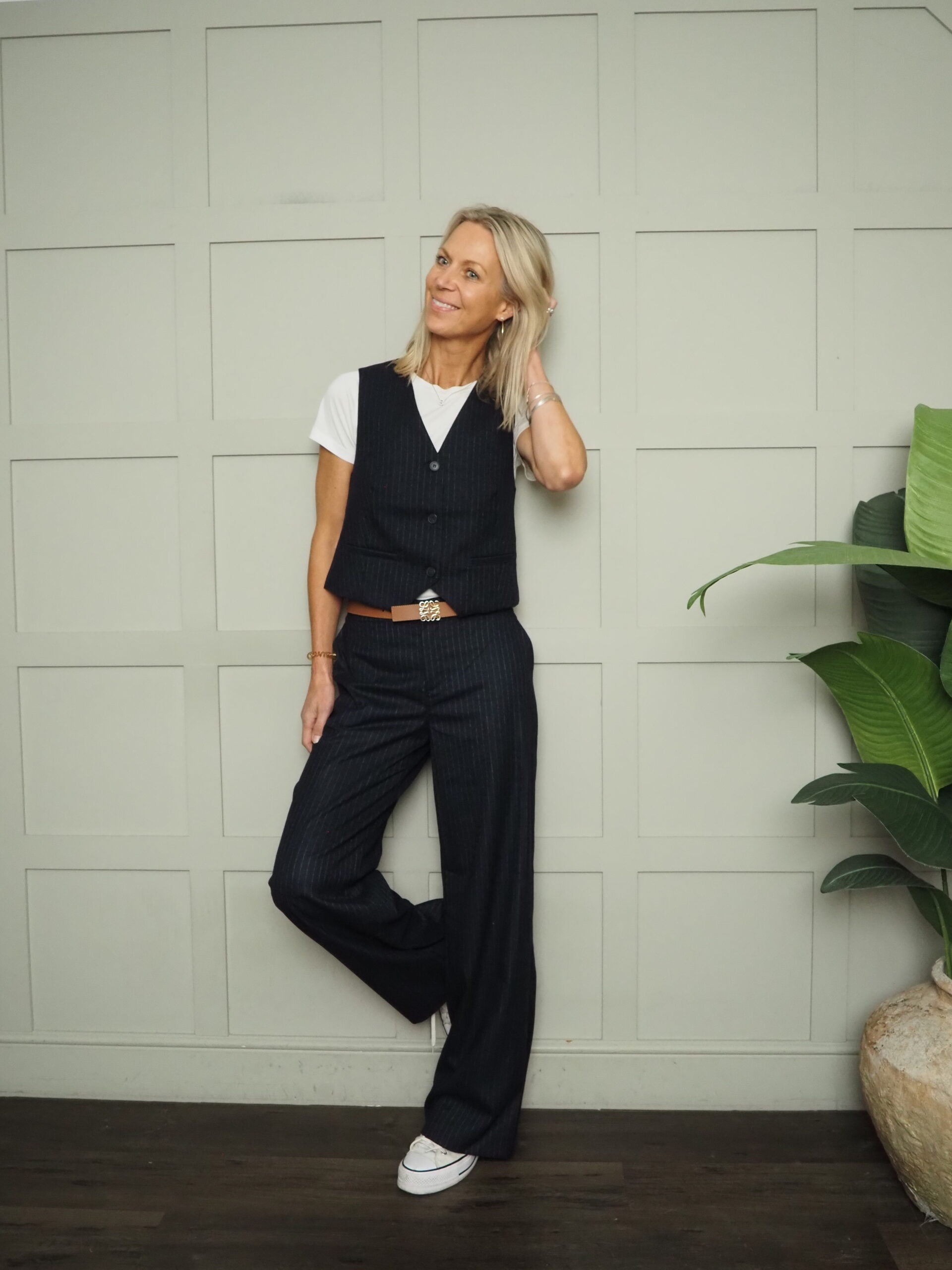 These classic pinstripe, wide leg trousers are super chic and very versatile as can be dressed up or down. They are incredibly comfortable as they have an elasticated panel at the back of the waistband and the front is flat so is flattering and sits neatly across the tummy. They have a button and zip fly and side pockets. No belt loops.