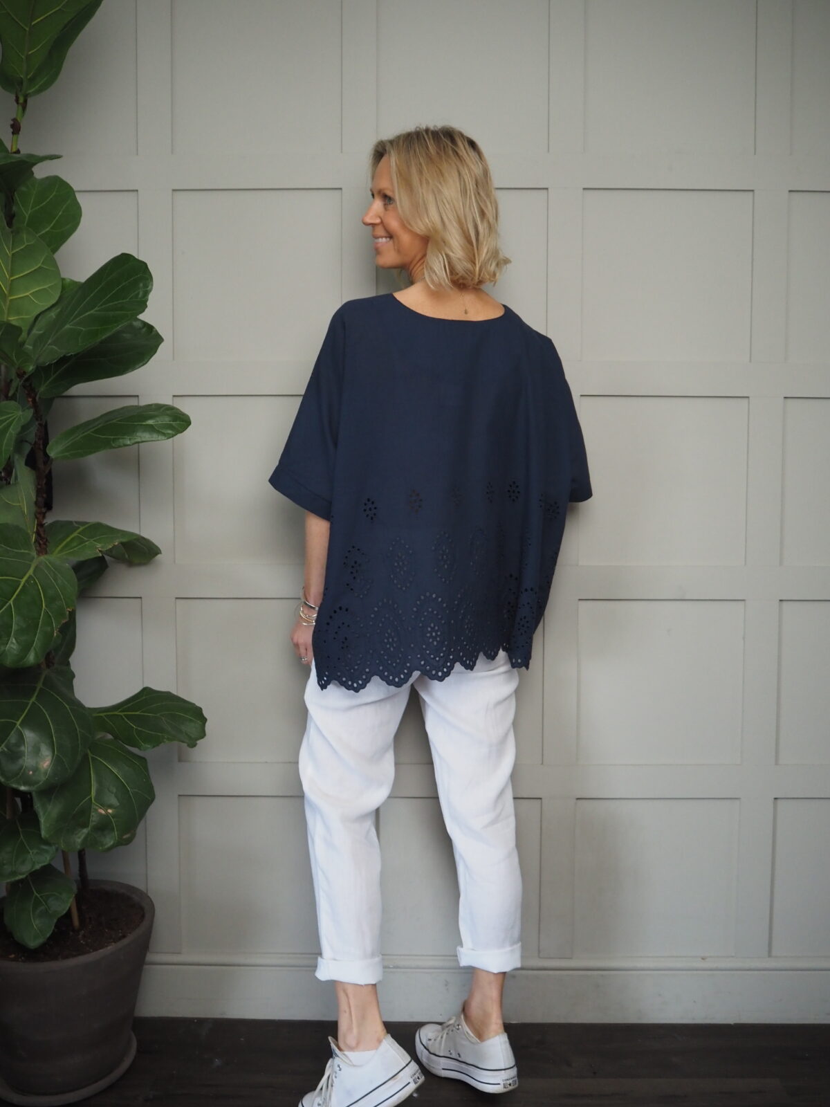 White worn with the Briar Boot Cut Denim Look Trousers, with Stretch – Blue trousers. Navy worn the Lynette Linen Trousers with Side Pockets – Coral, Grey, Navy Blue and Sand