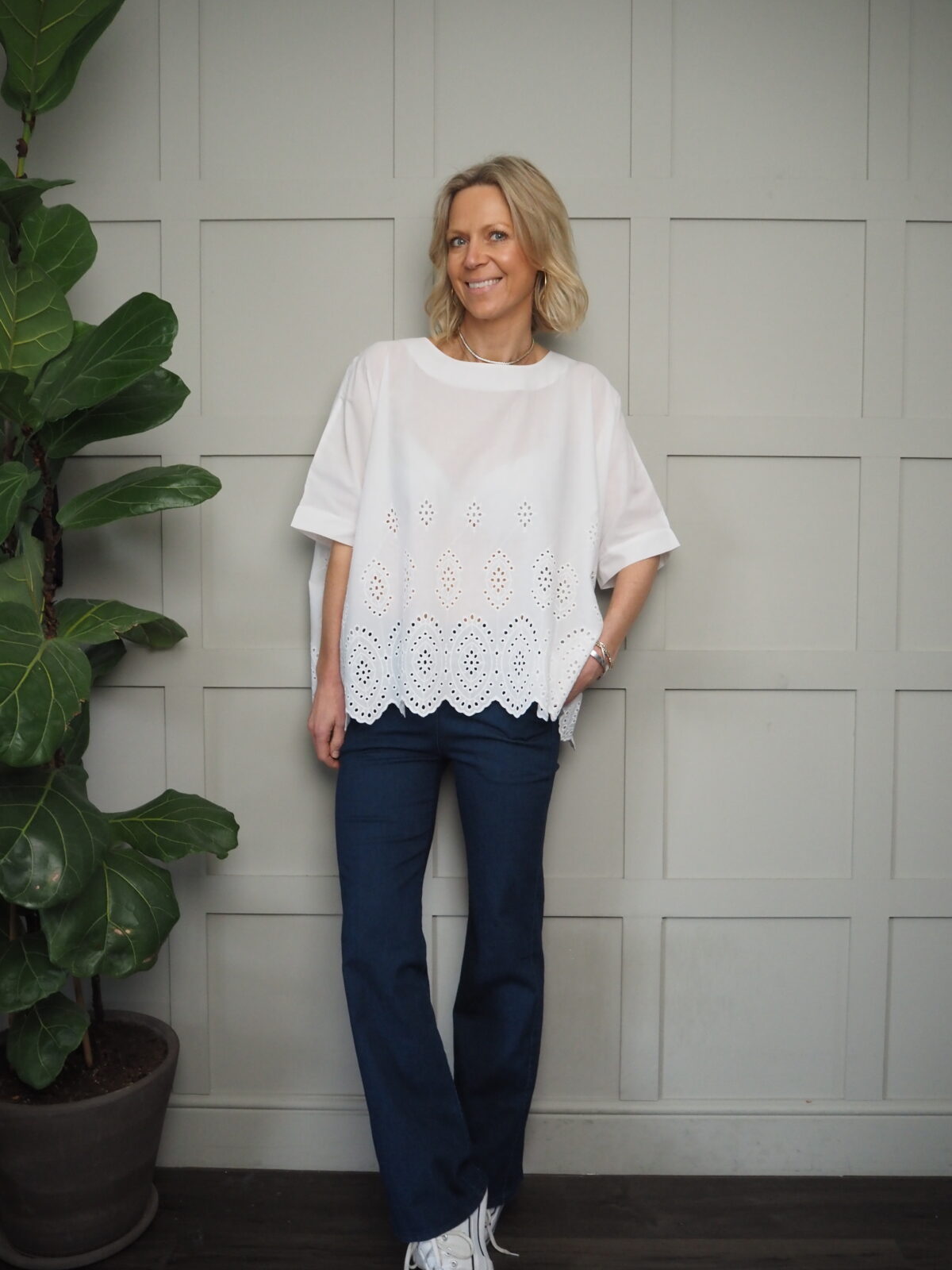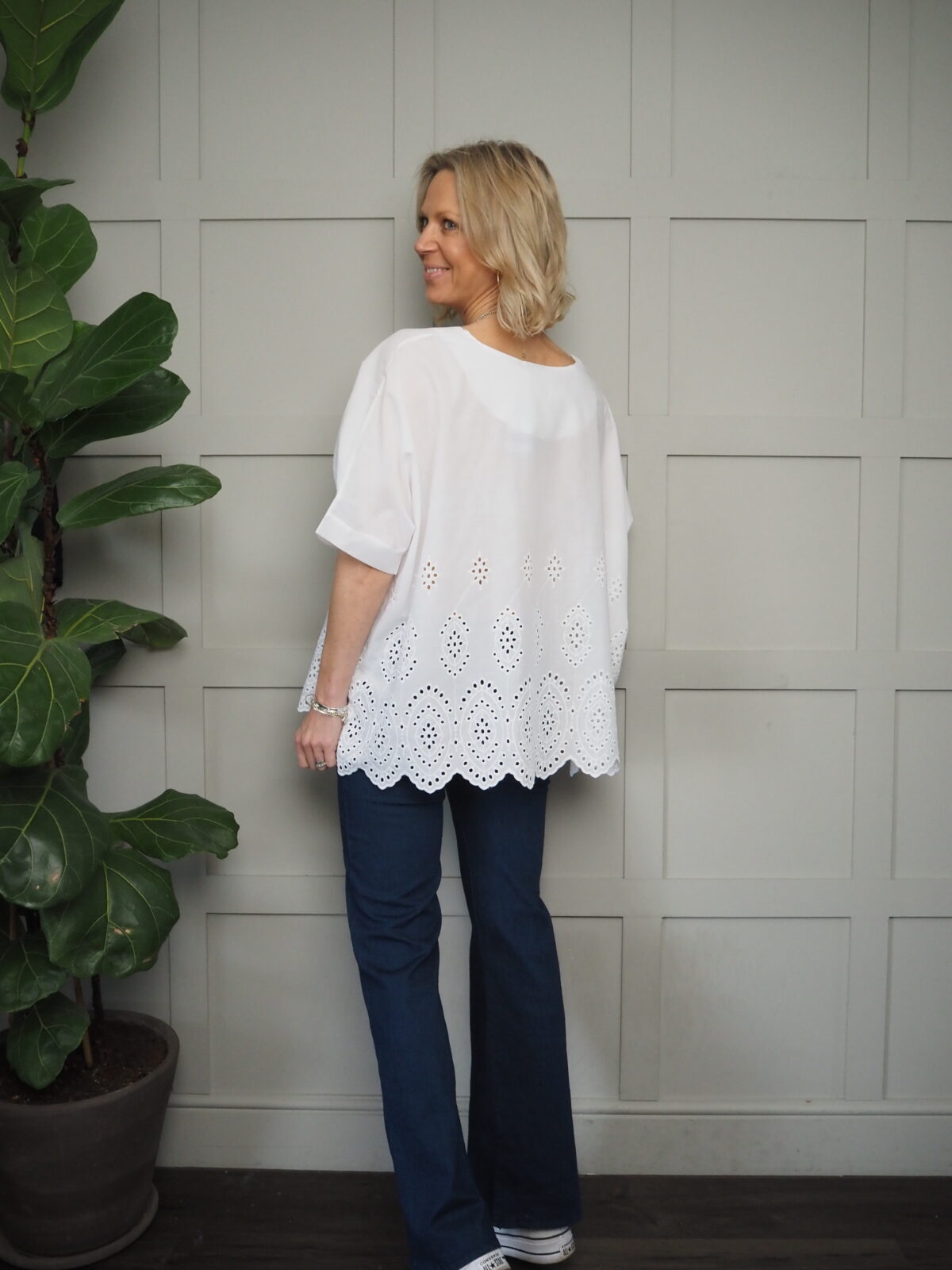 Classic, simple and elegant. This relaxed fit top will work on a variety of sizes. Short sleeved, round necked, with a pretty broderie anglaise detail from the bust down.