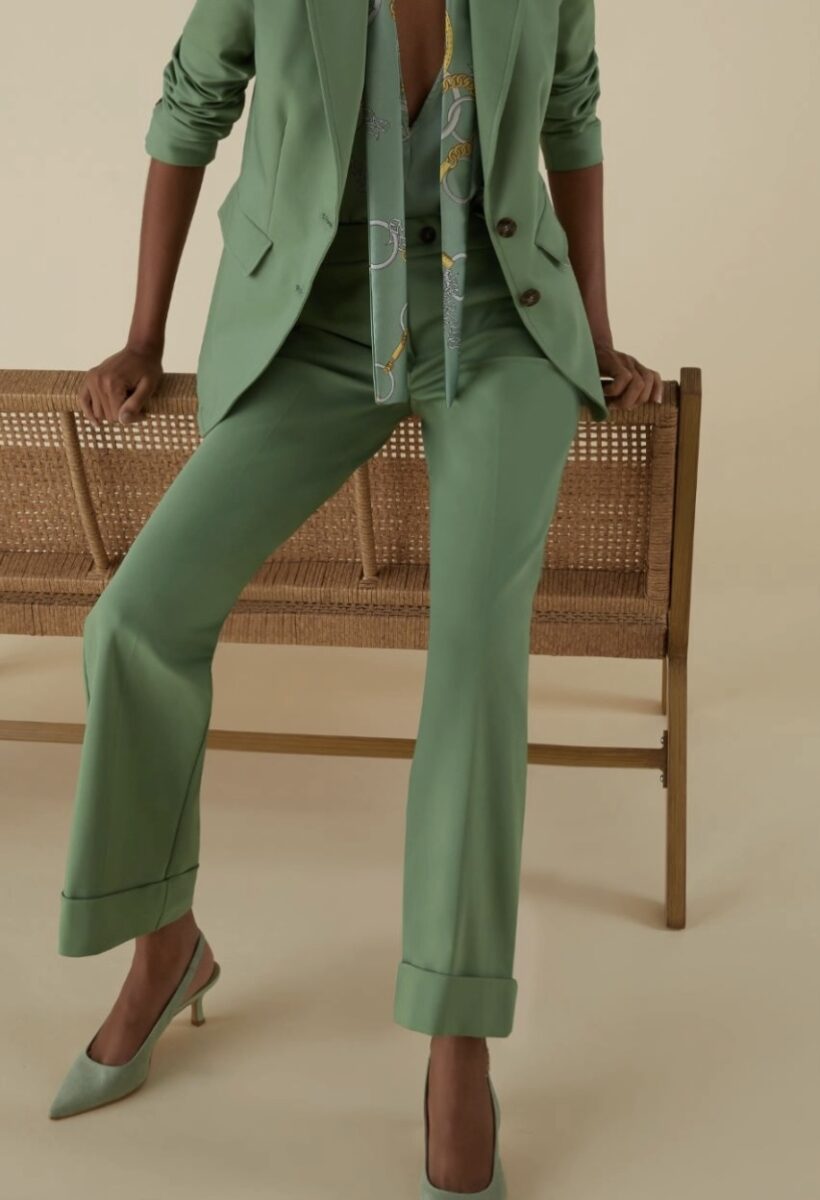 These straight-leg trousers combine style, versatility and comfort, plus are set apart by the tailoring-reminiscent turned-up leg hems. They are a stretch cotton-blend trouser which are a straight fit with turn-up detail. They feature fly-covered zip and button fastening, slant pockets and pressed pleat detail on the front and back.Available in Green.Worn here with the matching Lorena Blazer – GreenSizing: 42 (UK 10), 44 (UK 12) and 46 (UK 14). Becky is a size 8-10, 5’9″ tall and would wear the 42 (UK10).Composition: 51% cotton, 45% polyamide, 4% elastane.Care: Machine wash cold delicate cycle; do not bleach; do not tumble dry; line dry in the shade; cool iron; professionally dry clean perchloroethylene – mild process.