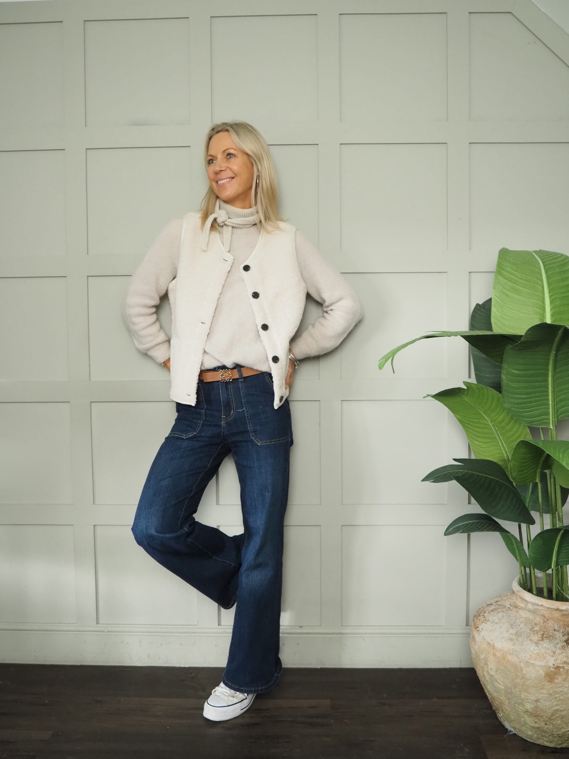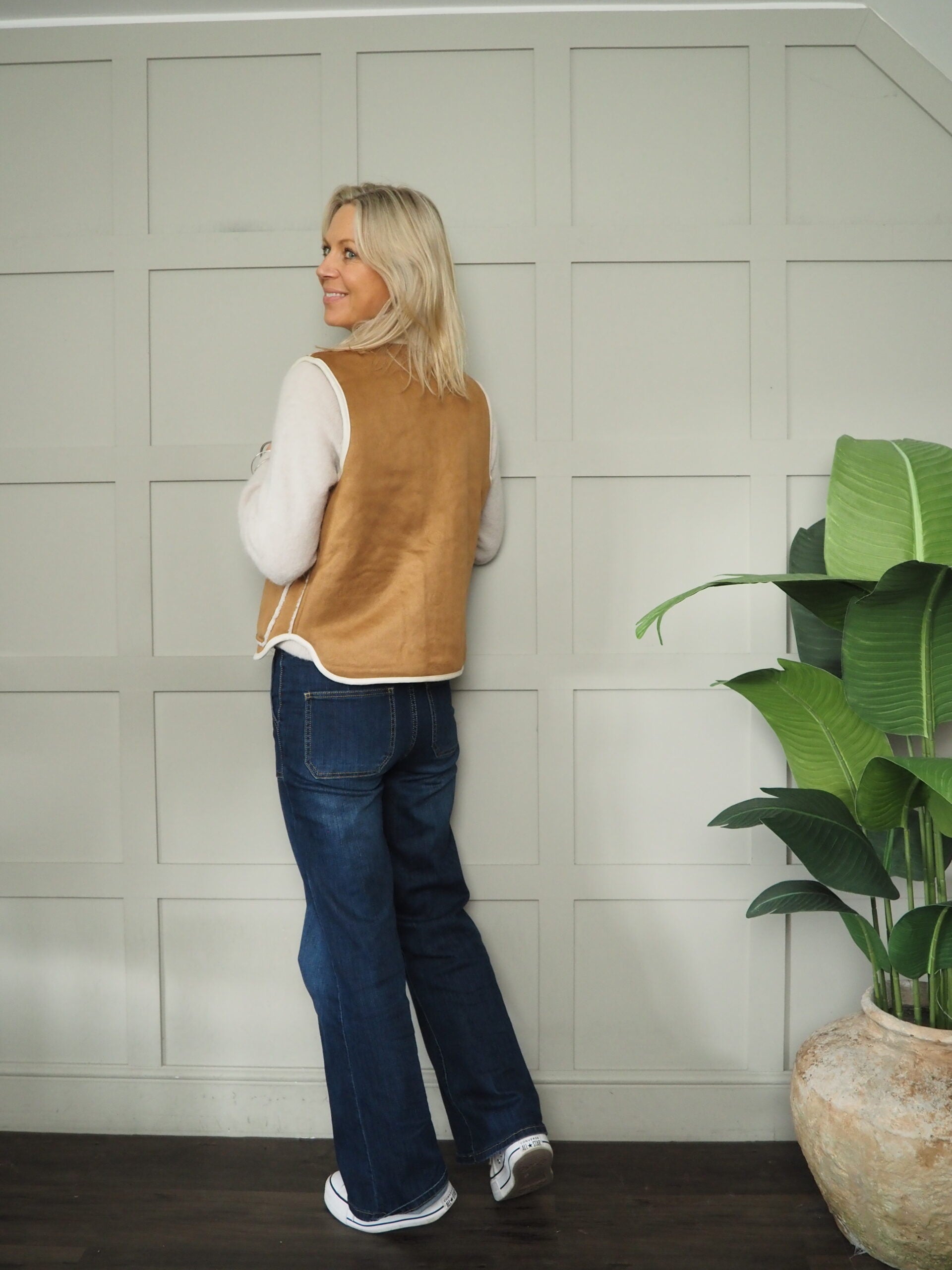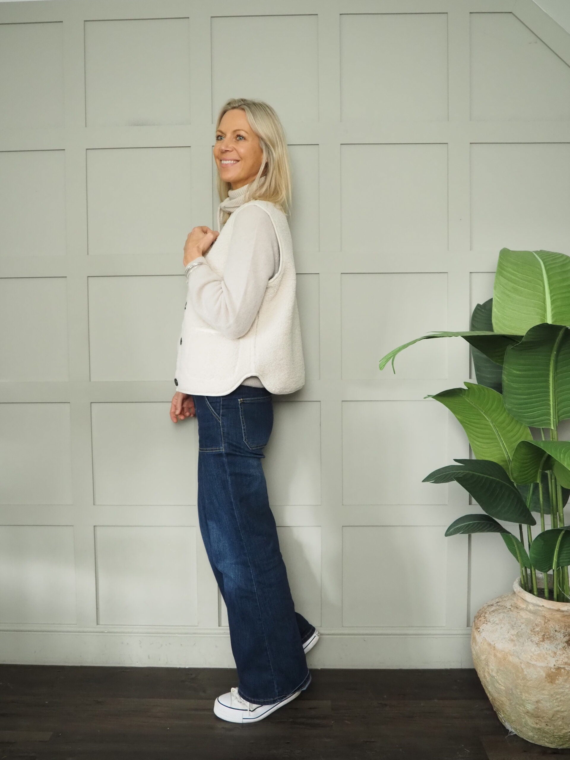 This reversible gilet has oatmeal faux shearling on one side and faux suede on the other giving two different looks. A super useful layering piece which can be worn under jackets and blazers and over blouses and knitwear. It has button fastenings a round neckline and square front pockets on both sides.