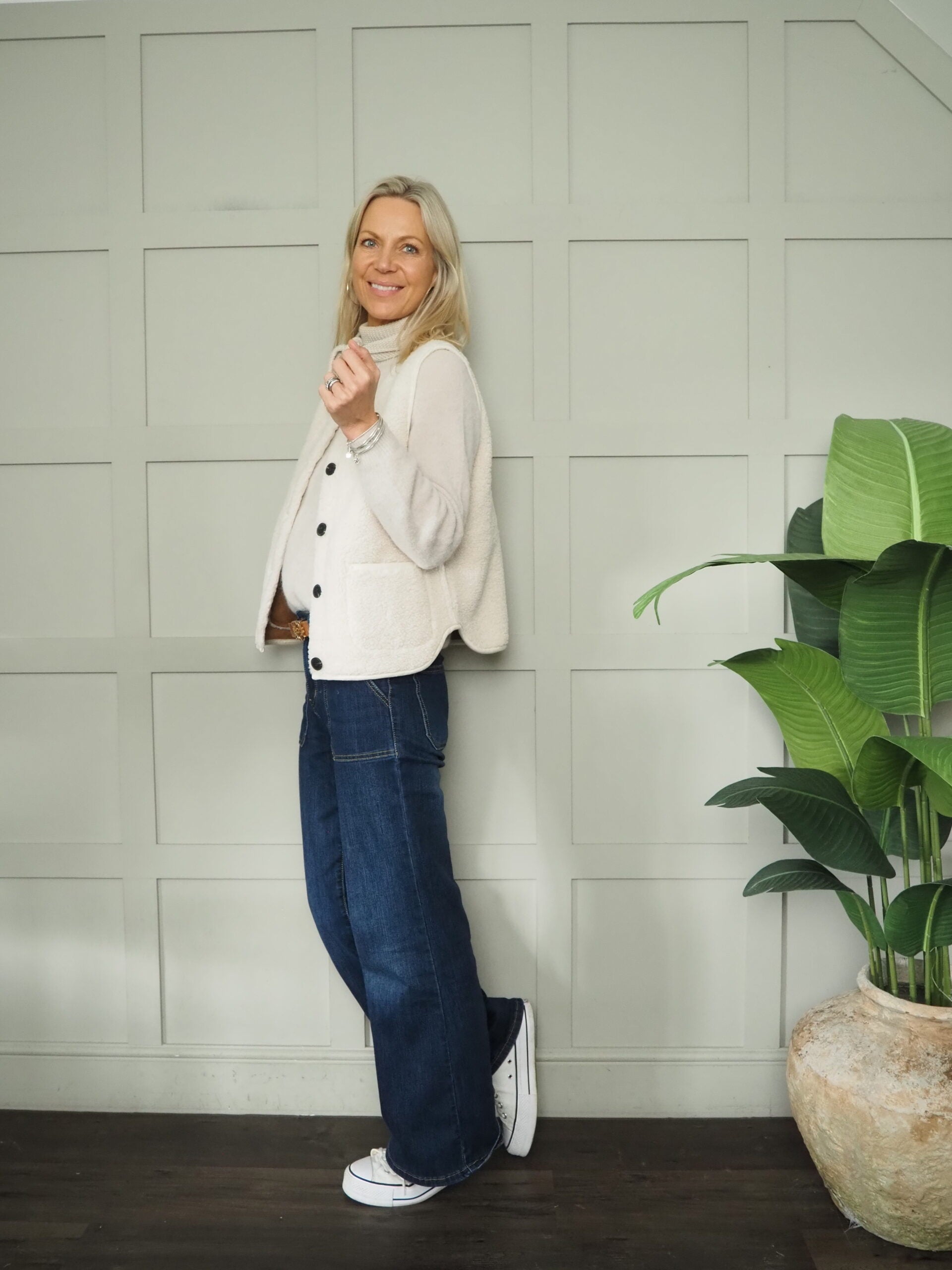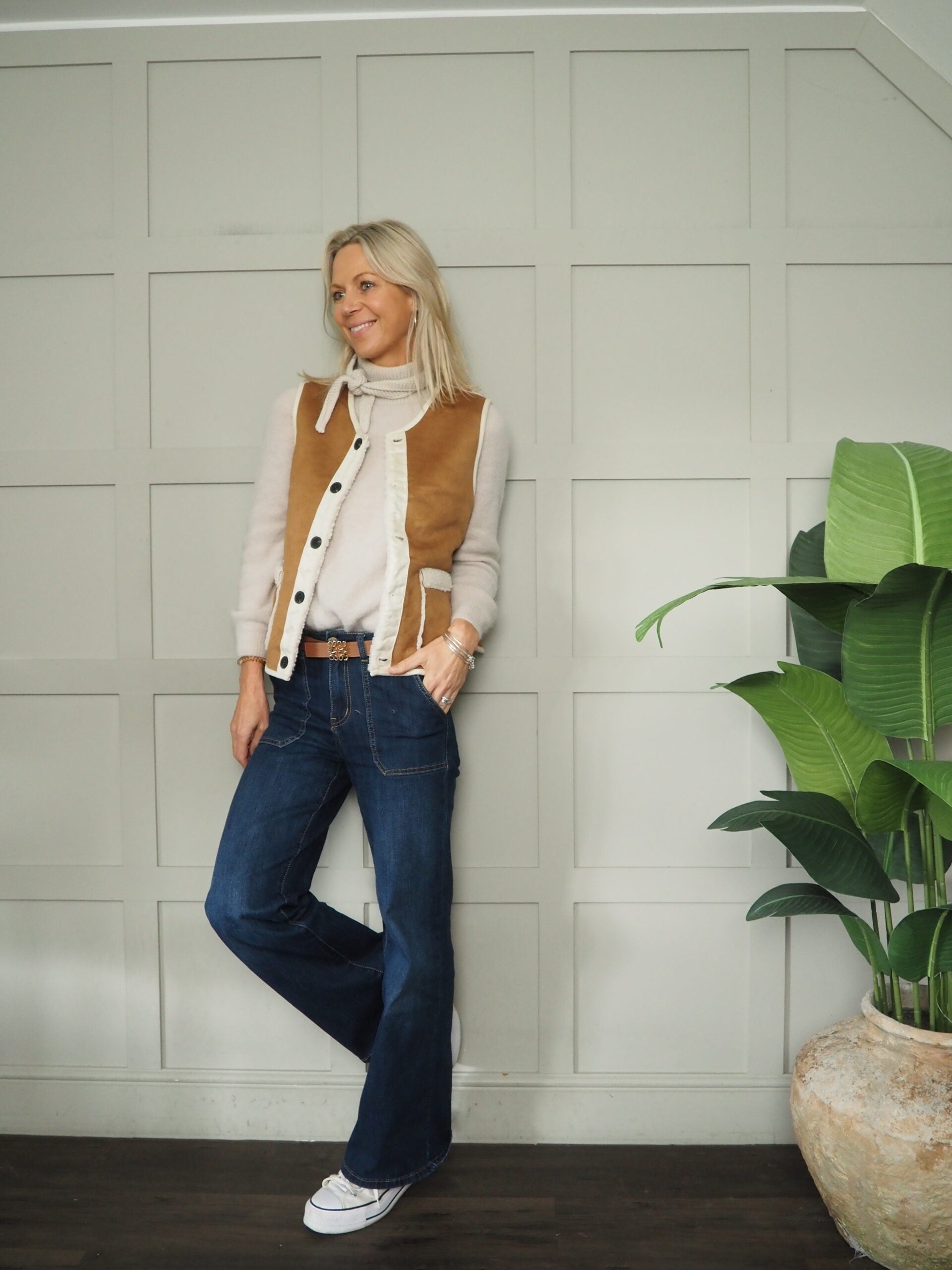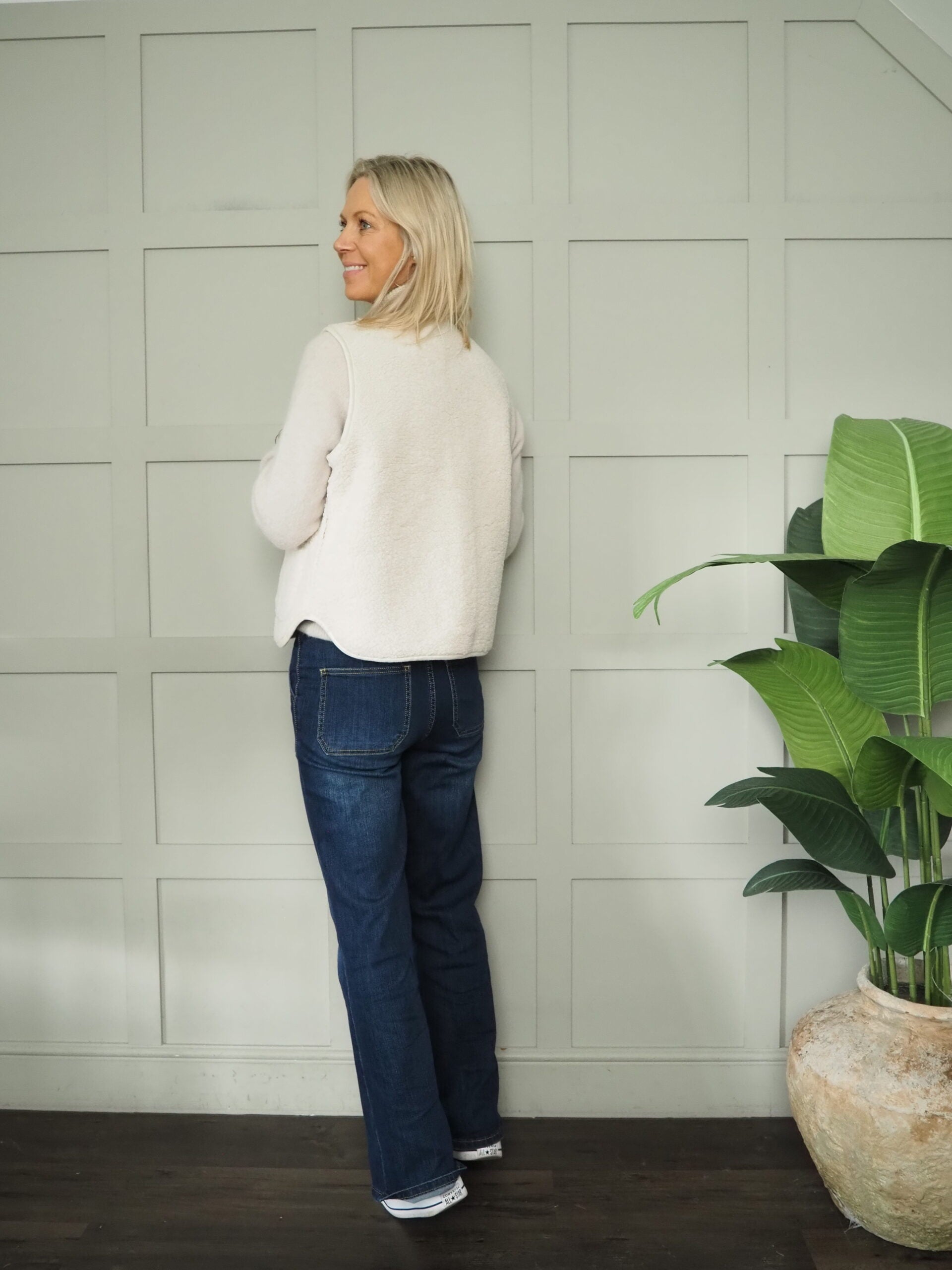This reversible gilet has oatmeal faux shearling on one side and faux suede on the other giving two different looks. A super useful layering piece which can be worn under jackets and blazers and over blouses and knitwear. It has button fastenings a round neckline and square front pockets on both sides.