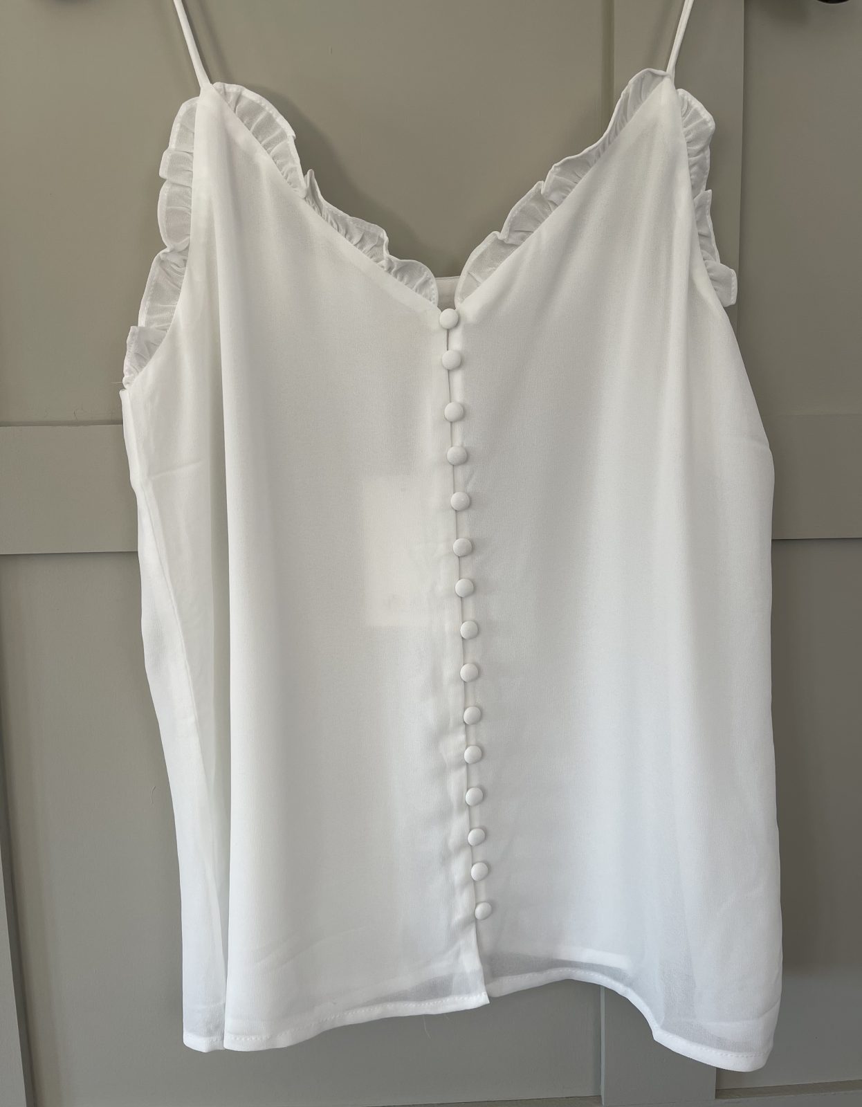 Gorgeous lined camisoles with a beautiful ruffle and button up front. These have spaghetti straps and a stunning finish. So super cute and very useful! They can be layered for spring time or worn alone when summer arrives.