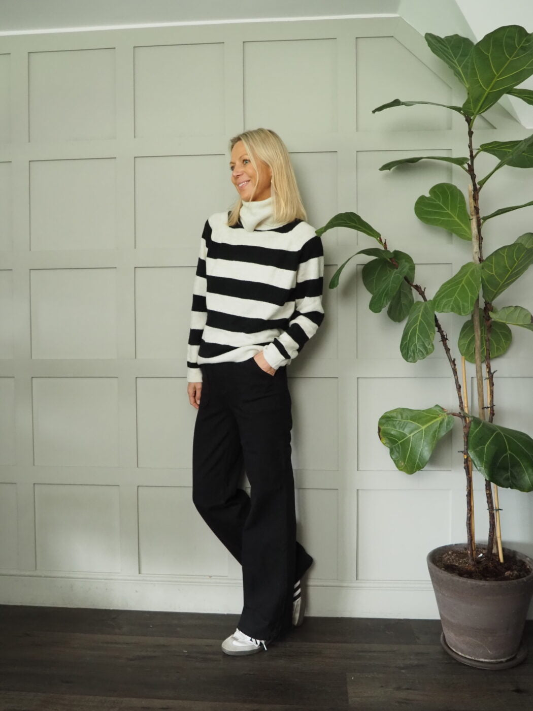 Black worn with the Henrietta Striped Roll Neck Polo Neck Jumper by Saint Tropez – Pink and Brown Stripes, Black and Ecru Stripes