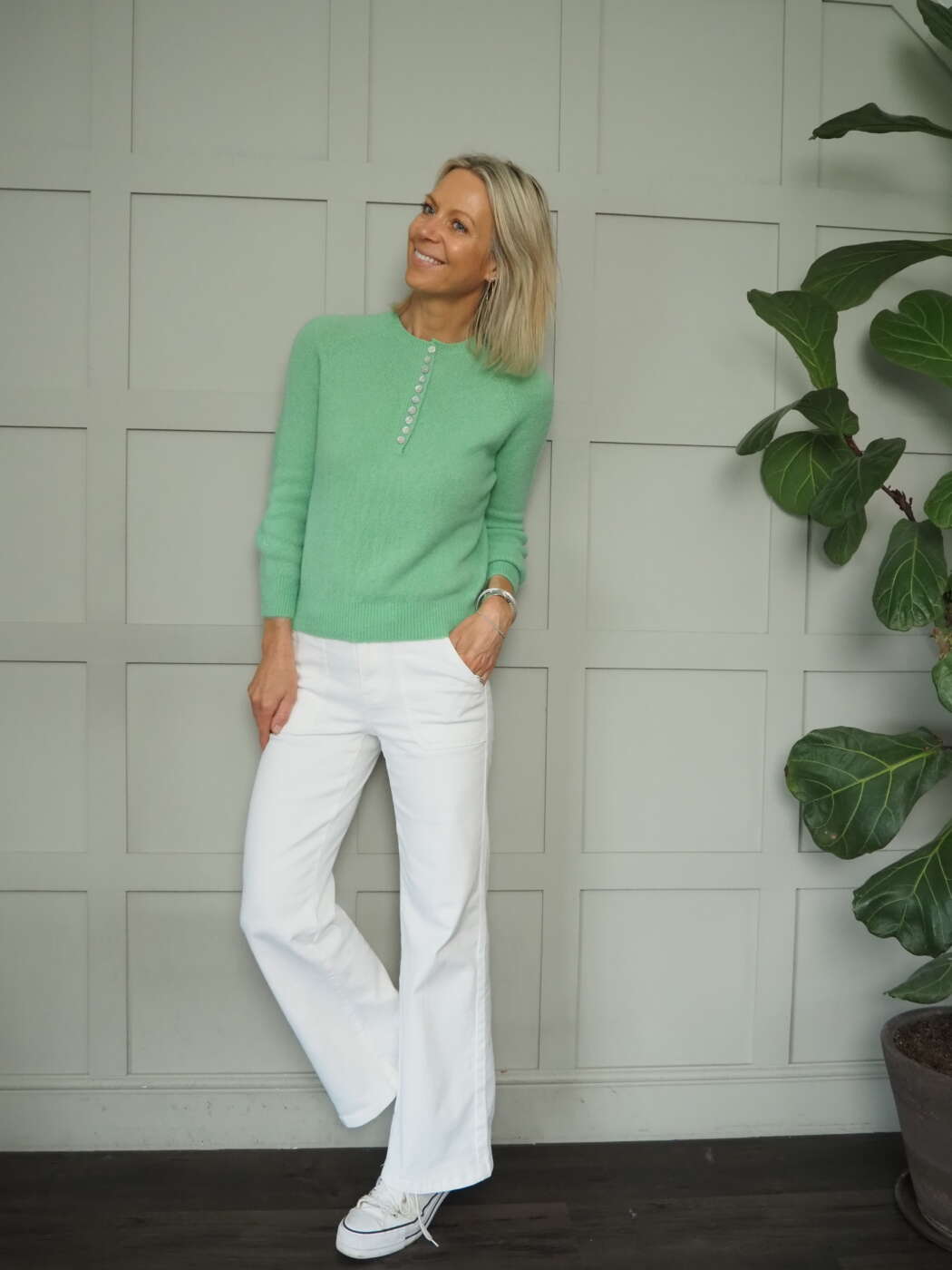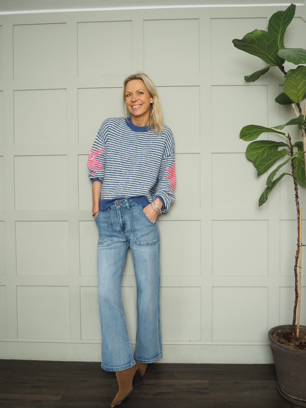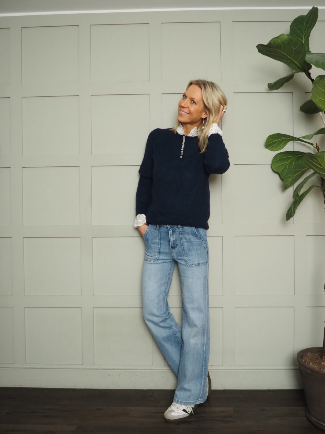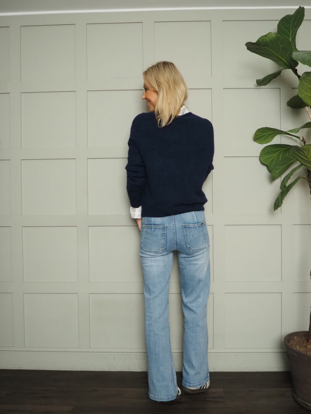 Light Denim worn with the Belle Long Sleeve, High Collared Blouse, Best Seller – 7 Colours and the Boni Soft Knit, Round Neck Jumper, Best Seller – 25 Colours