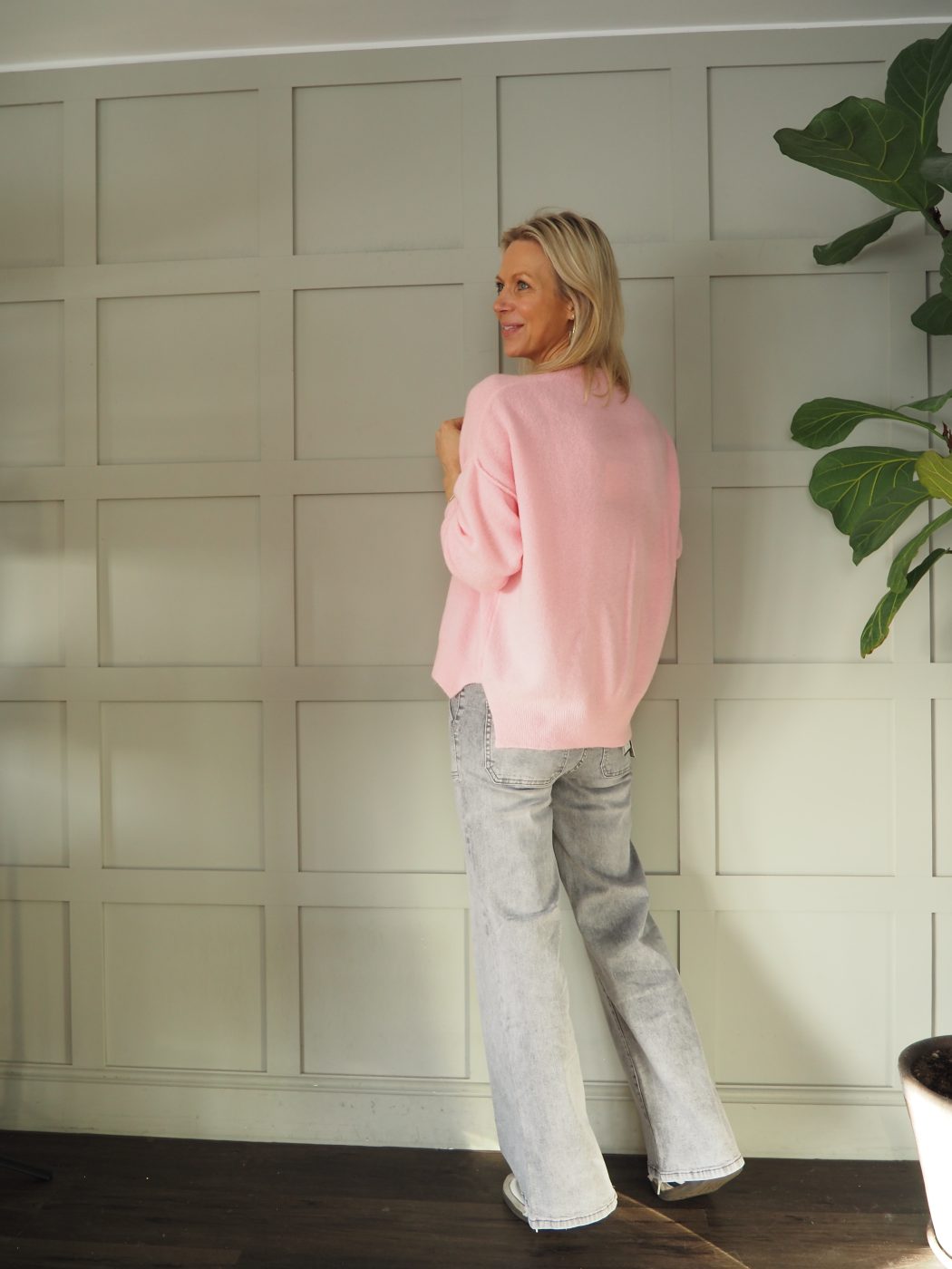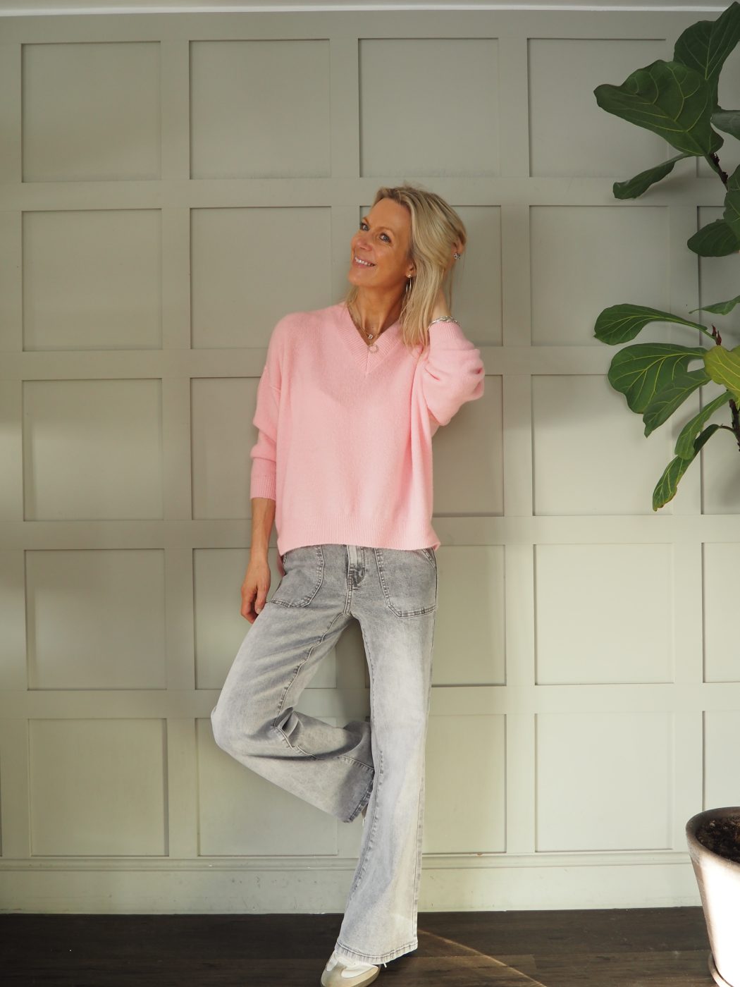 Grey worn with the Lindsey V Neck Long Sleeve Jumper – Nectarine, Pink, Winter White
