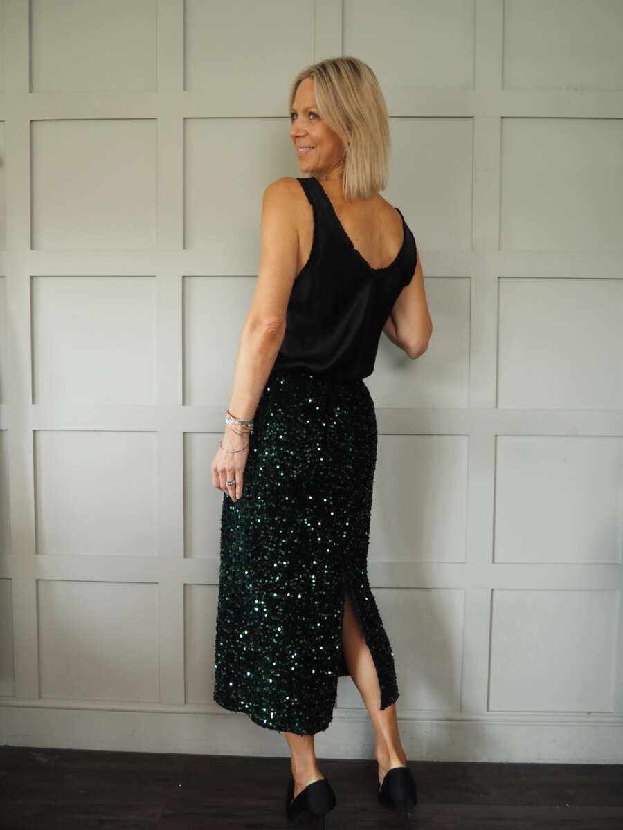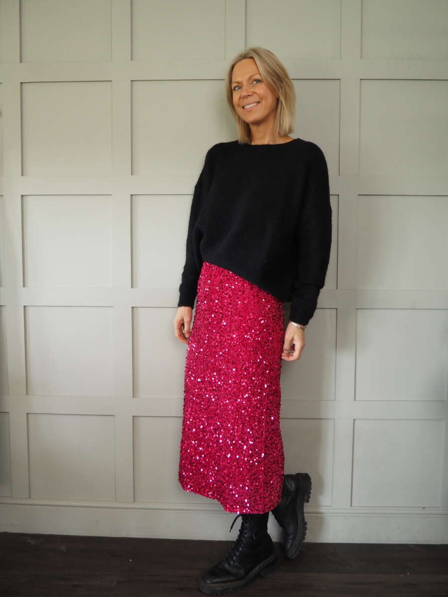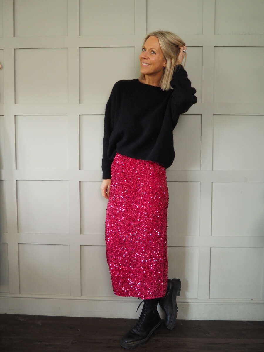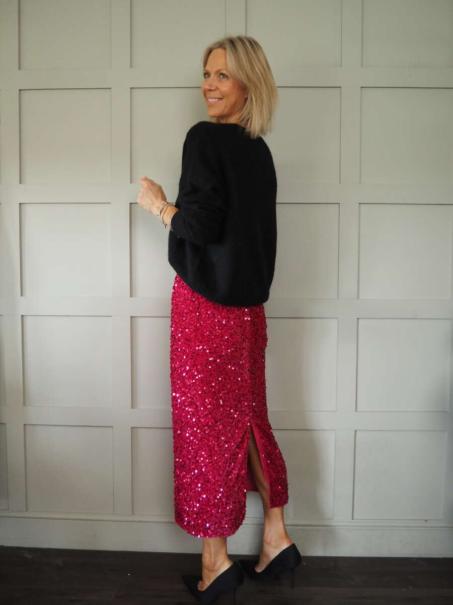 These fabulous sequin skirts are perfect for all year round. They are a fun piece which can be worn casually with chunky boots, a knit & a leather jacket but they are obviously fabulous dressed up for a special occasion, a night out or party season! This statement sequin skirt has a slit at the back and would work on a variety of heights.