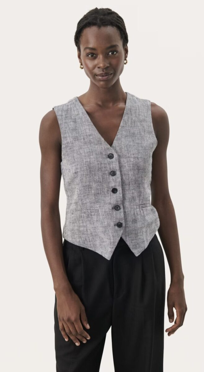 This classic waistcoat in a light linen blend exudes timeless elegance. Featuring a deep V-neckline and button closure, it’s perfect for layering. Pair it with matching trousers or a lightweight shirt for a stylish outfit.