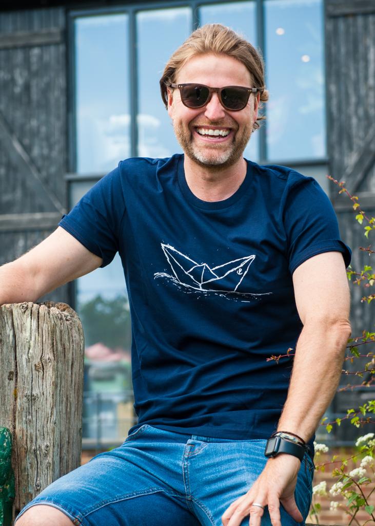 A short sleeved T shirt featuring an origami style boat design on the front. Made from 100% organic cotton it is beautifully soft and comfy. Simple, fun and easy to wear. Looks great with jeans and trainers for a casual look.
