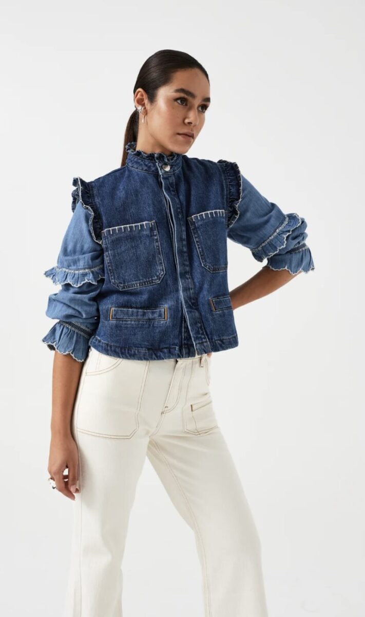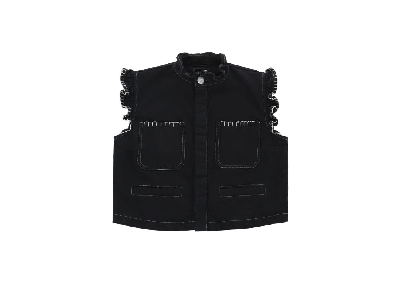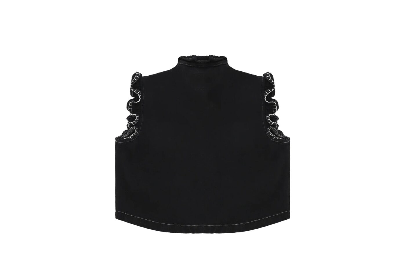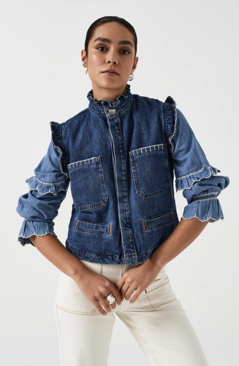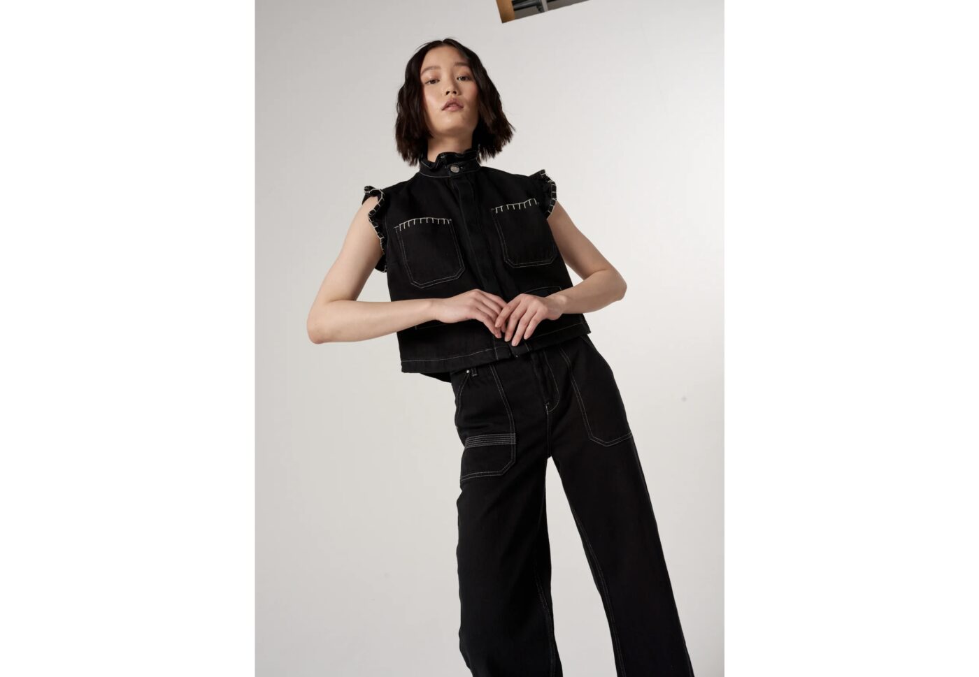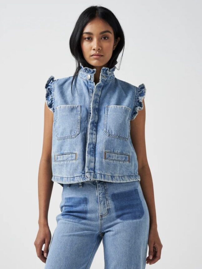 Seventy and Mochi’s signature and best selling waistcoat. It features signature blanket stitching on patch pockets, a frill collar. Pair with the Elodie Full Length Jeans by Seventy Mochi – Pasadena Vintage and Vintage Black or Mabel jeans for the full look and our take on denim suiting.