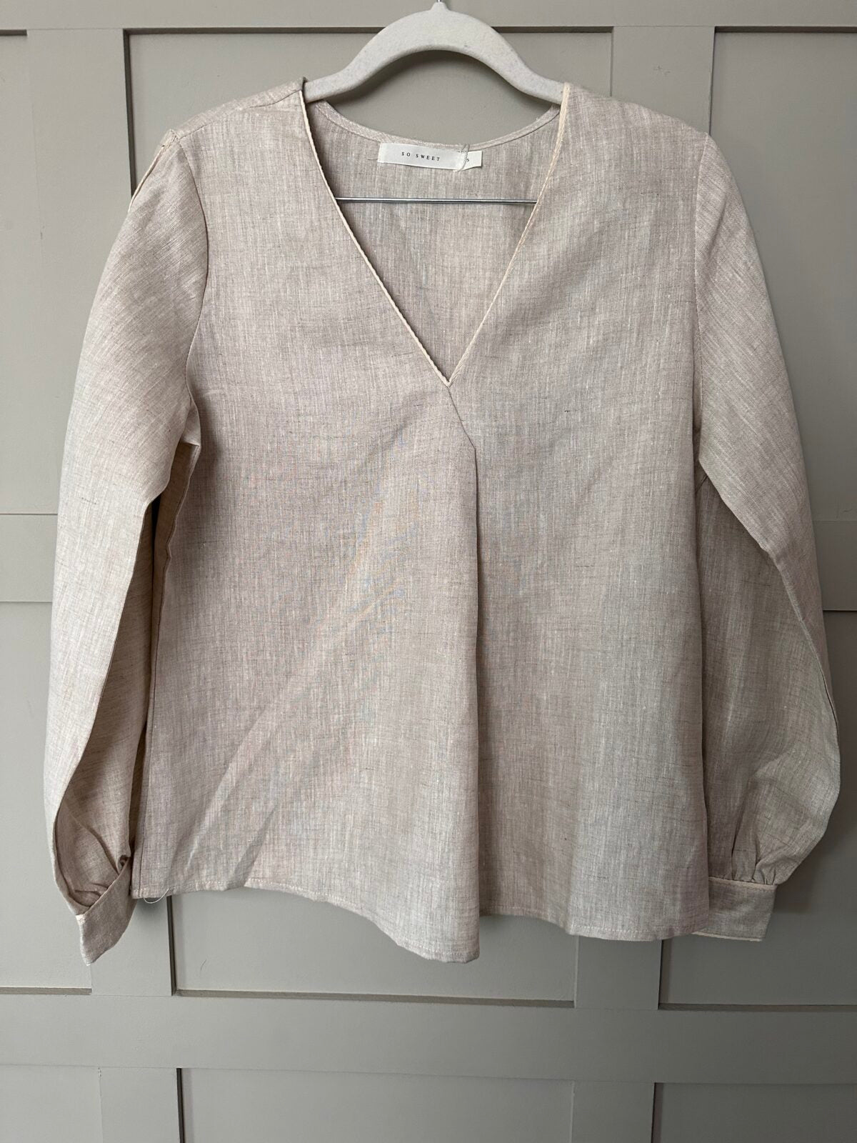 These blouses are 100% linen so will keep you cool in the warmer weather – v necked, long sleeved and classic. Single pleat detail from the v neck down. One button fastening on each cuff.