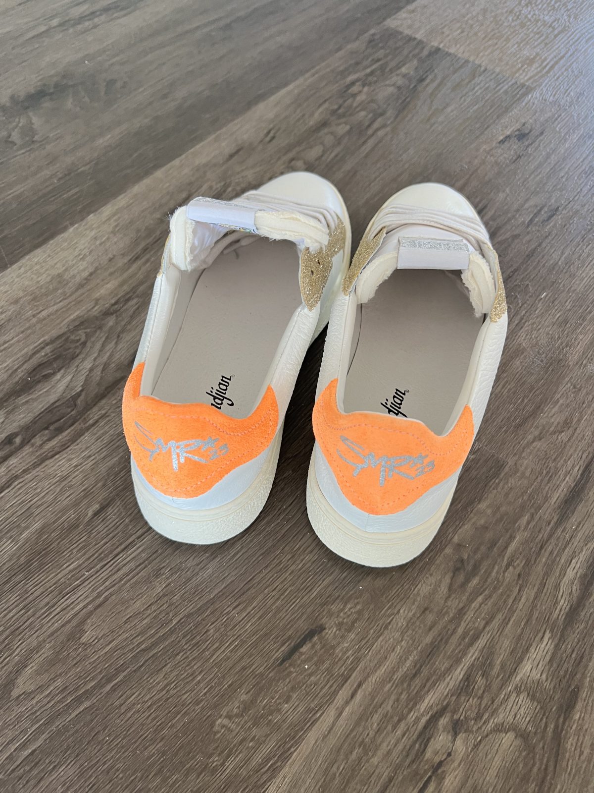 Classic white leather trainers with a gold glitter detail along the lacing and a fun bright orange coloured panel at the back. Cream rubber soles. These would look great with jeans but just as good with dresses and skirts. Super fun and useful, perfect for all year round.