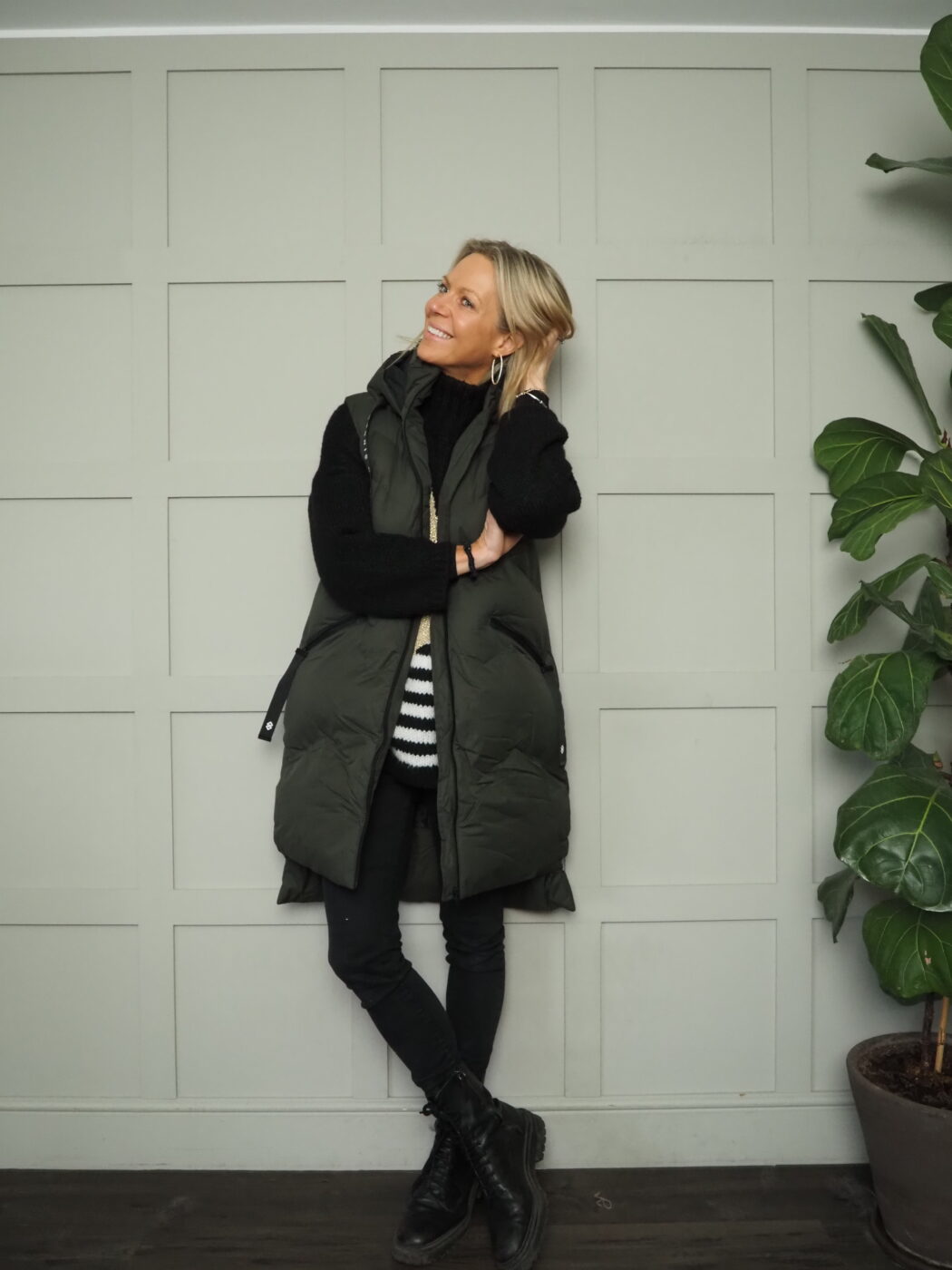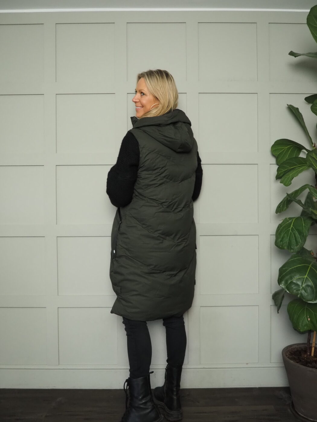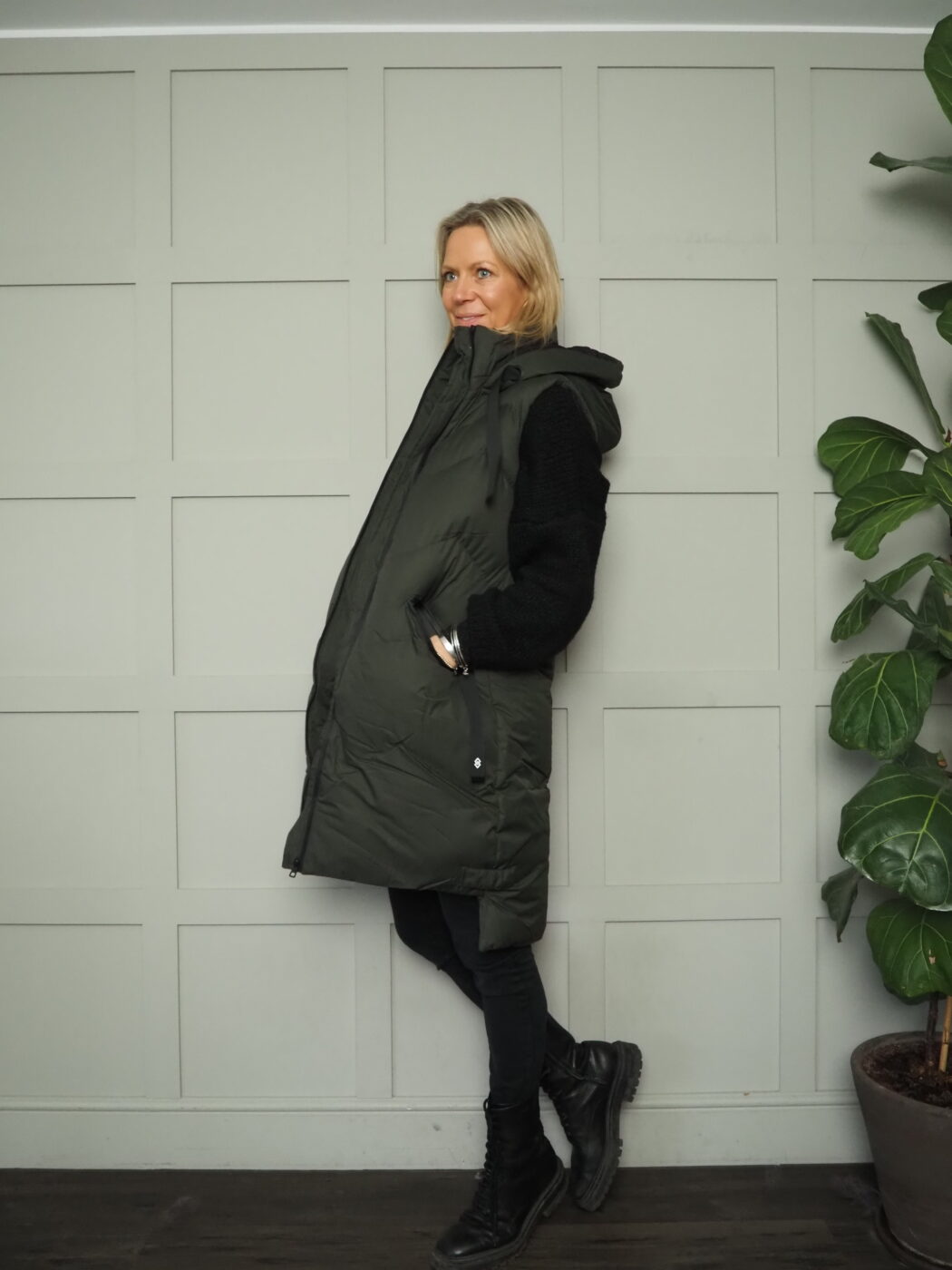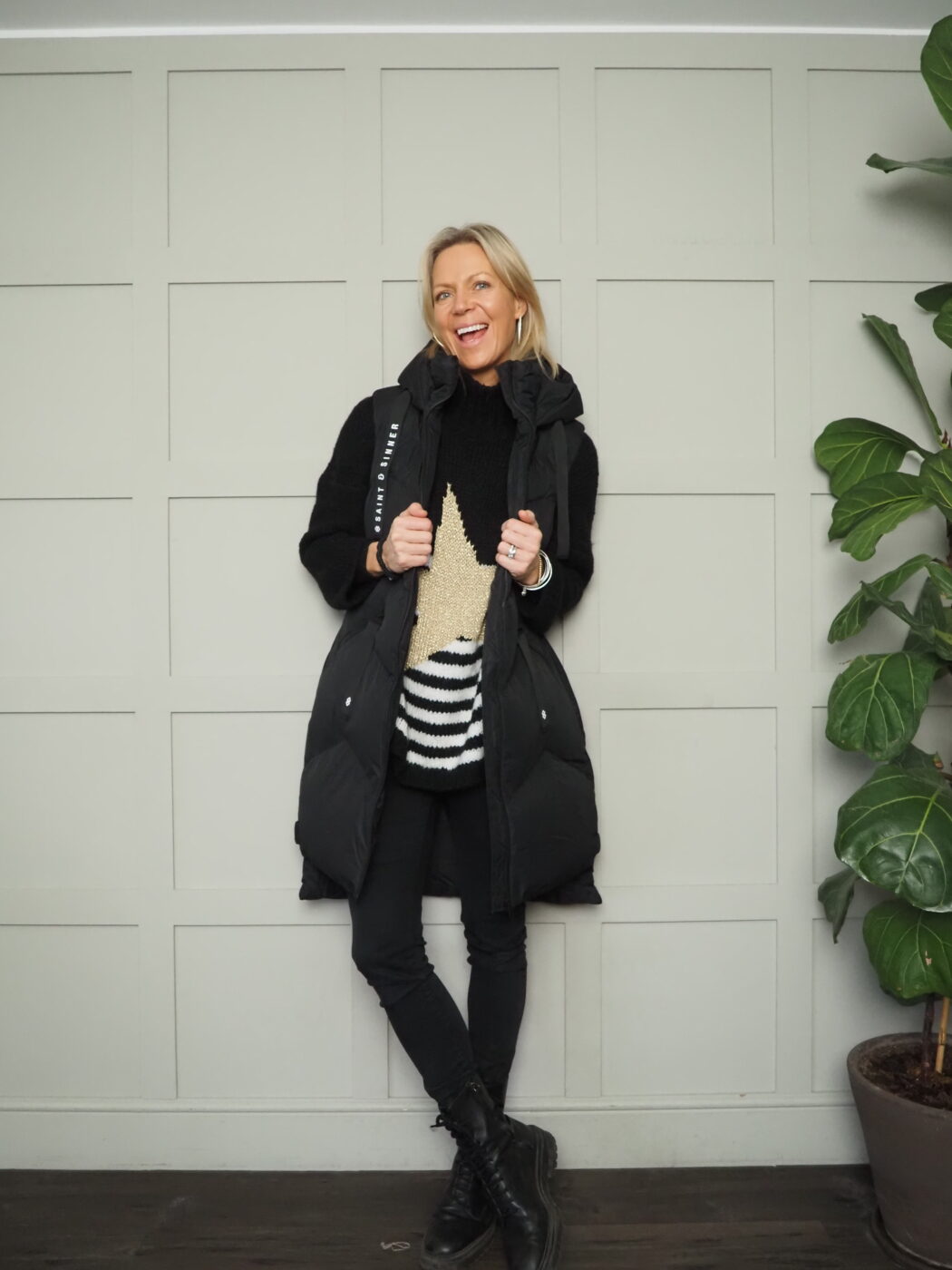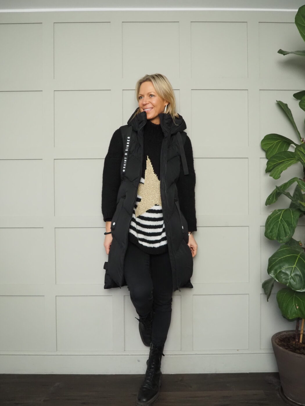 A great puffa gilet which is soft, lined and comfy. Zipped pockets to the size, zip fastening to the front, hood and black and white drawstring branded with ‘Saint & Sinner’.
