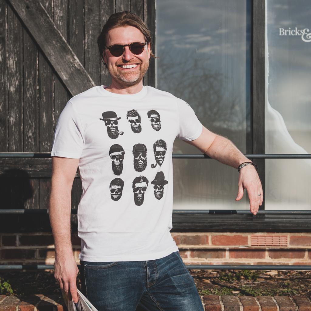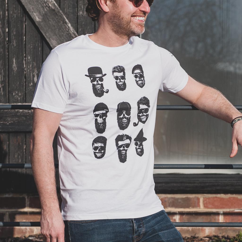 This T-shirt is 100% cotton and features a design of 9 skull hipsters in black. It is a super cool addition to your wardrobe.