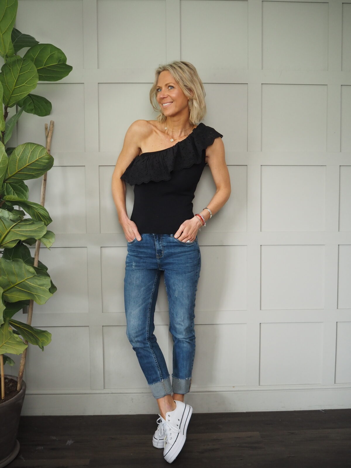 This top is beautiful and a true classic. One shouldered with a see through adjustable strap. Broderie anglaise and scalloped top detail.