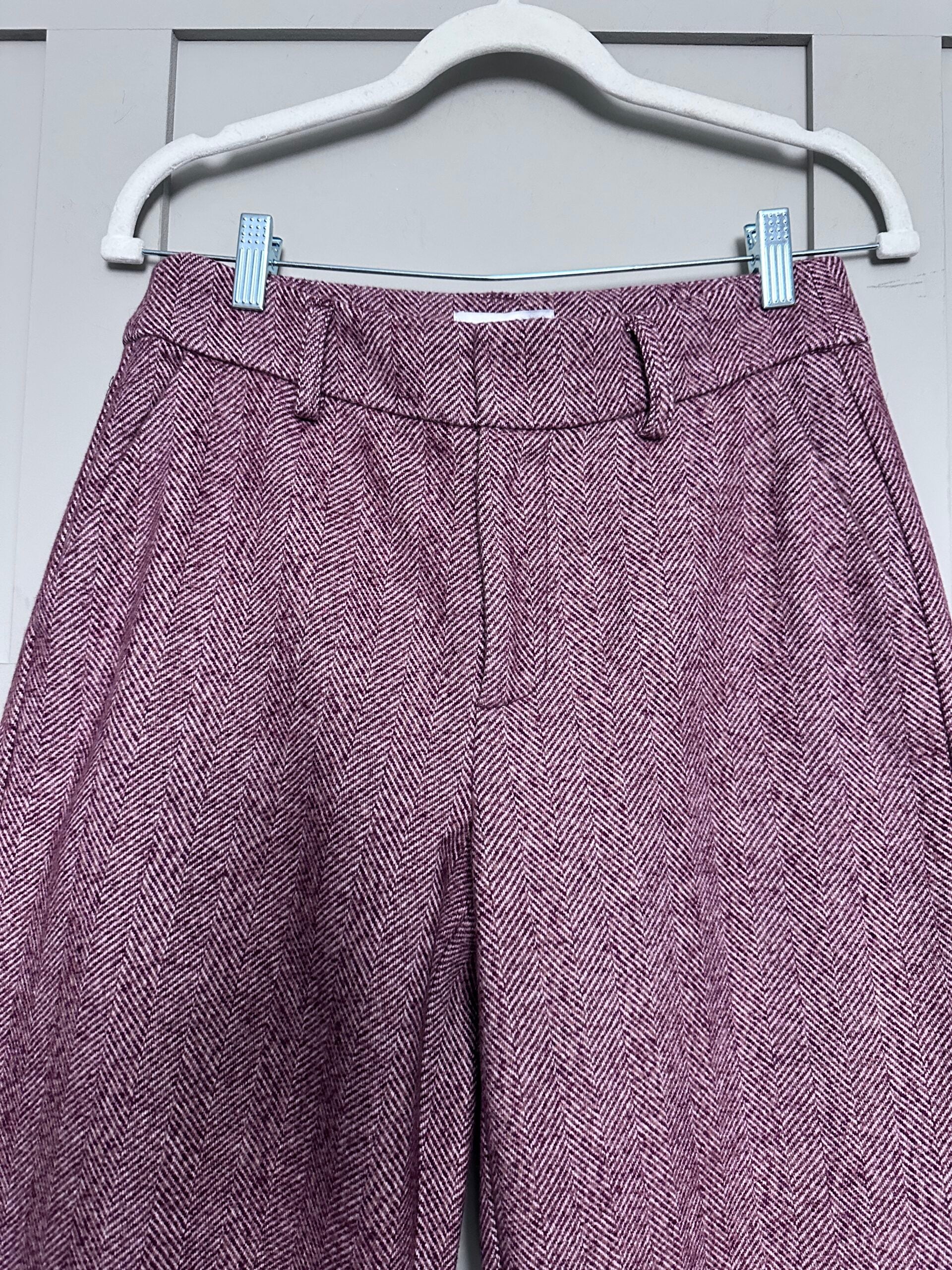 These wide leg, wool mix, herringbone trousers are a fabulous winter wardrobe addition. Super chic, they can be dressed up with heels or worn more casually with trainers or flats. They sit on the waist, are lined to the knee and have side pockets, belt loops, a button and hook and eye fastening and zip fly. They have a single faux pocket at the rear.