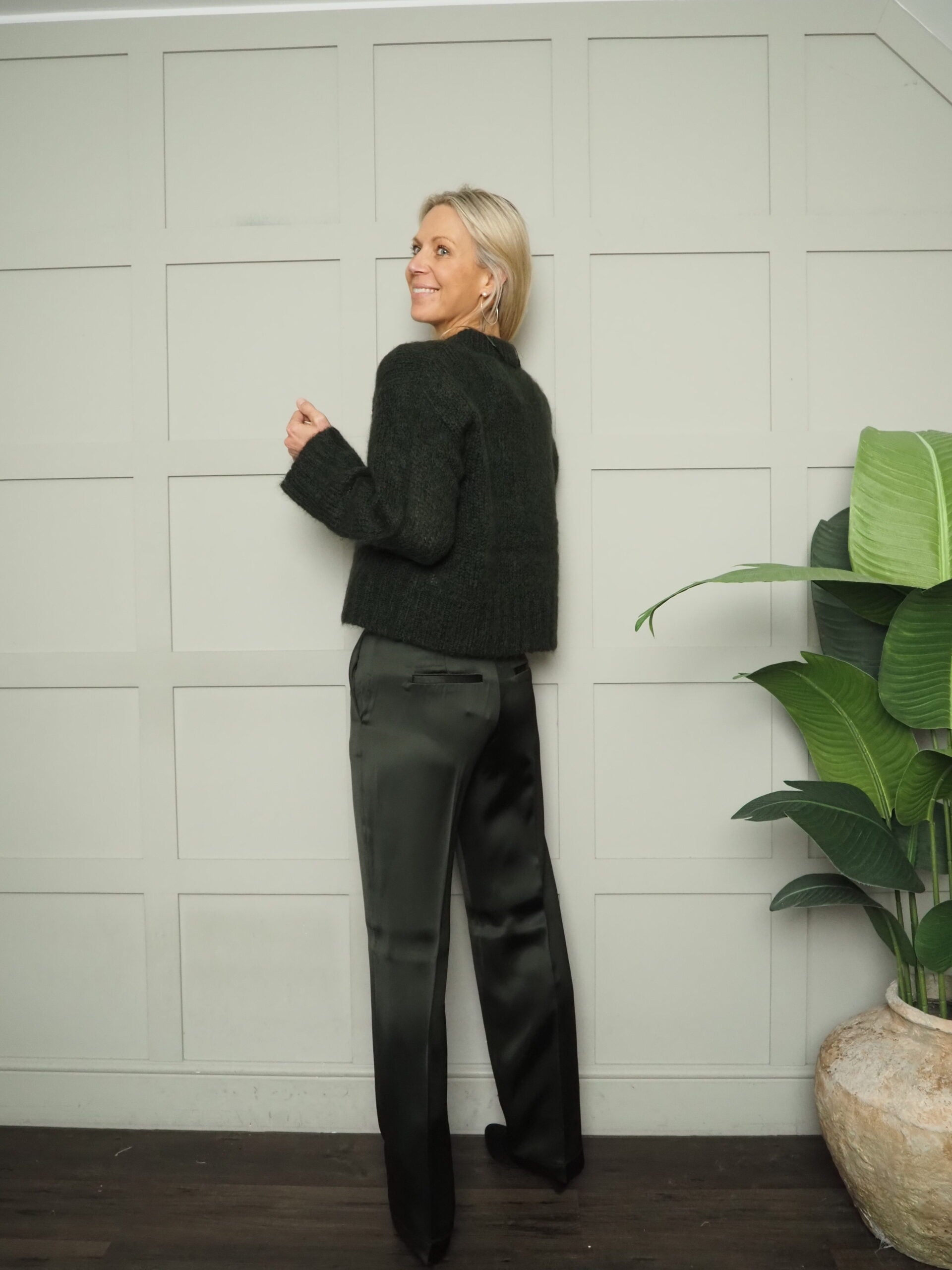 The incredibly chic and very flattering Uma trousers in a heavy viscose satin fabric are perfect for any special occasion, a winter wedding, a Christmas party or a special lunch. They can be worn day or evening and can be dressed up with the matching top or worn more casually with a knit. They look lovely worn with a heel but also work with flats. They sit on the waist and have a hook and eye and button fastening, zip fly, side pockets and faux back pockets.