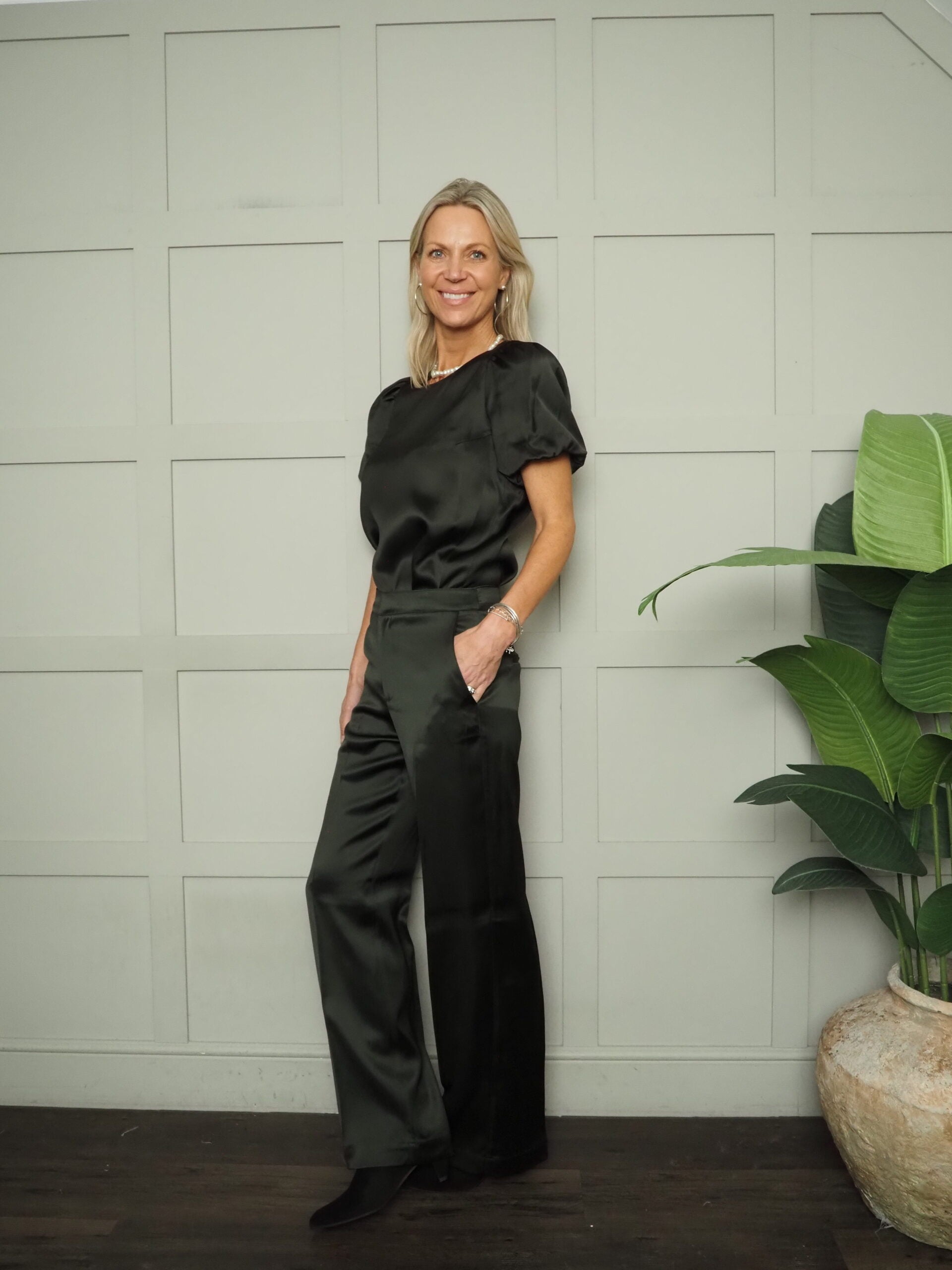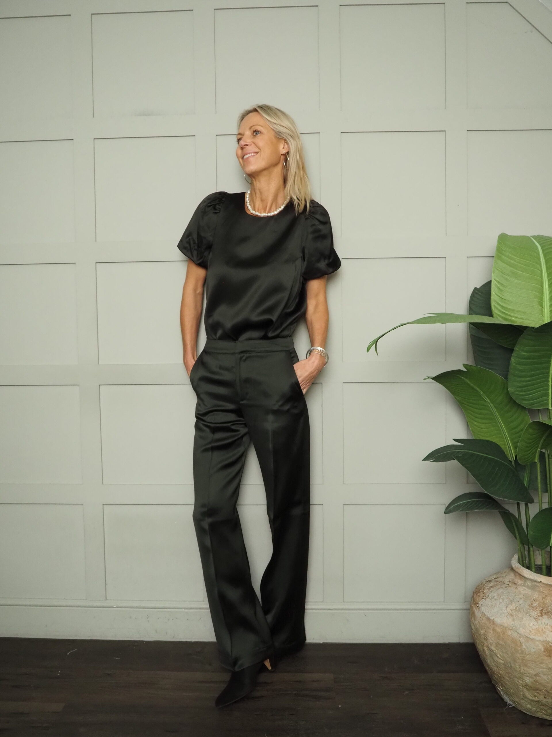 The incredibly chic Uria blouse in a heavy viscose satin fabric is perfect for any special occasion, a winter wedding, a Christmas party or a special lunch. It can be worn day or evening and can be dressed up with the matching trousers or worn more casually with jeans or a skirt. It has a round neckline, zip fastening at the back and feminine bubble hem sleeves. Can be worn untucked or tucked in.