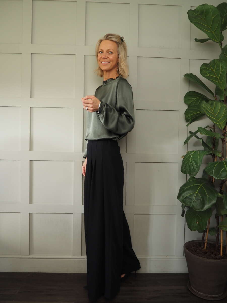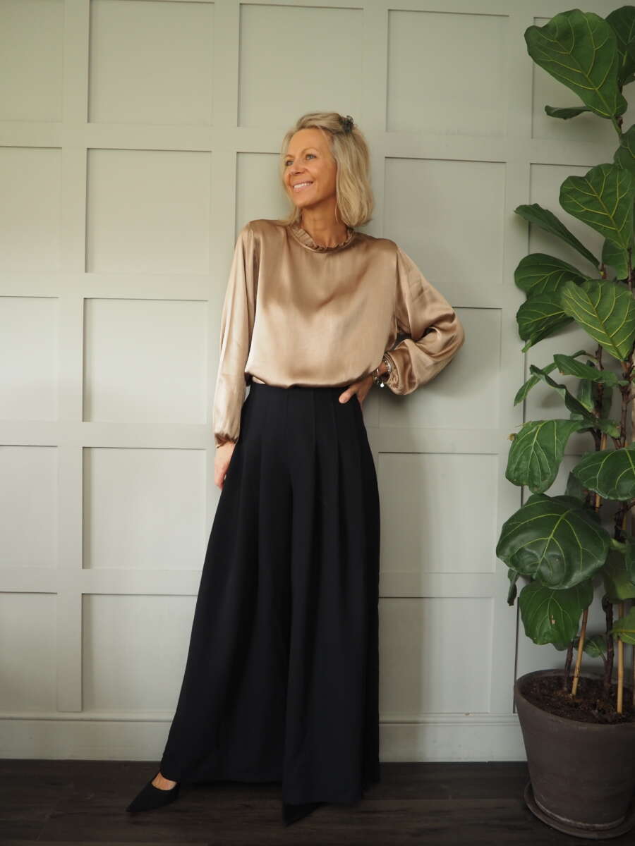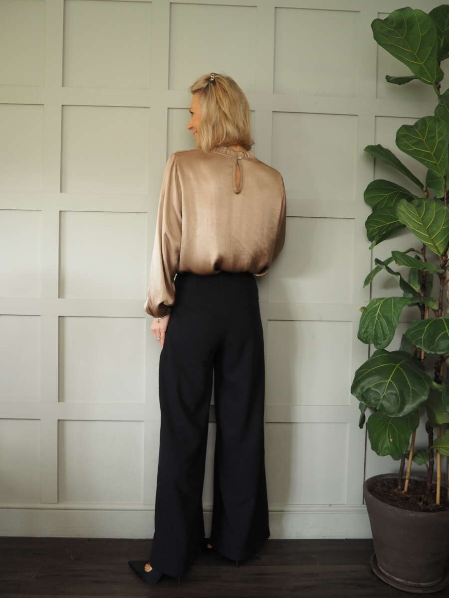 Silky blouse with a pretty frilly high neck collar and one button fastening to the back. Long sleeves and elasticated cuffs.
